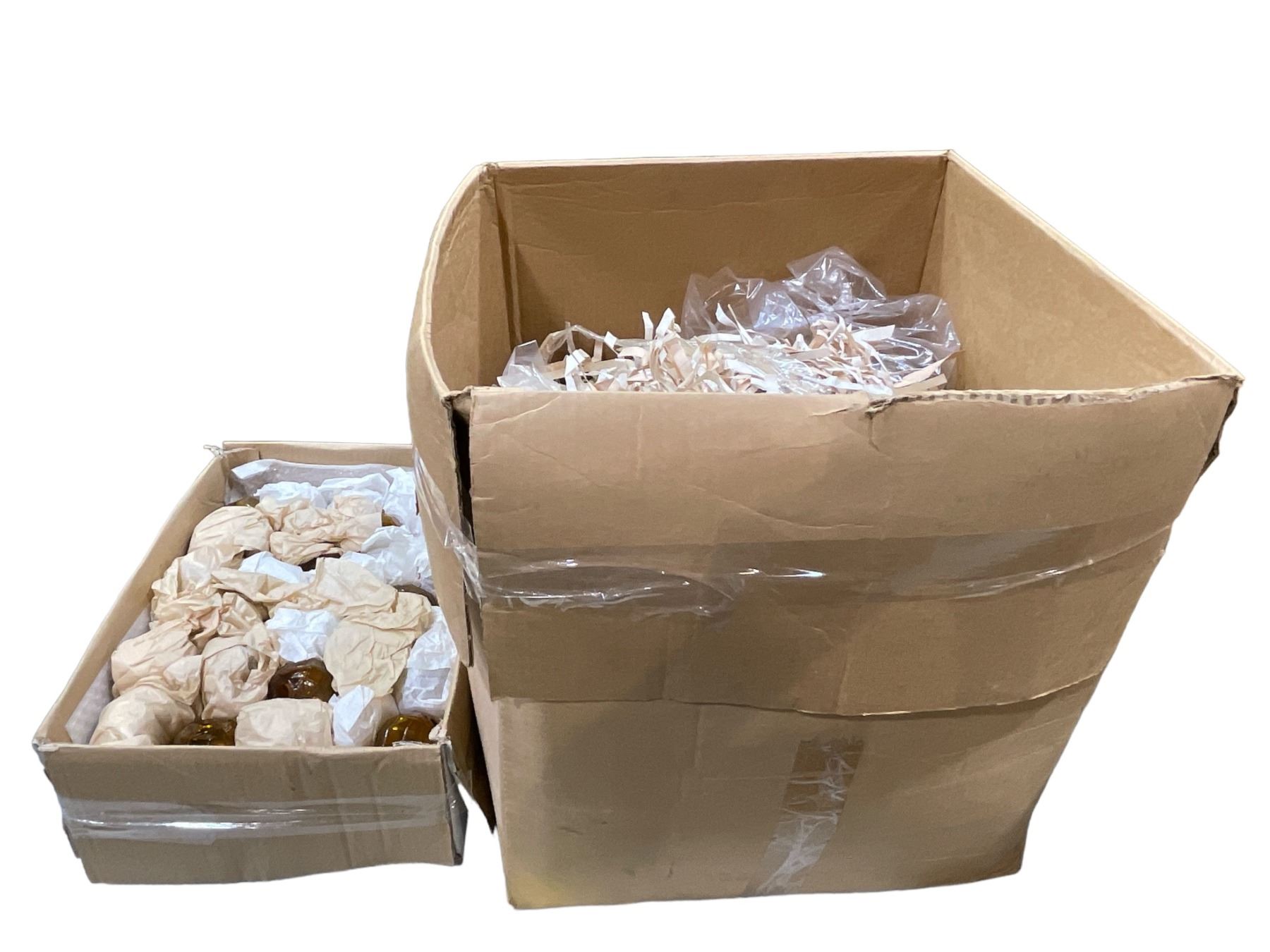 Group lot - x2 boxes of various sized gold coloured vintage glass for light fixtures (Approx 40+ pieces)