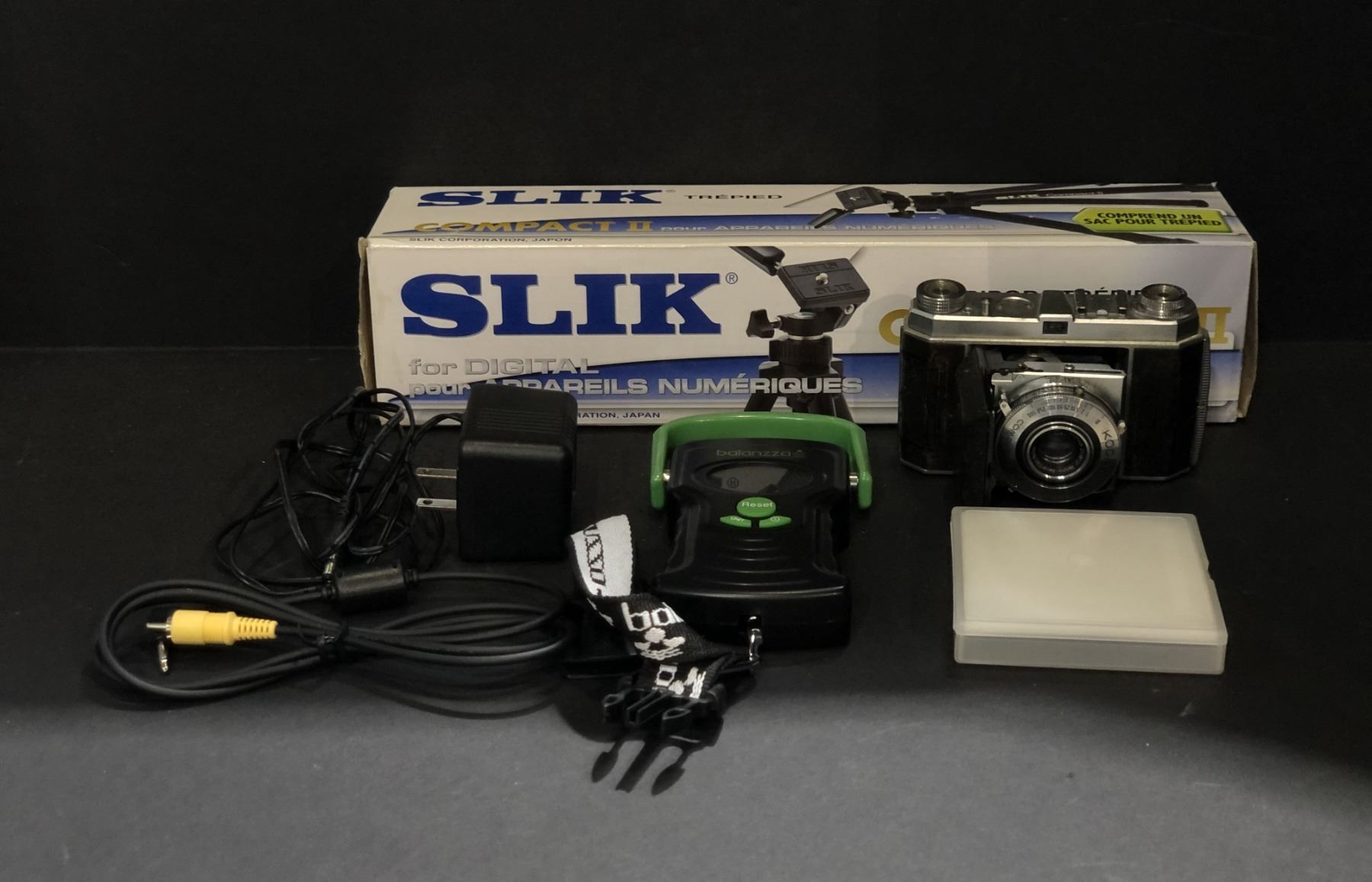 Group misc items including - Slik tripod, vintage Kodak camera, Balanzza luggage scale, etc...