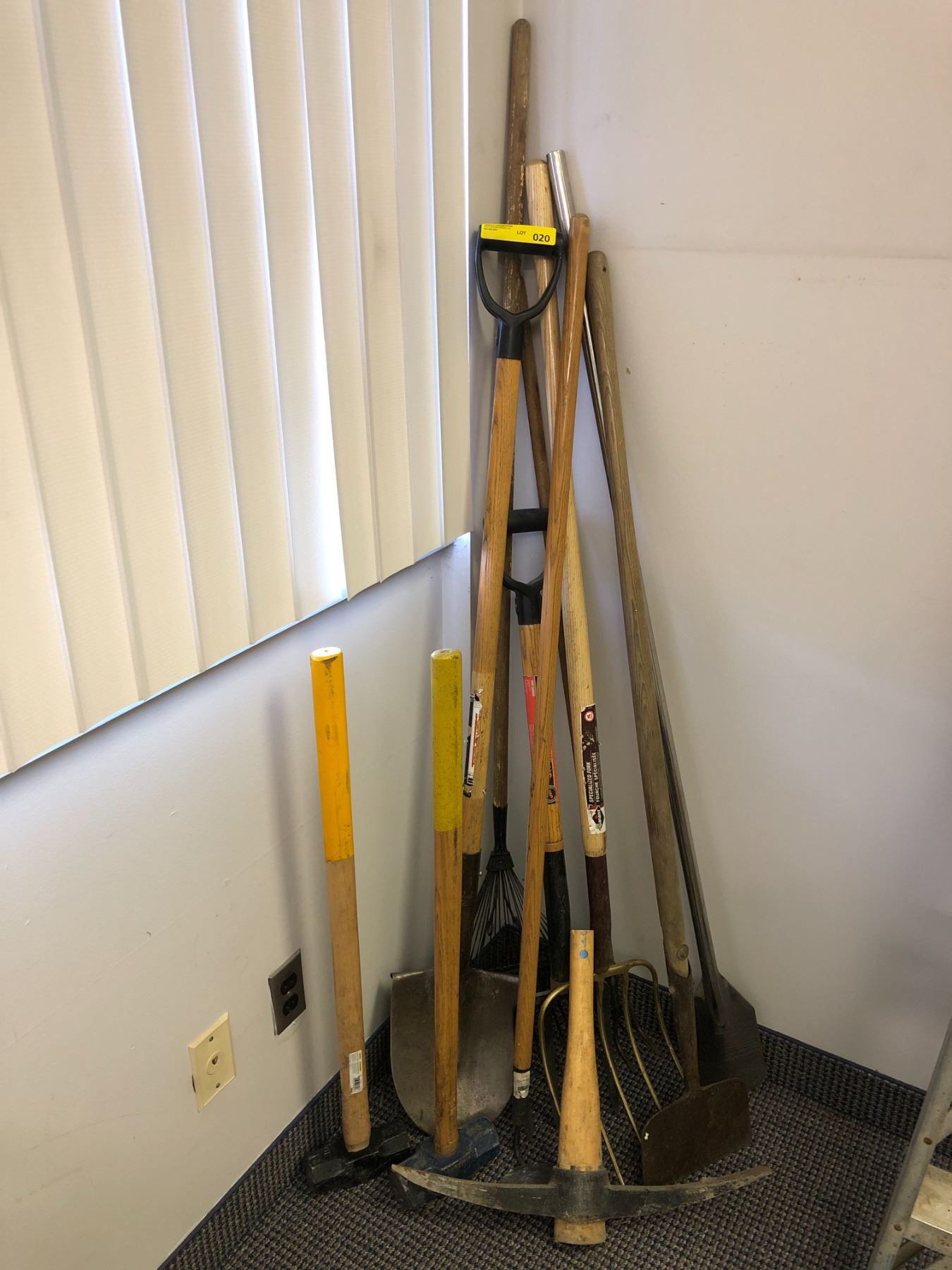 Group of 11 garden tools - shovel/ pitch forks/ sledge hammers/ pick etc.