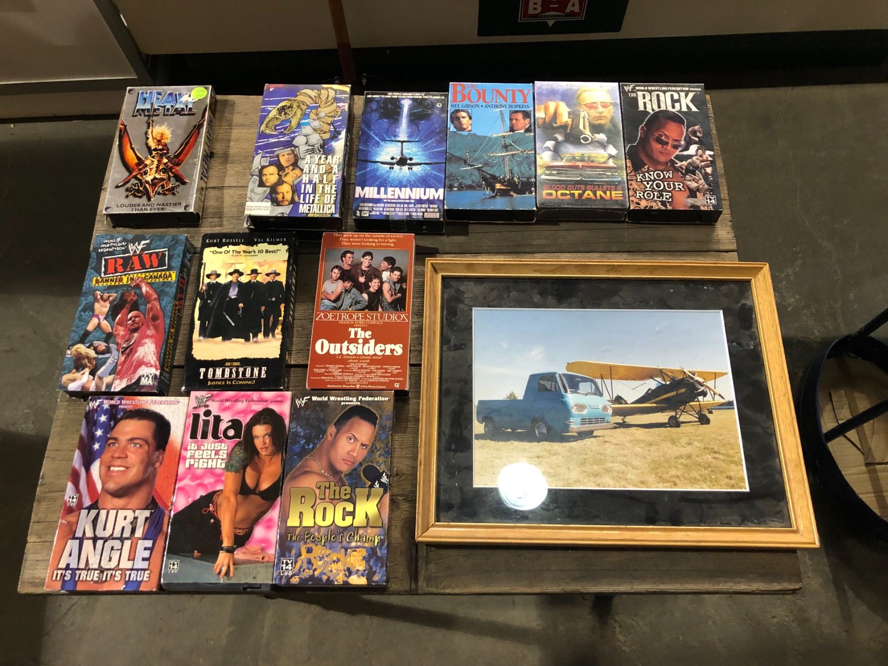 Group of 13 vintage VHS collectors tapes & framed vintage van & biplane picture