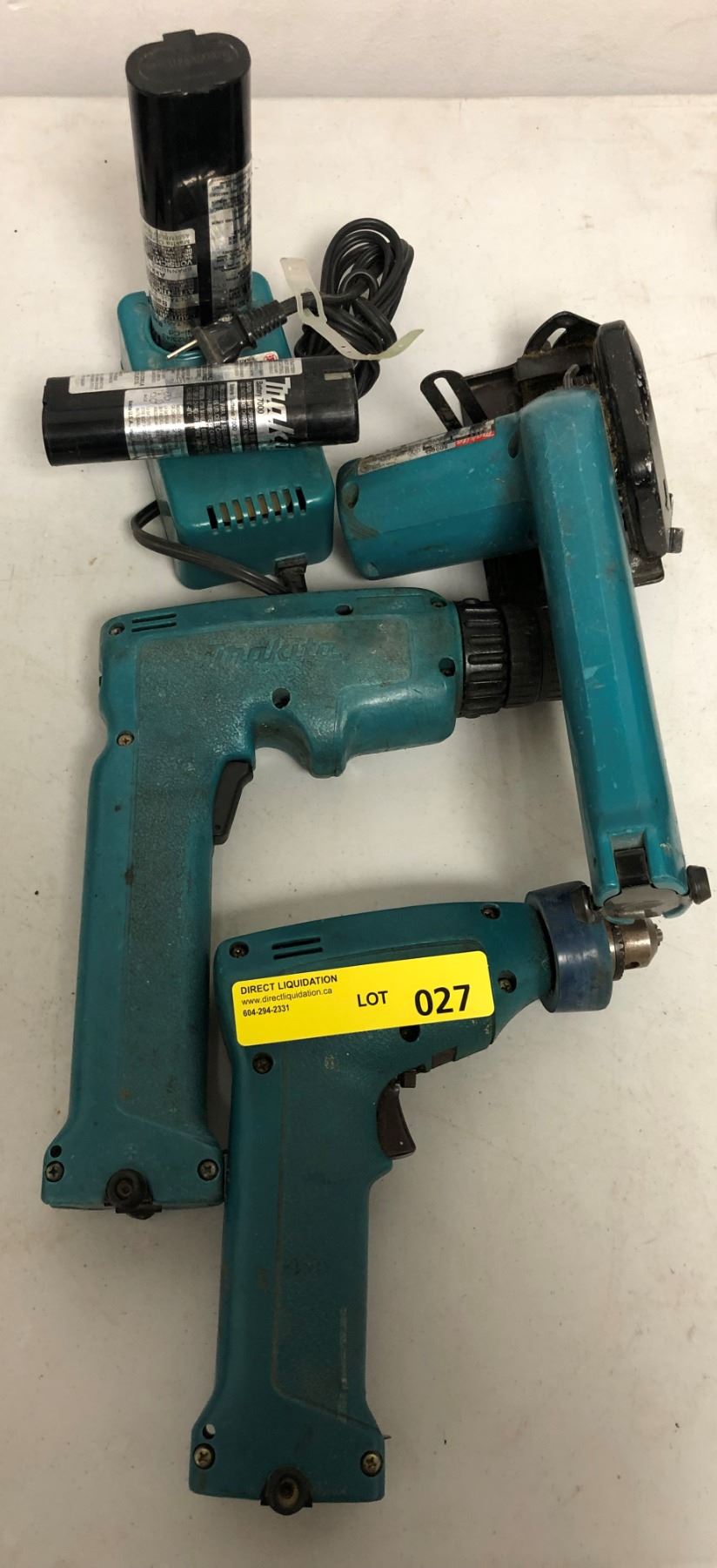 Group of 2 Makita power drills w/ battery charger & 1 Makita saw