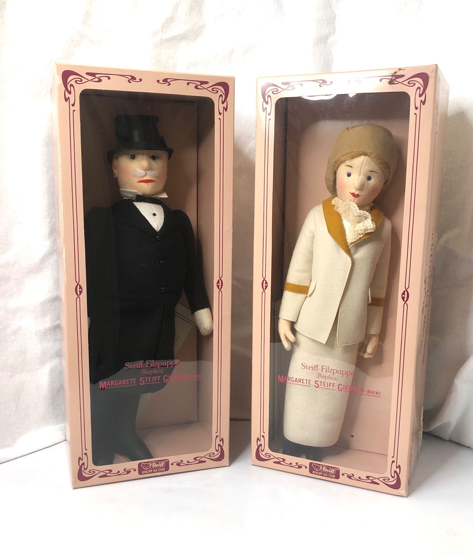 Group of 2 Margarete Steiff 1986-87 collectible dolls w/ certificate - includes gentleman in morning coat (approx 12"tall) & Tennislady Betty (approx 12"tall)"both are limited edition replicas of 3000 pieces"