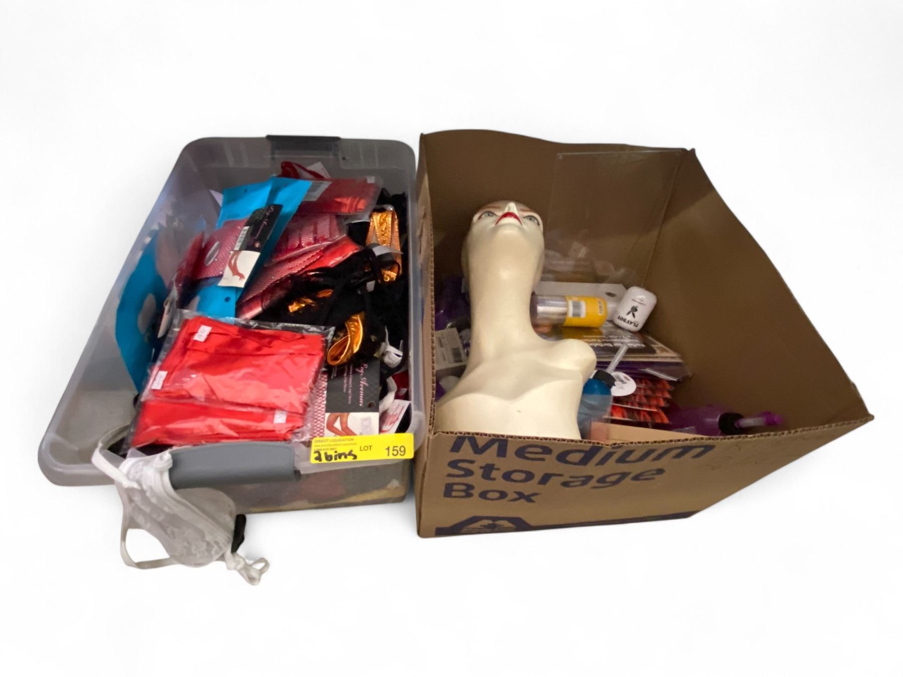 Group of 2 Totes of Misc - Shower Head, Penis Bottle, Mannequin Head, Games, Lingerie, Etc.