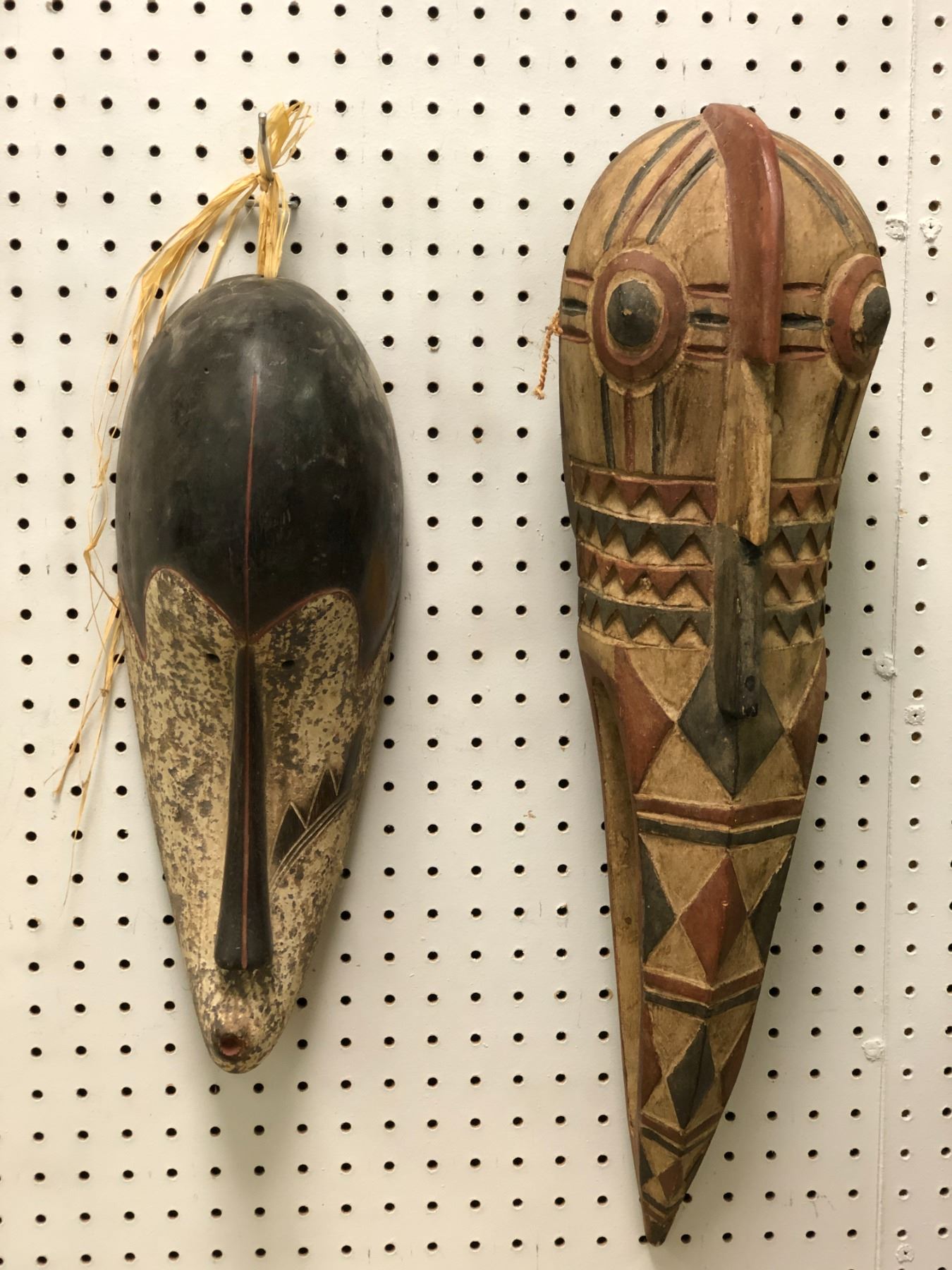 Group of 2 West African hand-carved tribal wooden masks - approx 26" long & 17" long