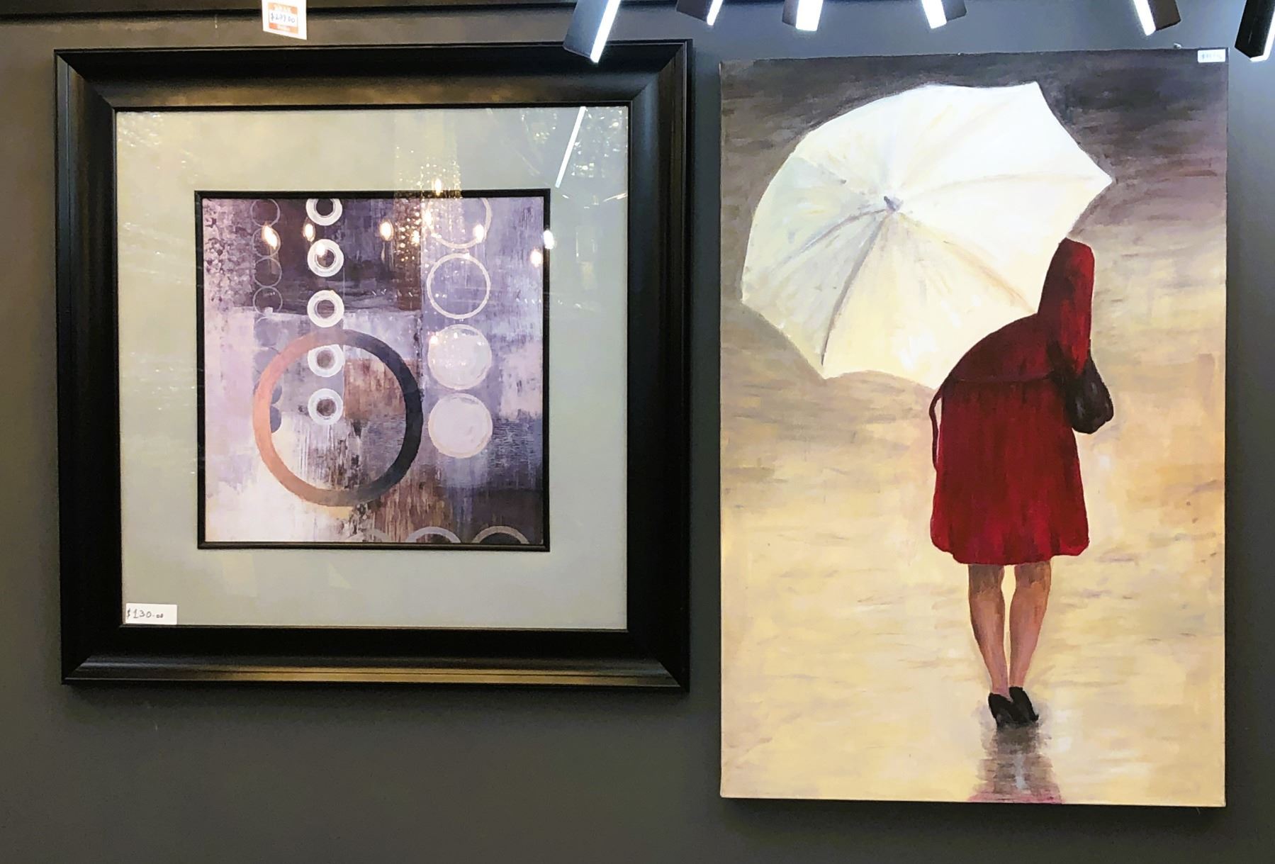 Group of 2 assorted decorative wall hangings - includes women painting paint on canvas (2ft 3ft) & framed wall hanging - (approx. 32in x 31.5in)