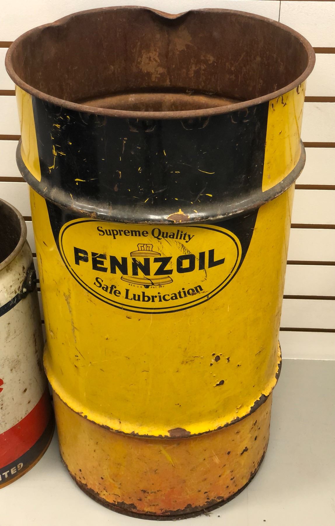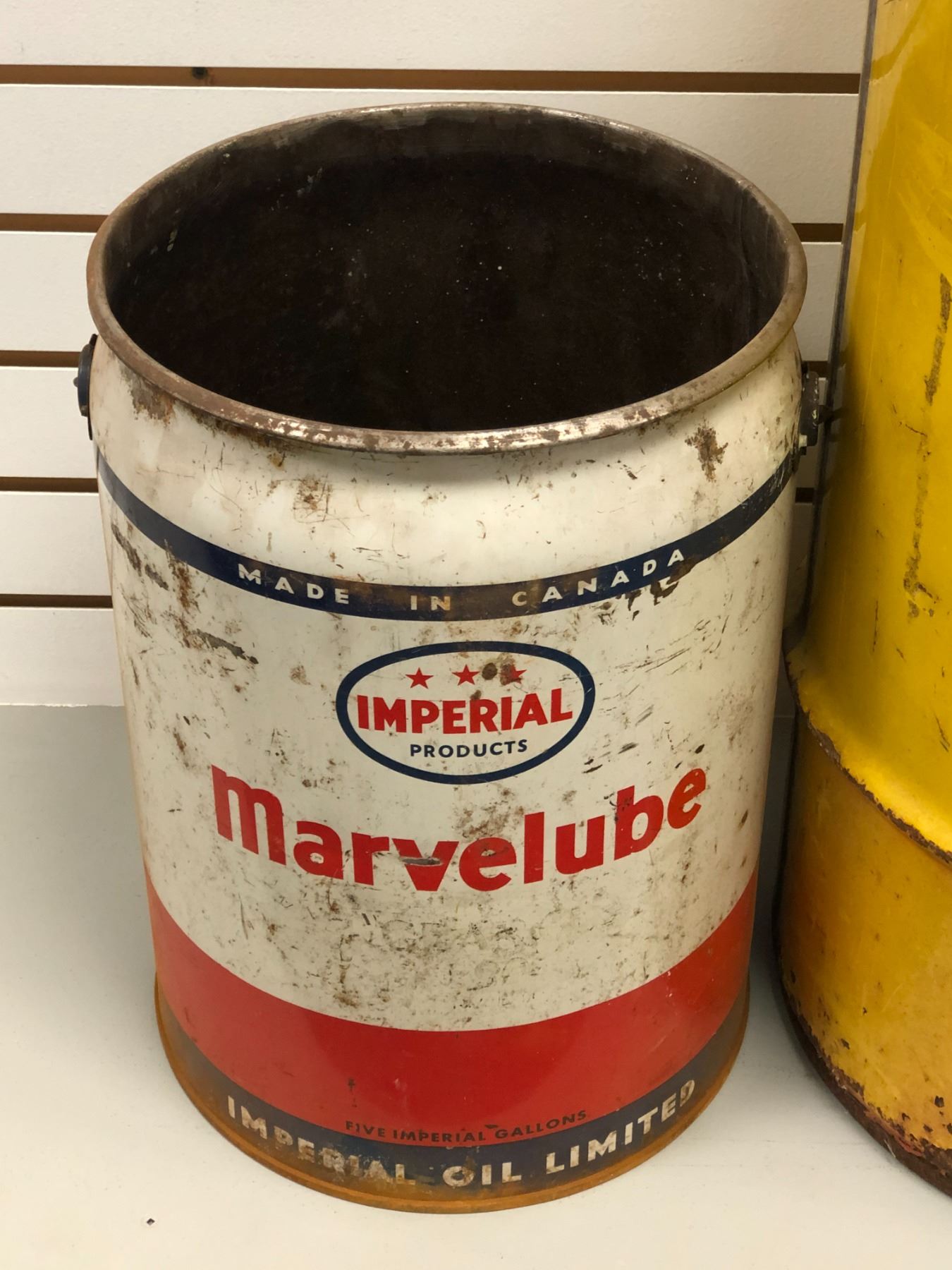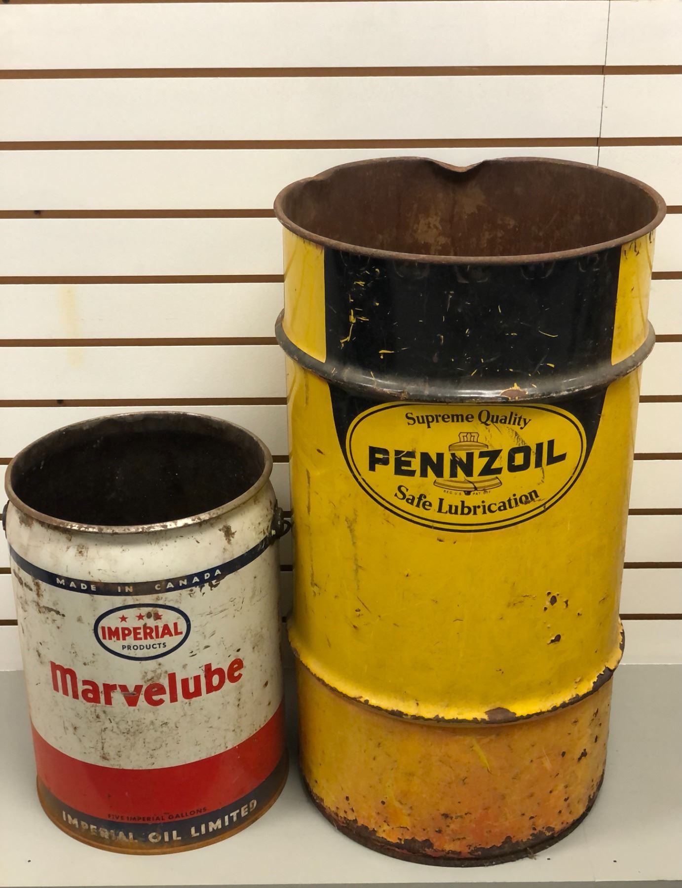 Group of 2 collectible tin cans - Imperial Products Marvelube 5 Imperial Gallons can (15 1/2in tall) & Pennzoil Safe Lubrication can (26 1/2in tall)