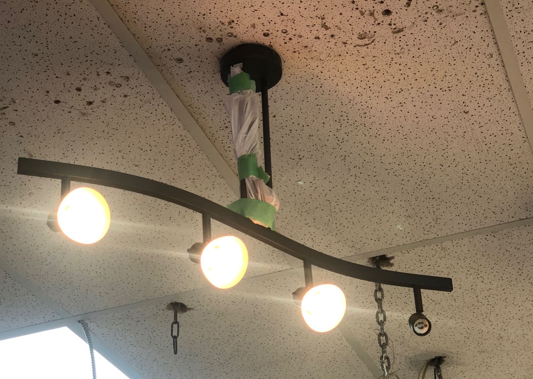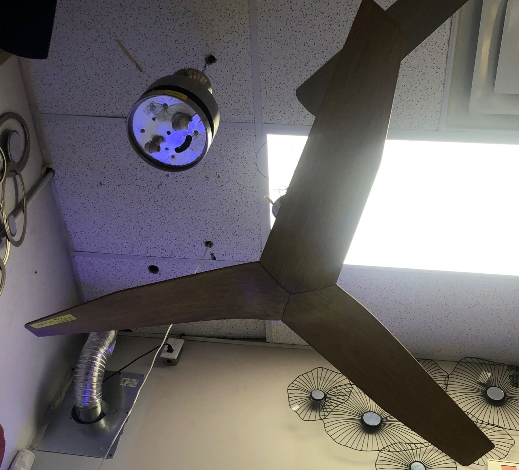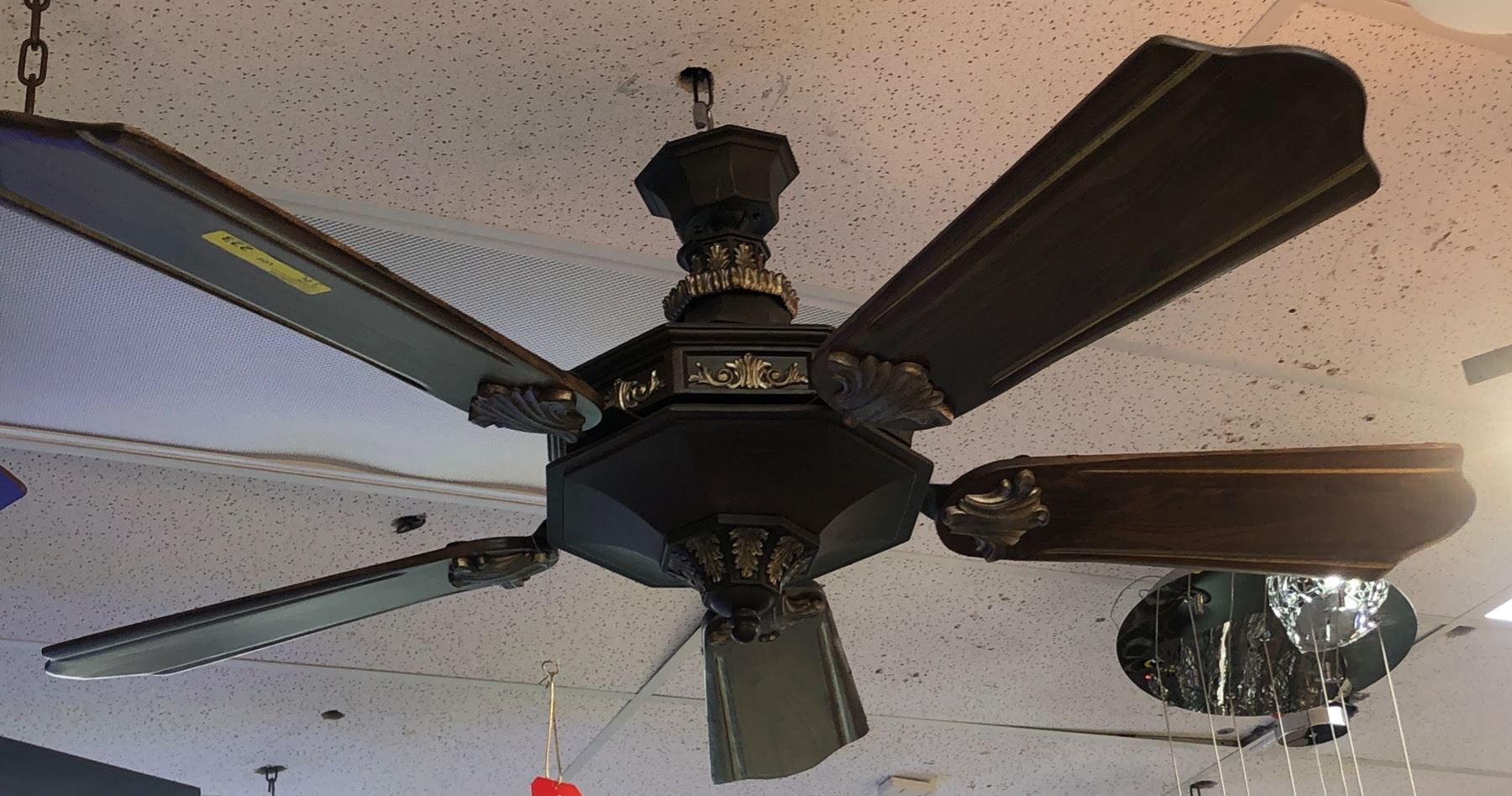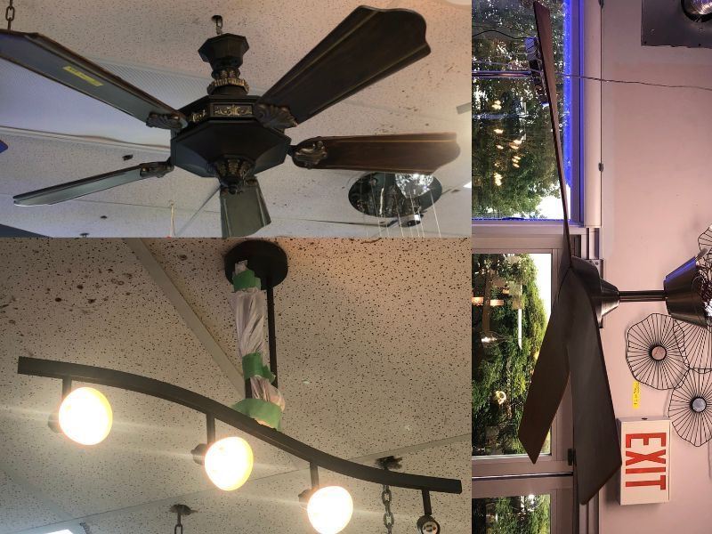 Group of 2 decorative ceiling fans w/ 1 decorative ceiling light (bidder responsible for removal)