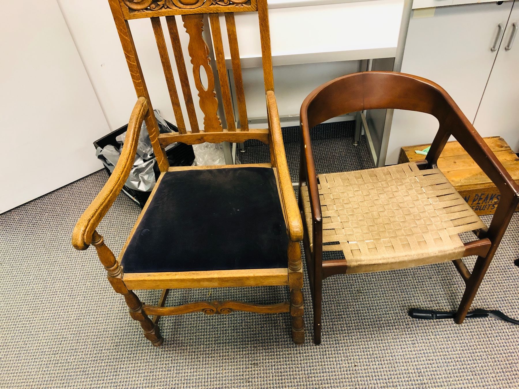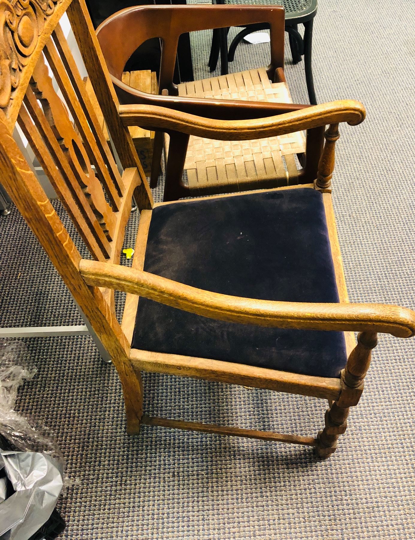Group of 2 - includes antique wood carved armchair & wicker captains chair