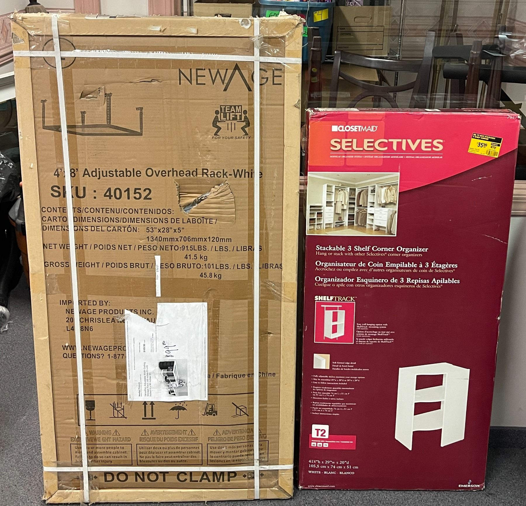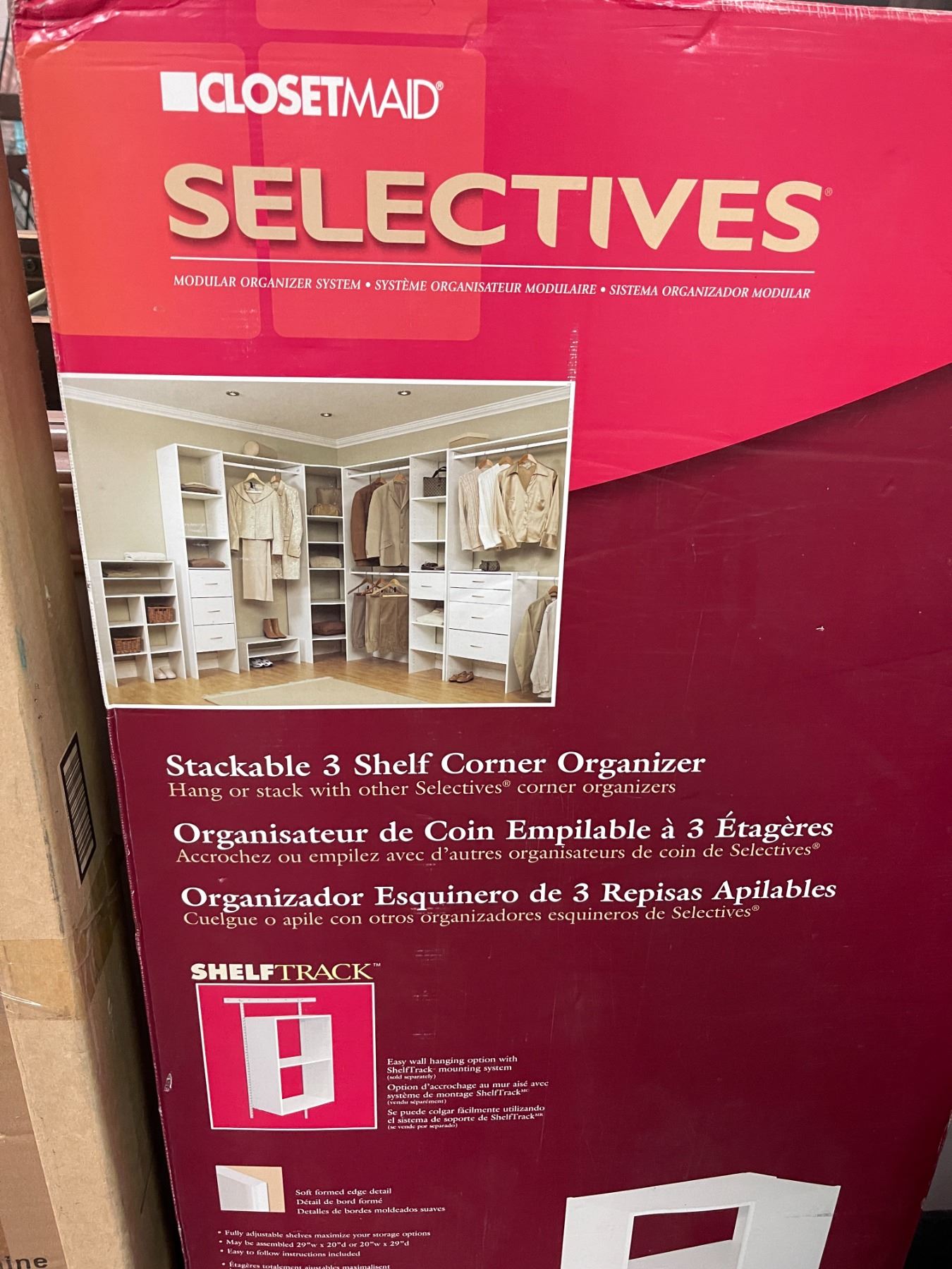 Group of 2 items - includes ClosetMaid stackable 3 shelf corner organizer (approx 21" x 43" x 3 1/2") & adjustable overhead rack-white (approx 27" x 52" x 4")