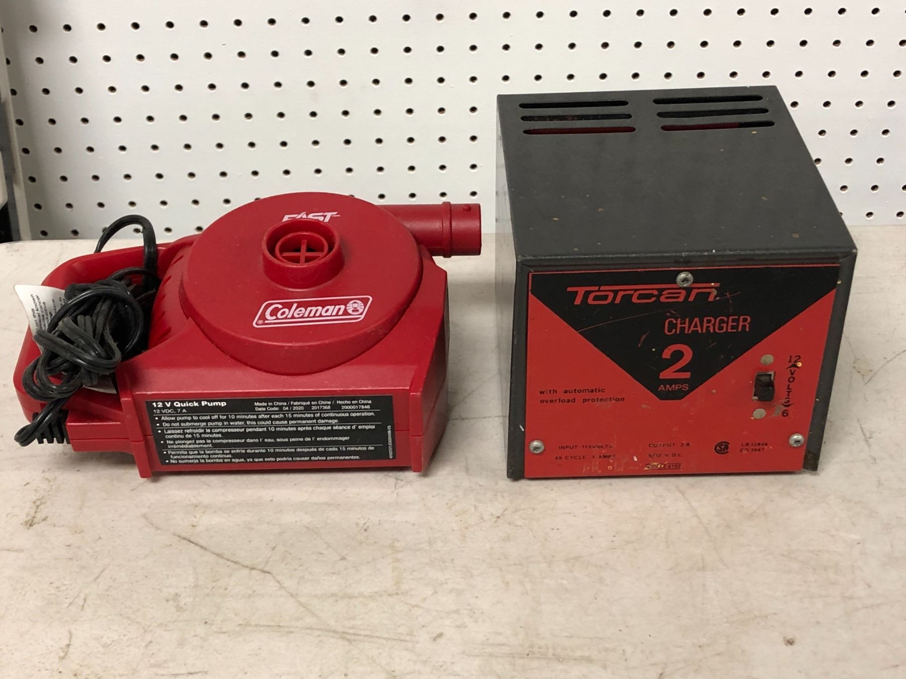 Group of 2 items - includes Torcan 2AMPS charger & Coleman 12V quick pump