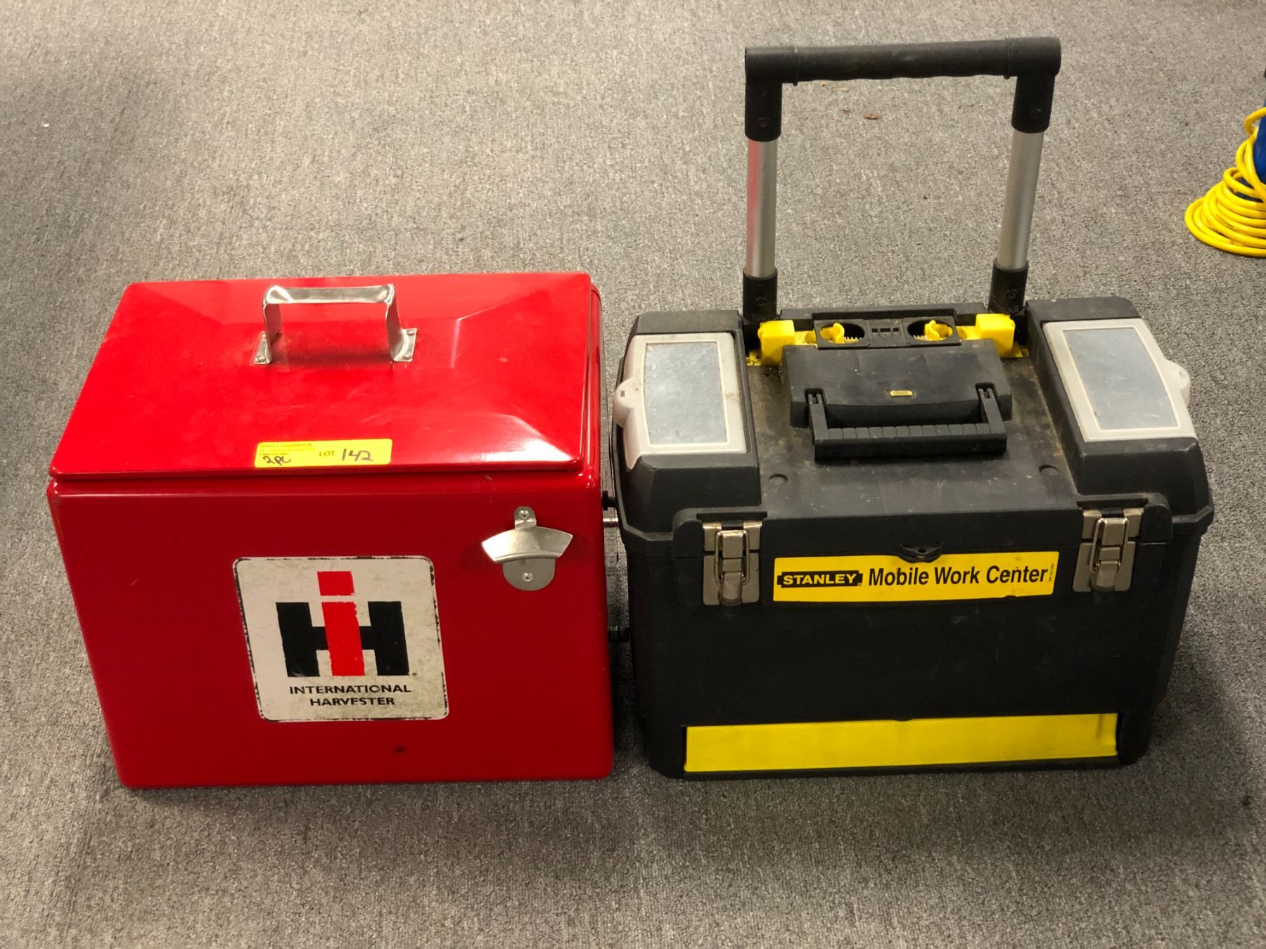 Group of 2 tool related items - includes Stanley mobile rolling tool box & International harvester red cooler