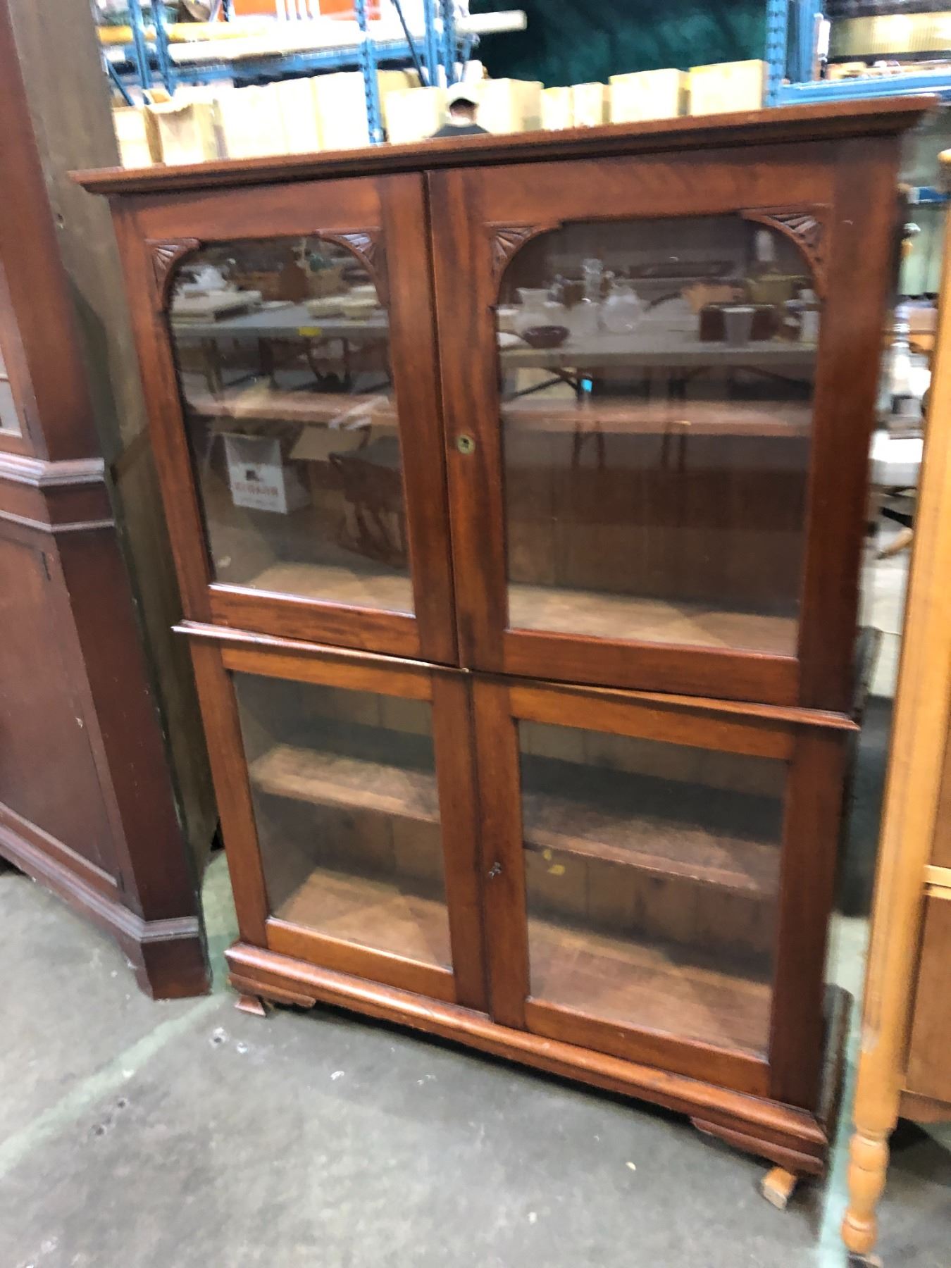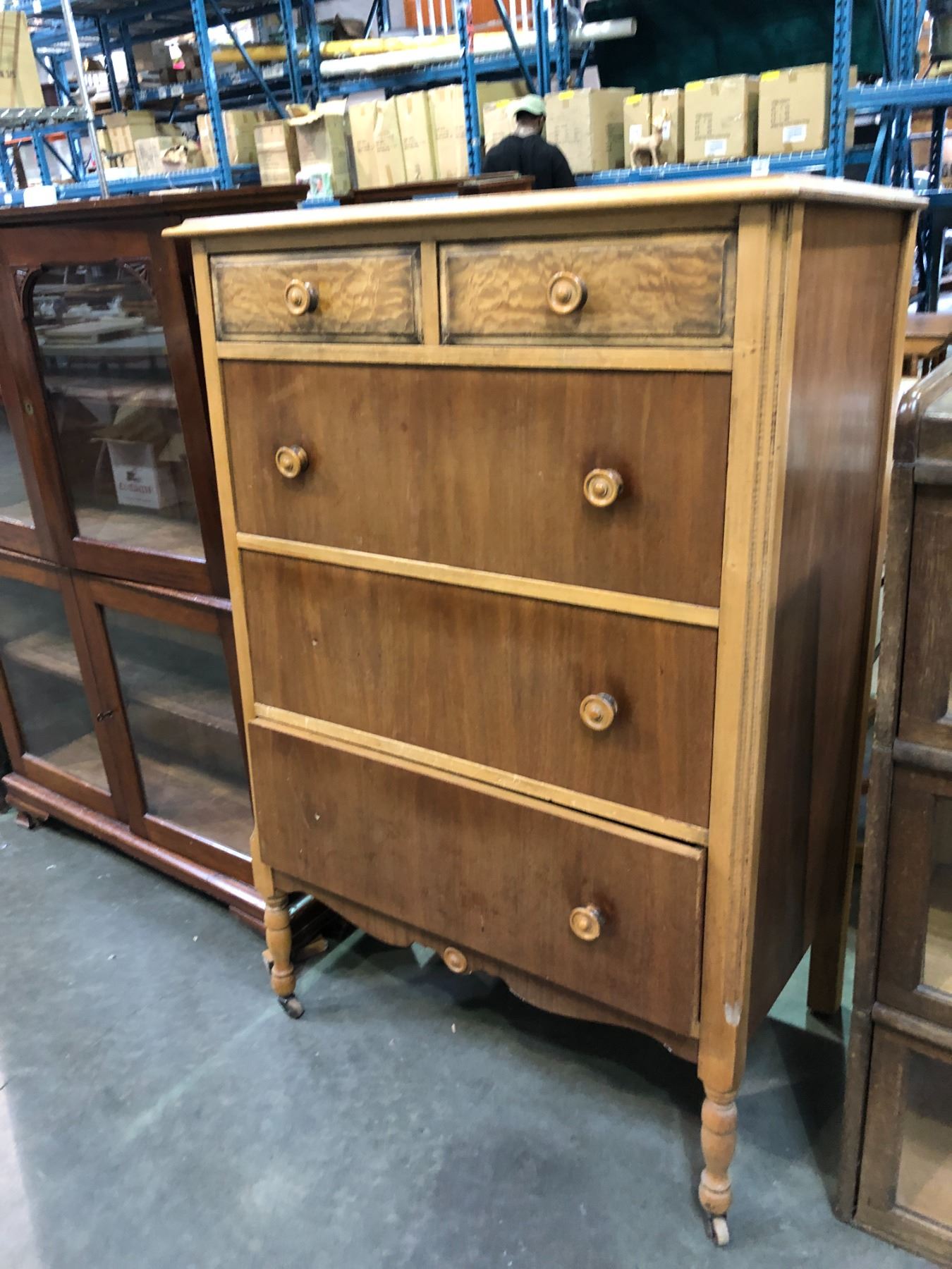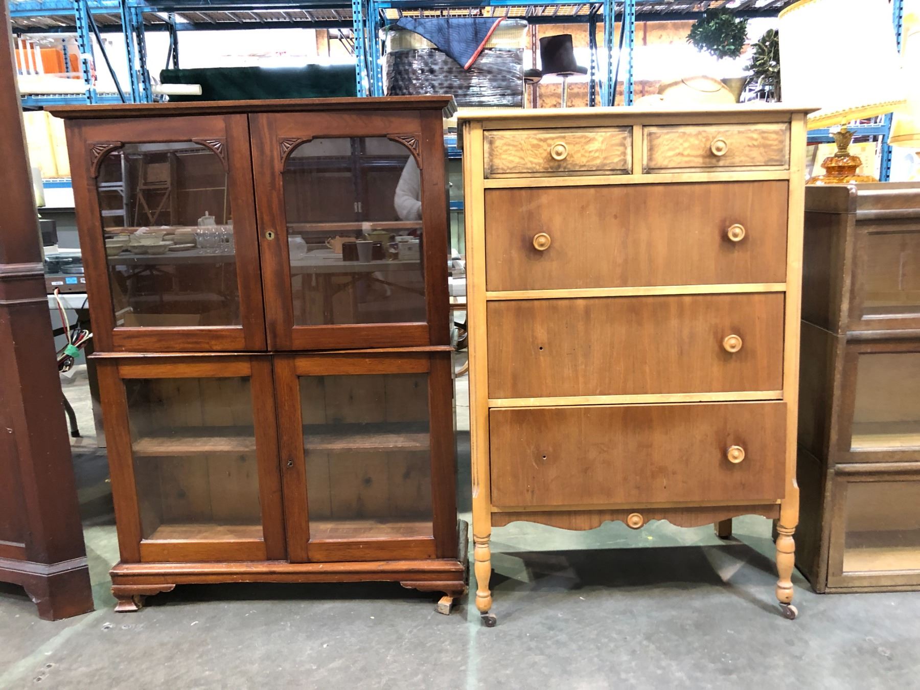Group of 2 vintage furniture - includes bookshelf cabinet (bottom foot needs repair) -approx 36" W x 11" L x 50" H & 5 drawer dresser (back wheels come off) - approx 32" W x 21" L x 49" H