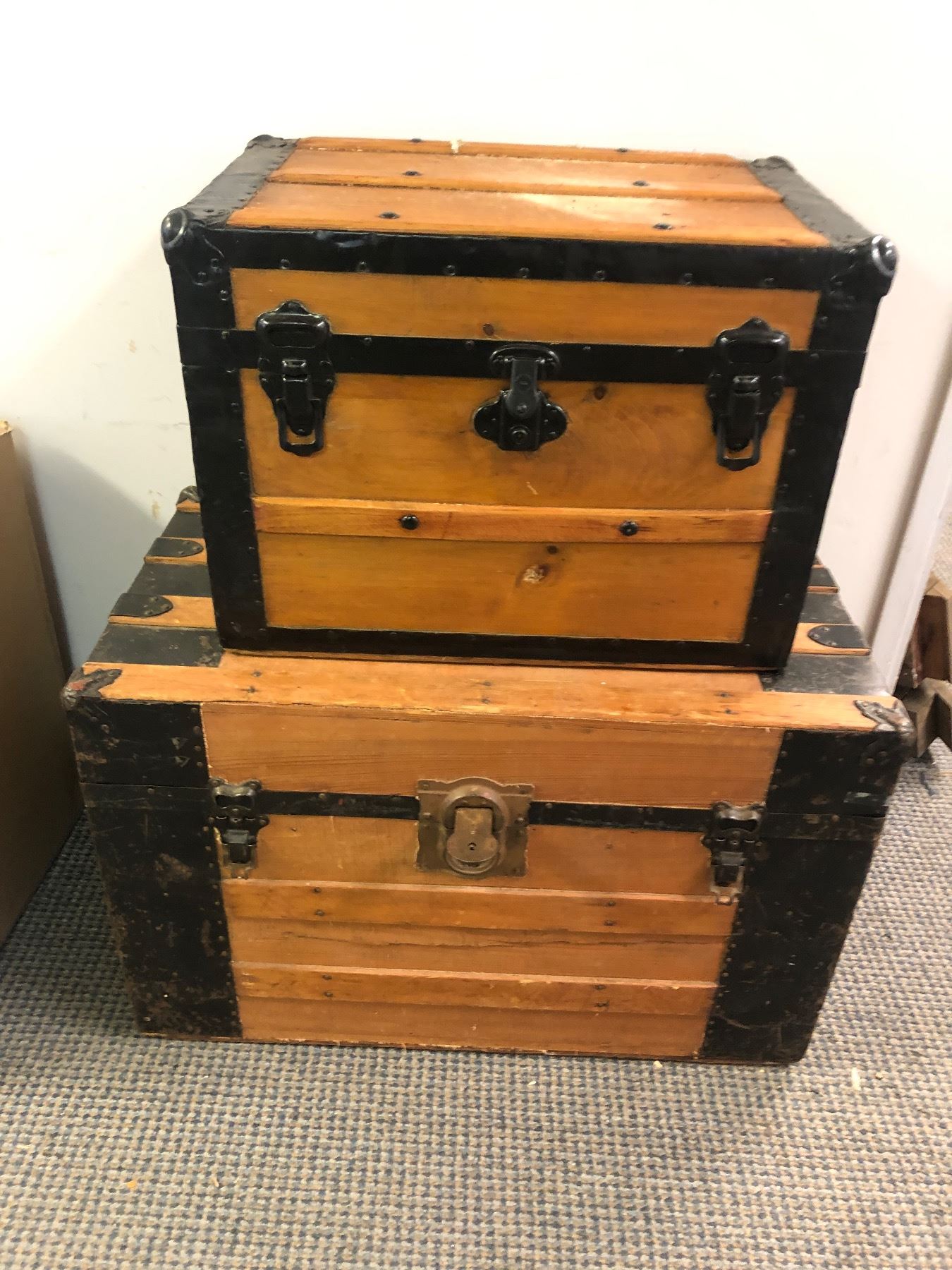 Group of 2 wooden chest boxes w/ contents (approx 28" x 16" x 18" H)
