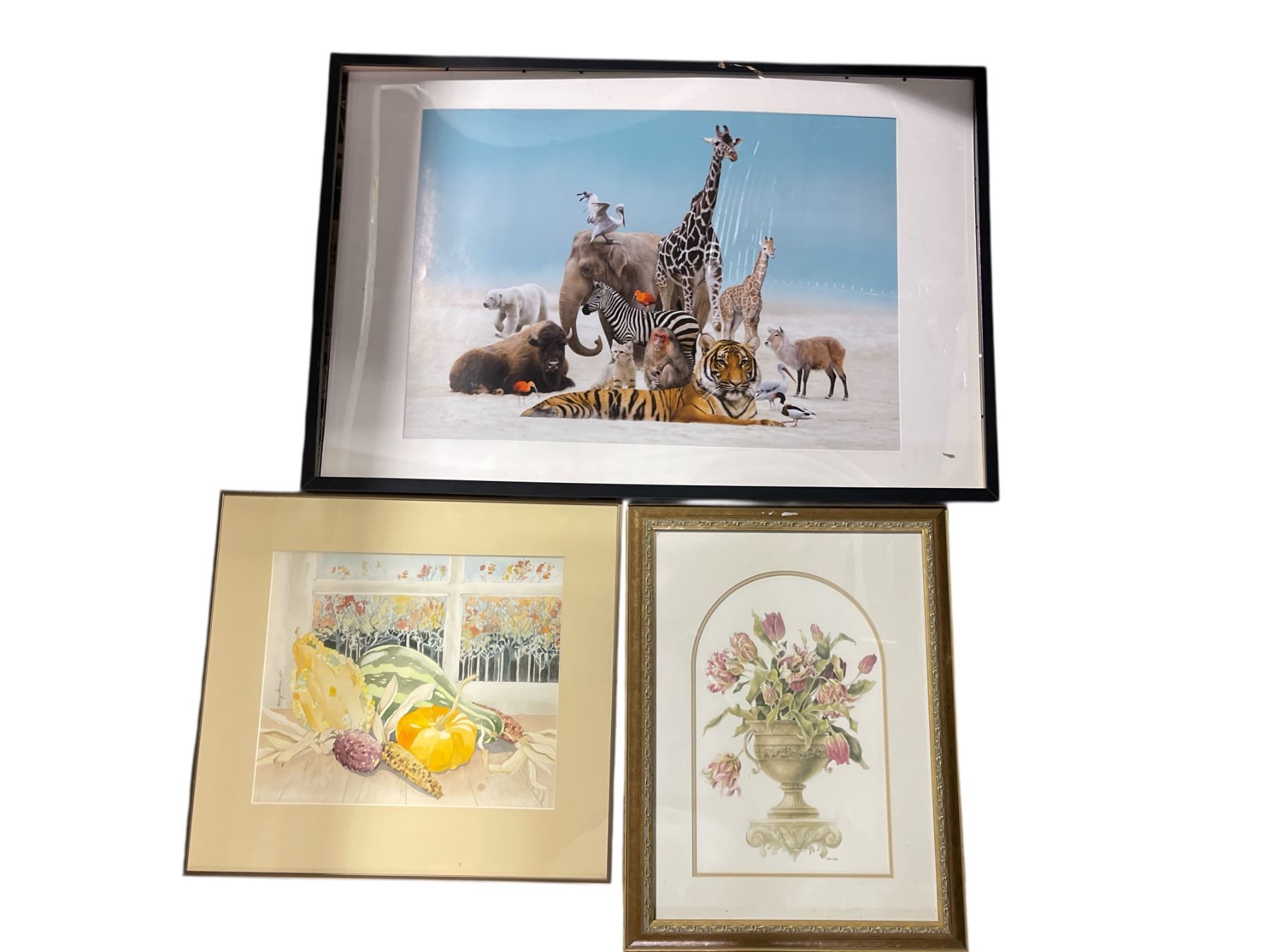 Group of 3 Framed Art Prints - Wildlife Collage, Floral Embroidery, and Still Life with Gourds
