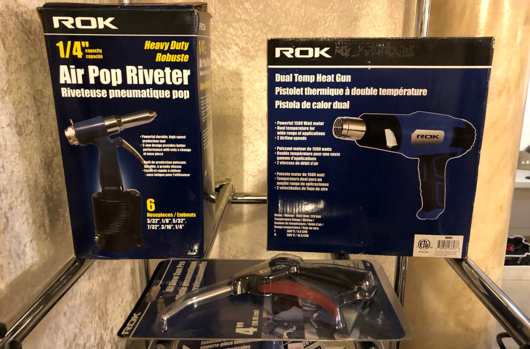 Group of 3 ROK tools - dual temp heat gun/ 1/4in capacity air pop riveter & air blow gun