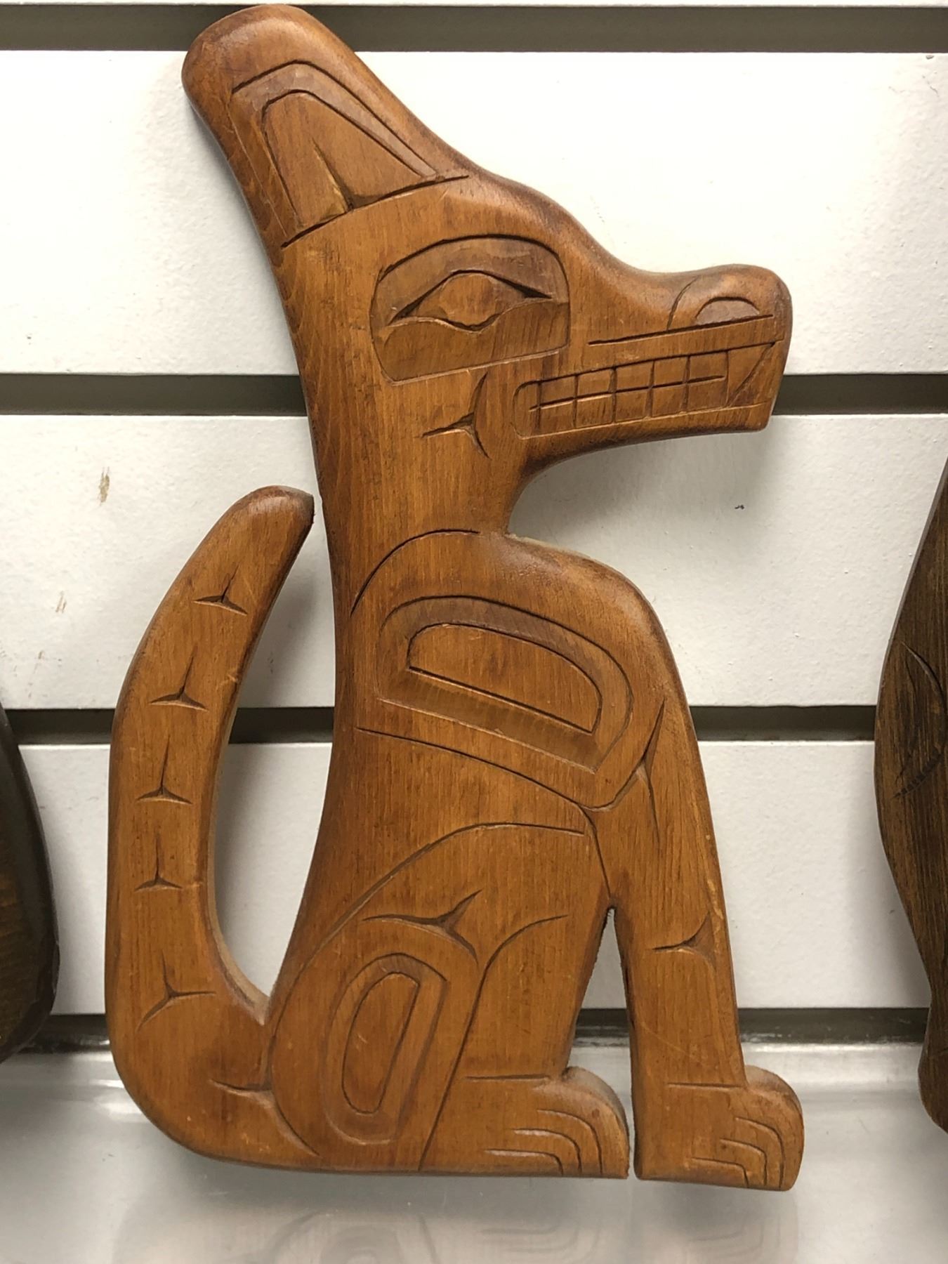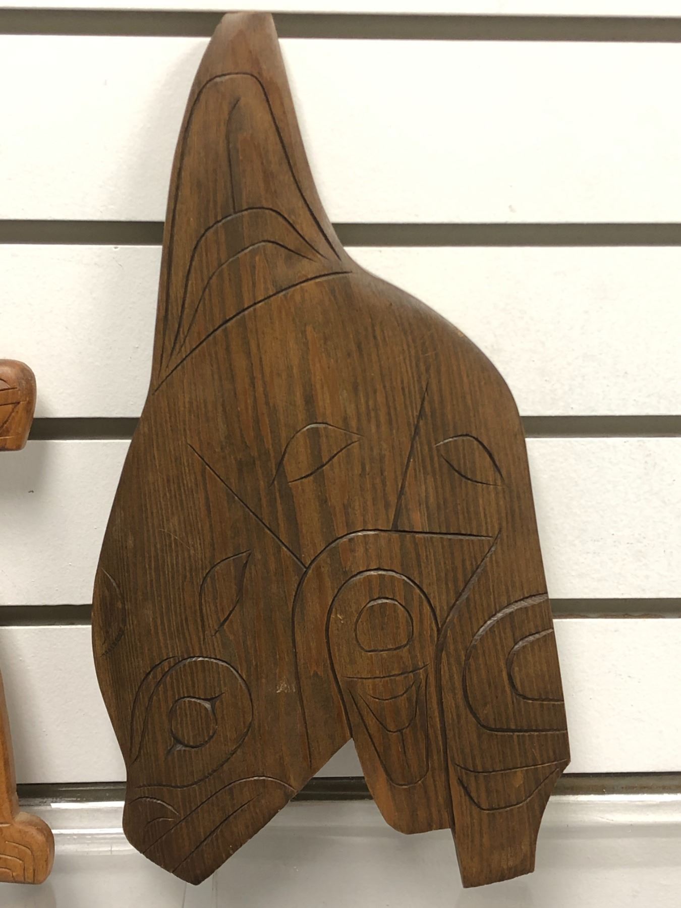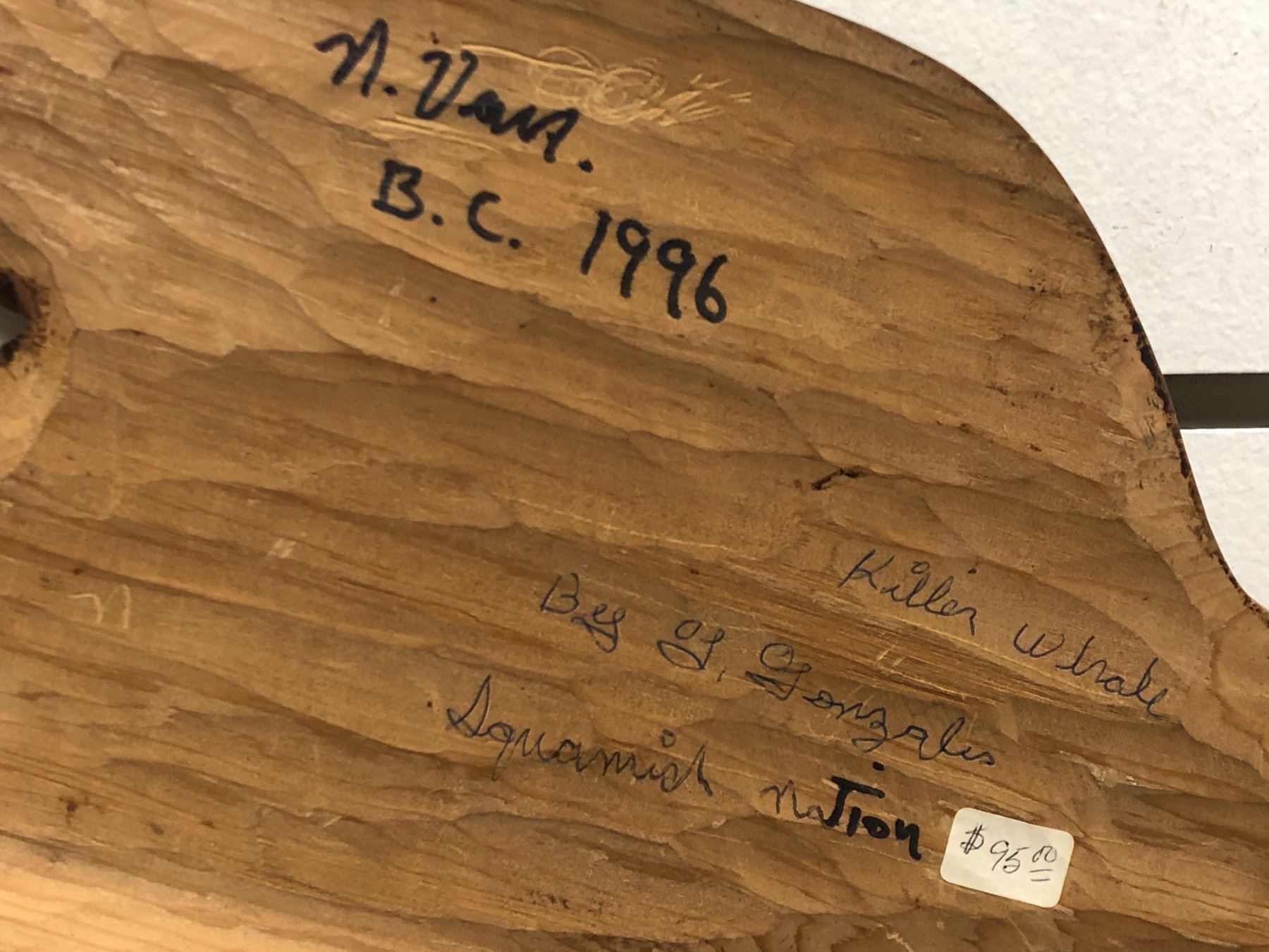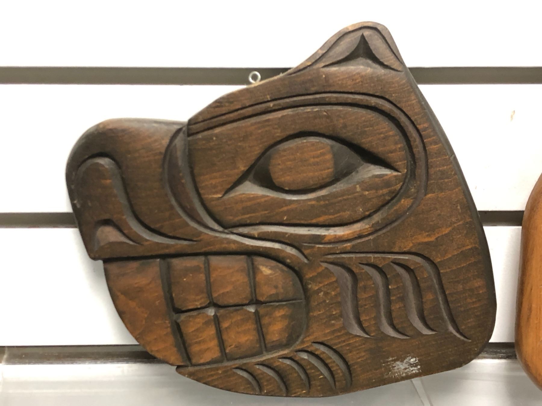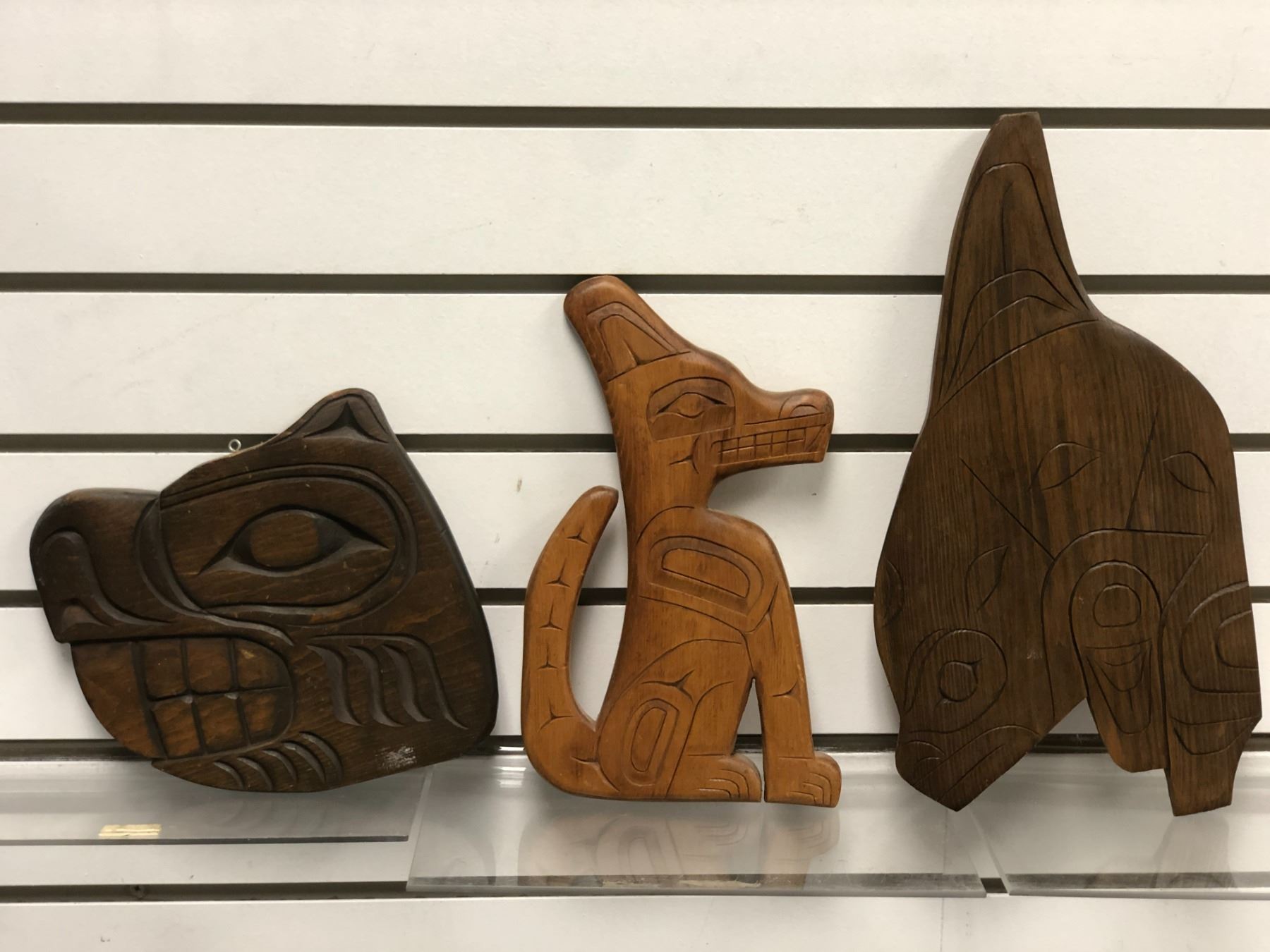 Group of 3 West Coast First Nations wood carved plaques - 13in/ 8in/ 9 3/4in (all signed by artist - J T Calder/ G. Gonzales/ Alex Bagley)