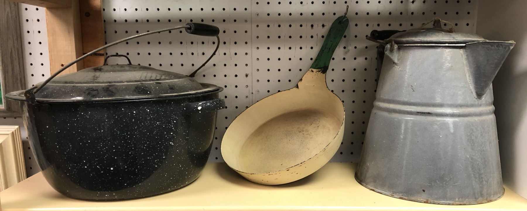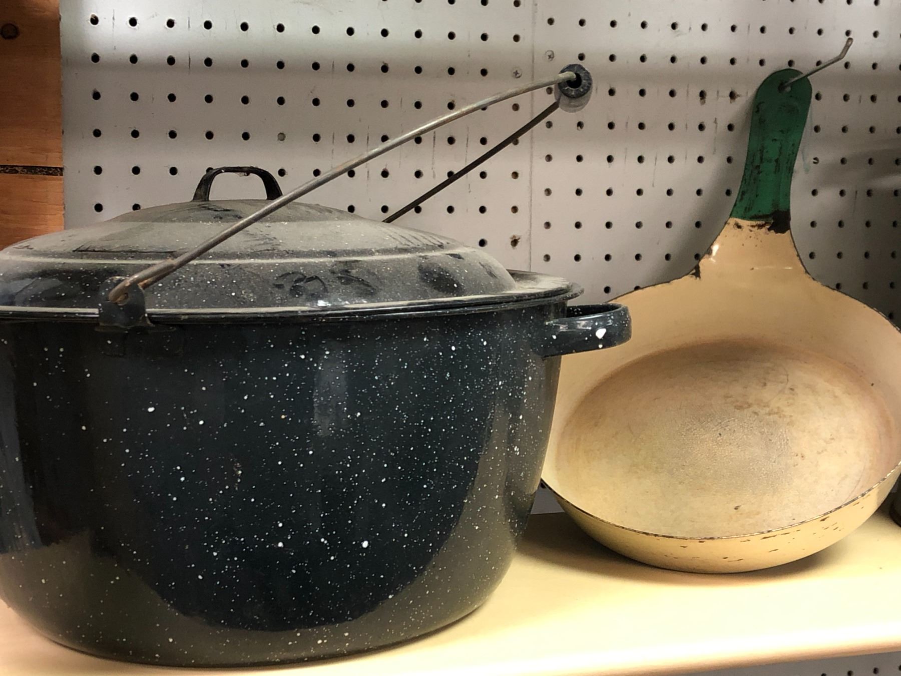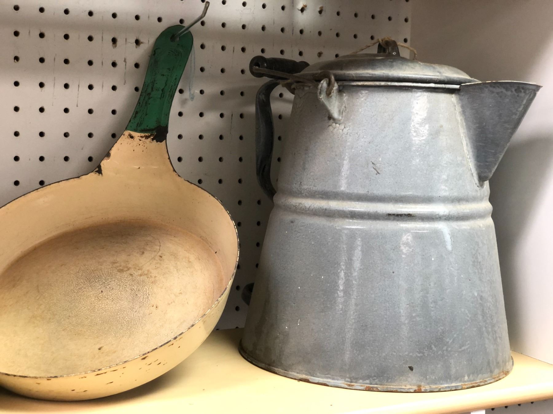 Group of 3 antique enamel cookware - Large lidded kettle/ frying pan & large lidded pot