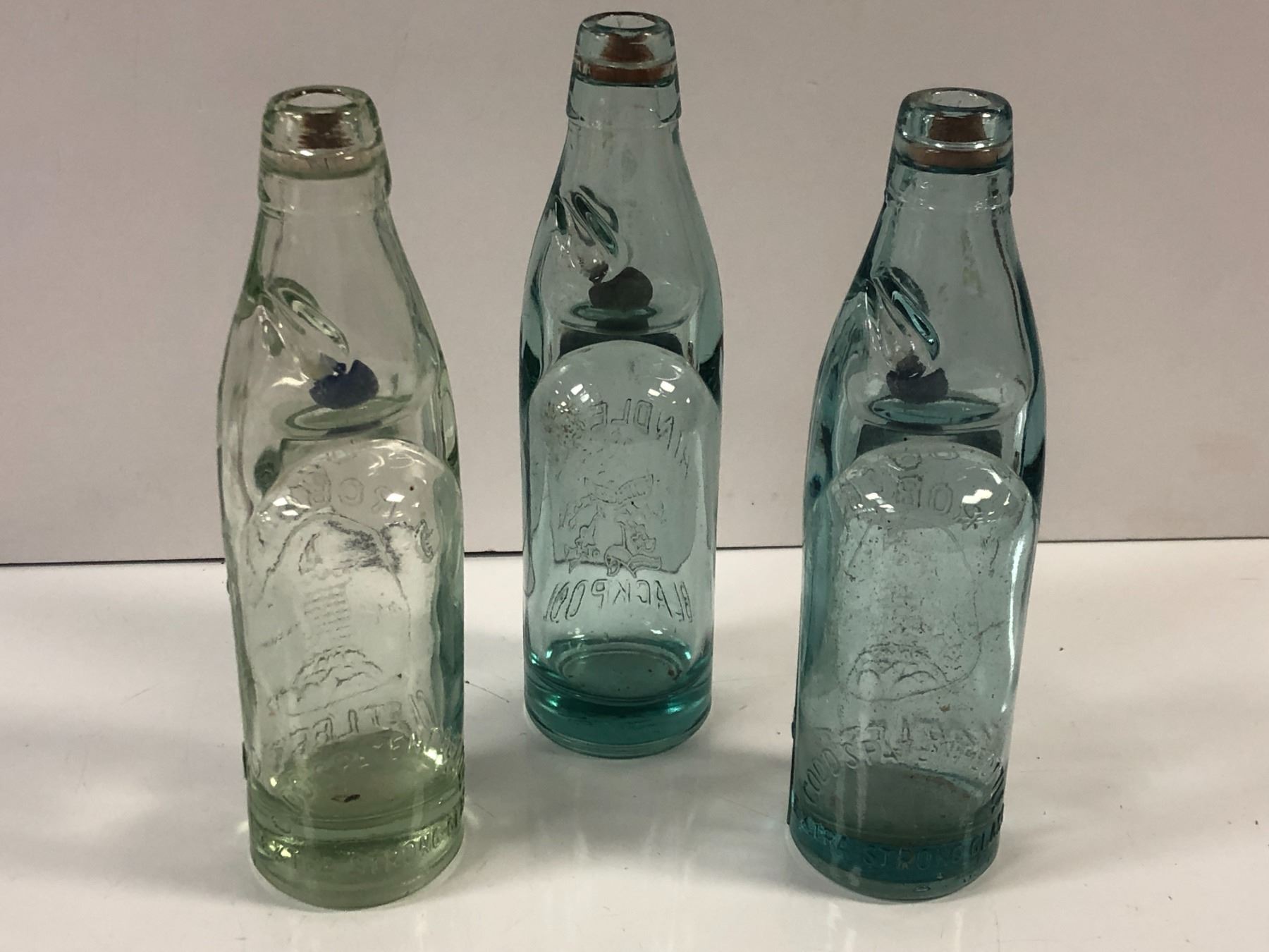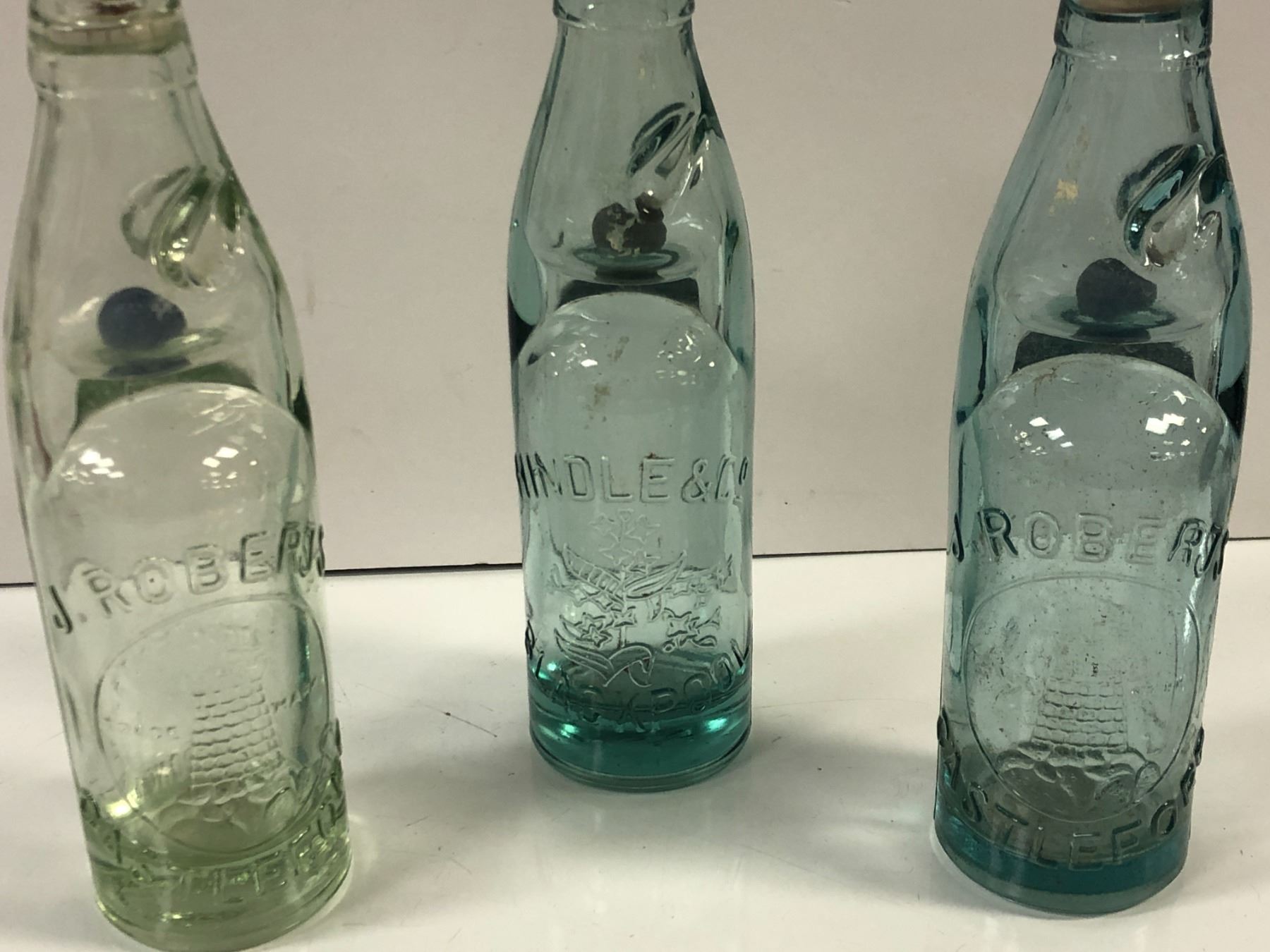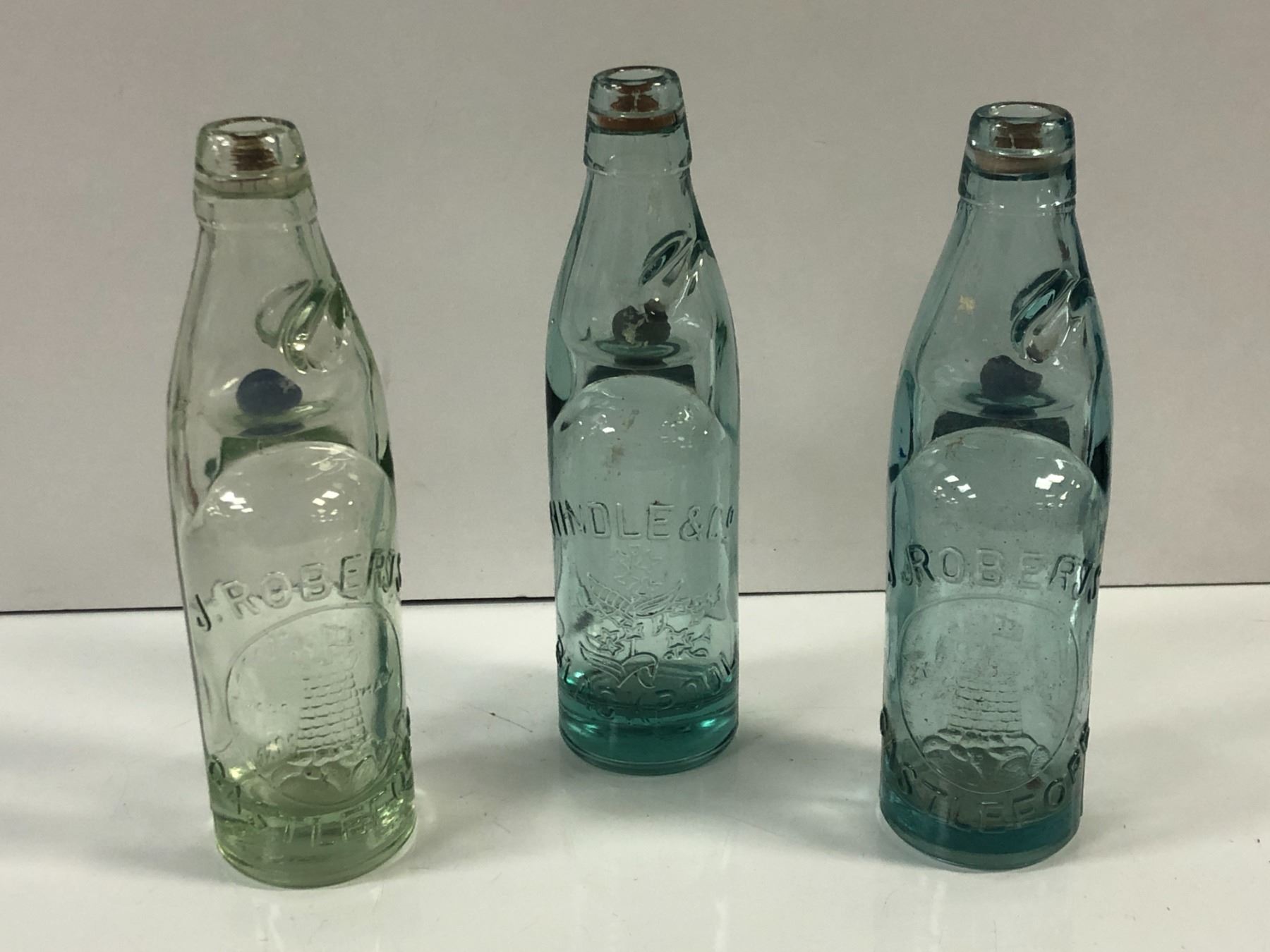Group of 3 antique glass bottles w/ marble - 2 J. Roberts Castleford & 1 Hindle & Co.BlackPool