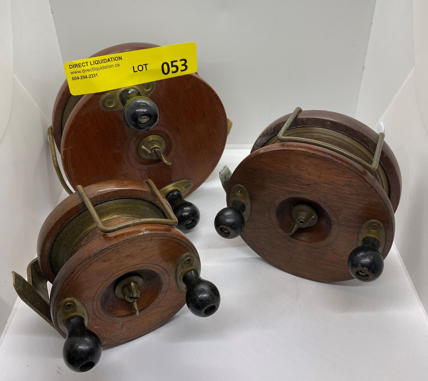 Group of 3 antique peetz classic wooden trolling reels - 6"/5"/4"