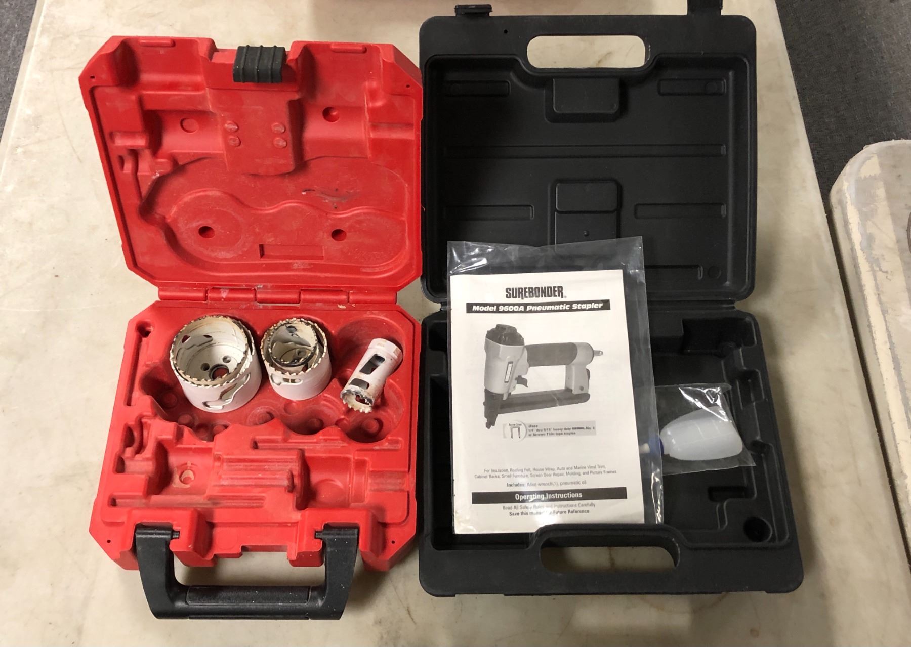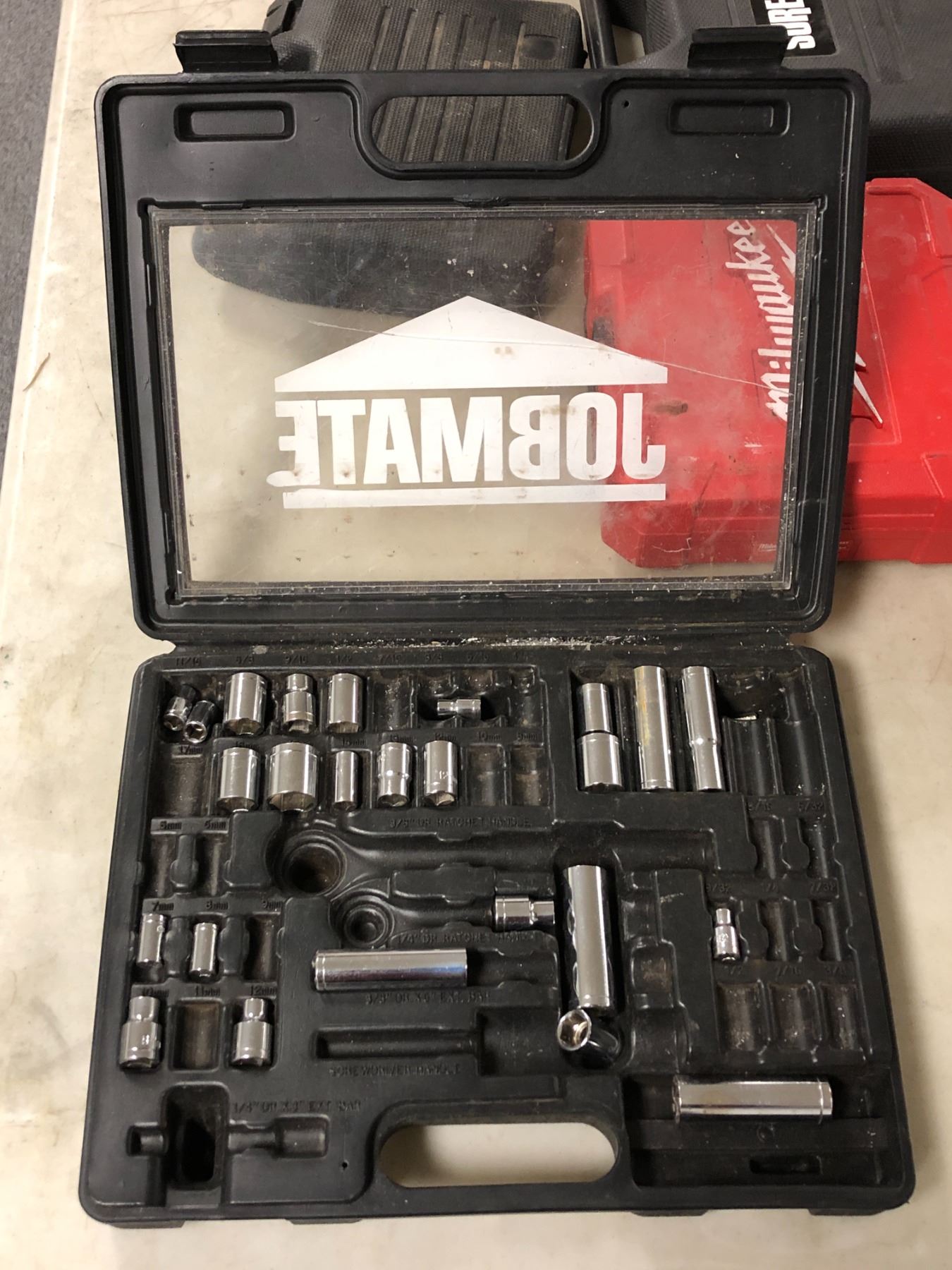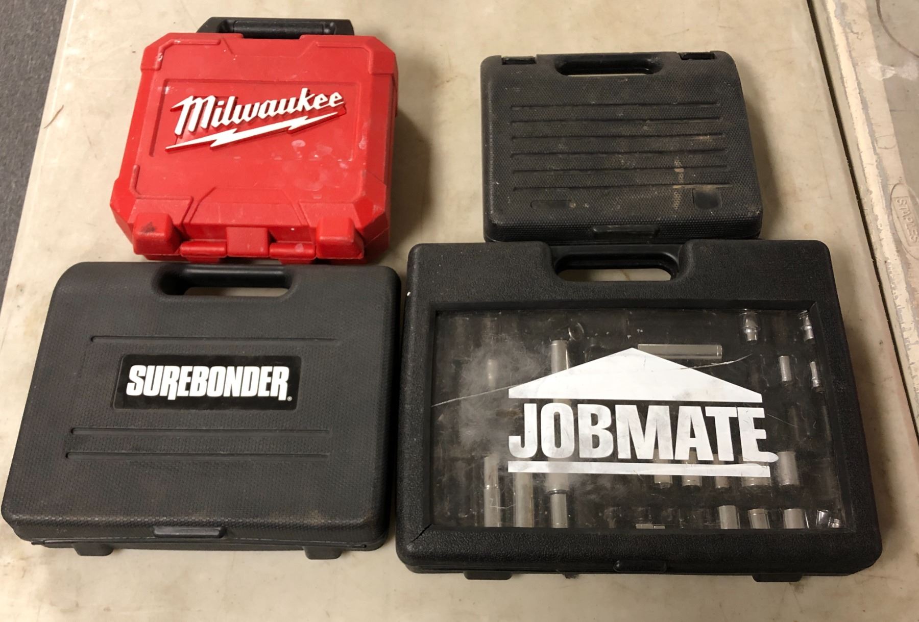 Group of 3 assorted empty tool cases & JobMate socket set - includes Milwaukee case / Surebonder case etc
