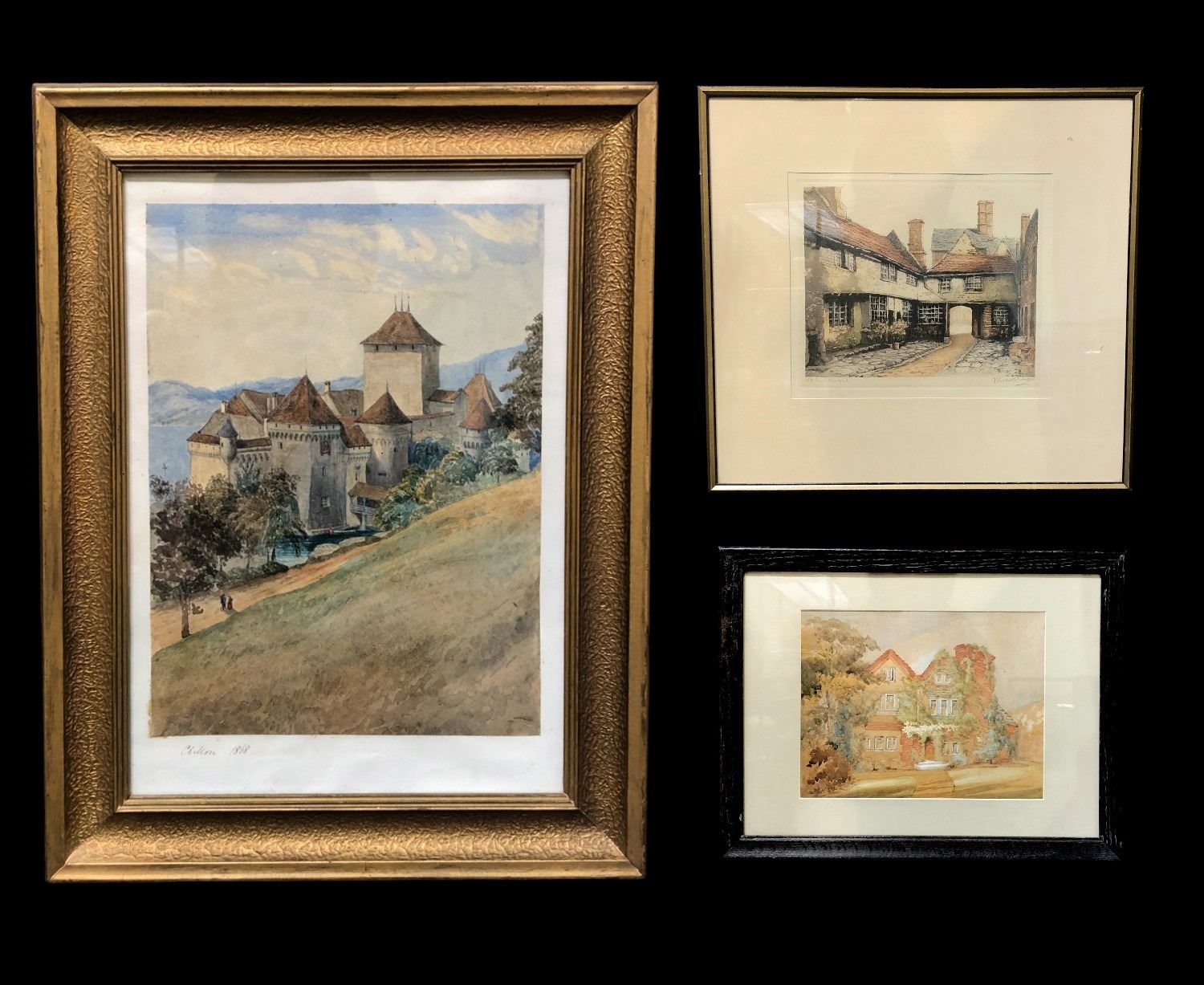 Group of 3 assorted framed paintings - includes Chillon Castle 1868 signed painting (approx 13" x 17