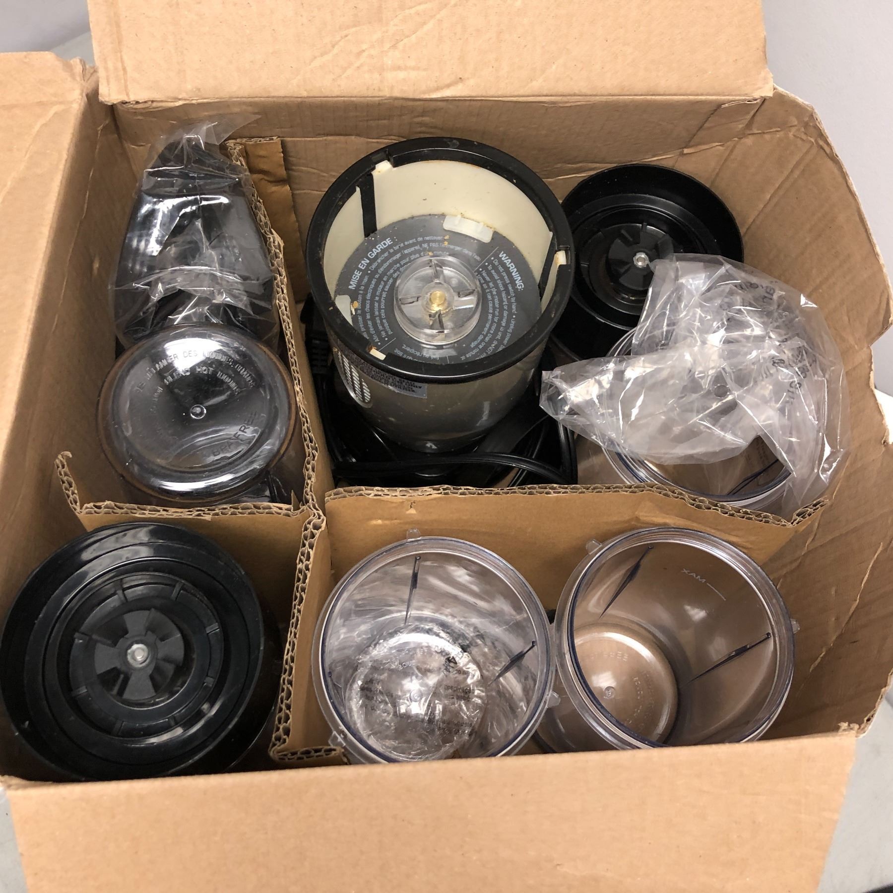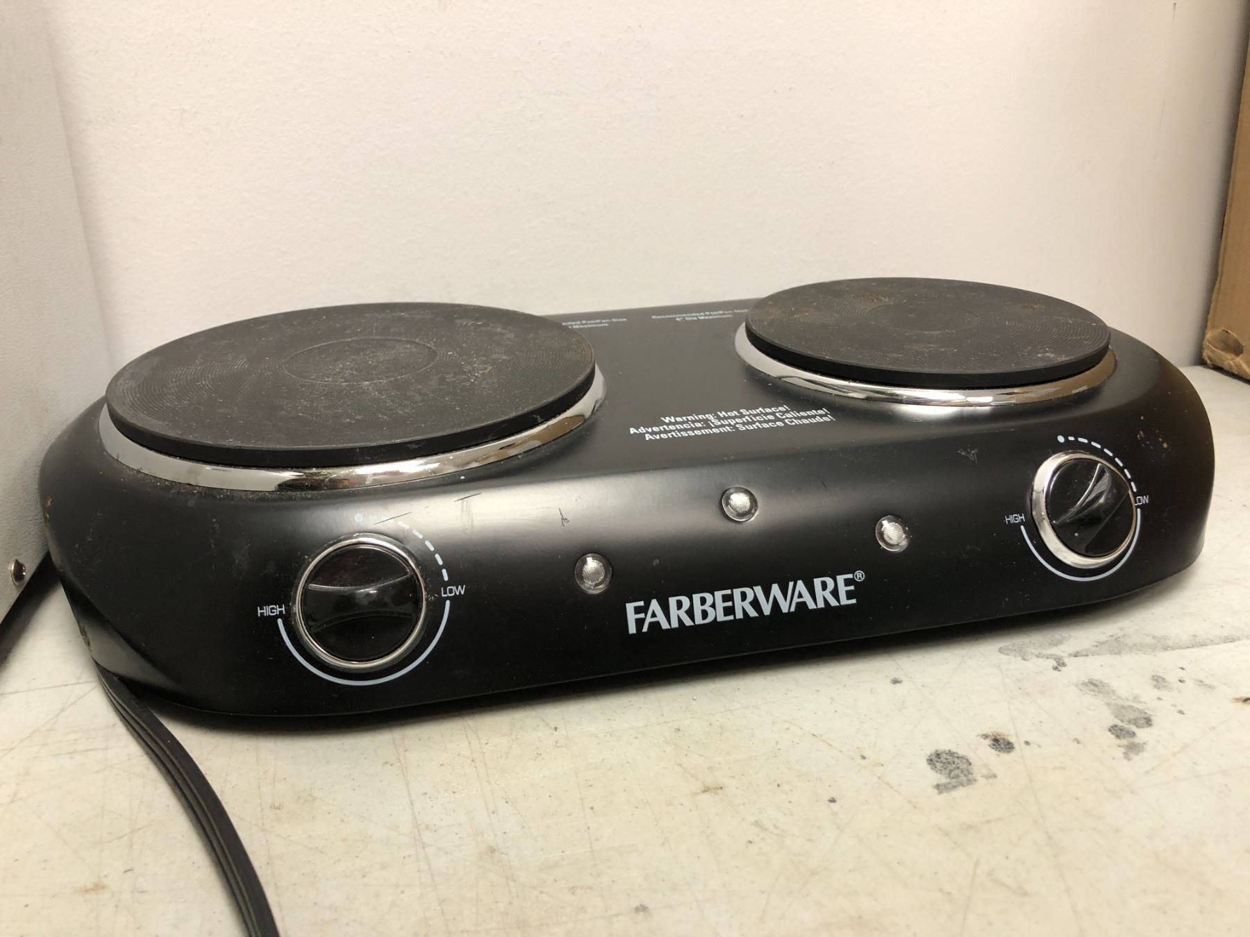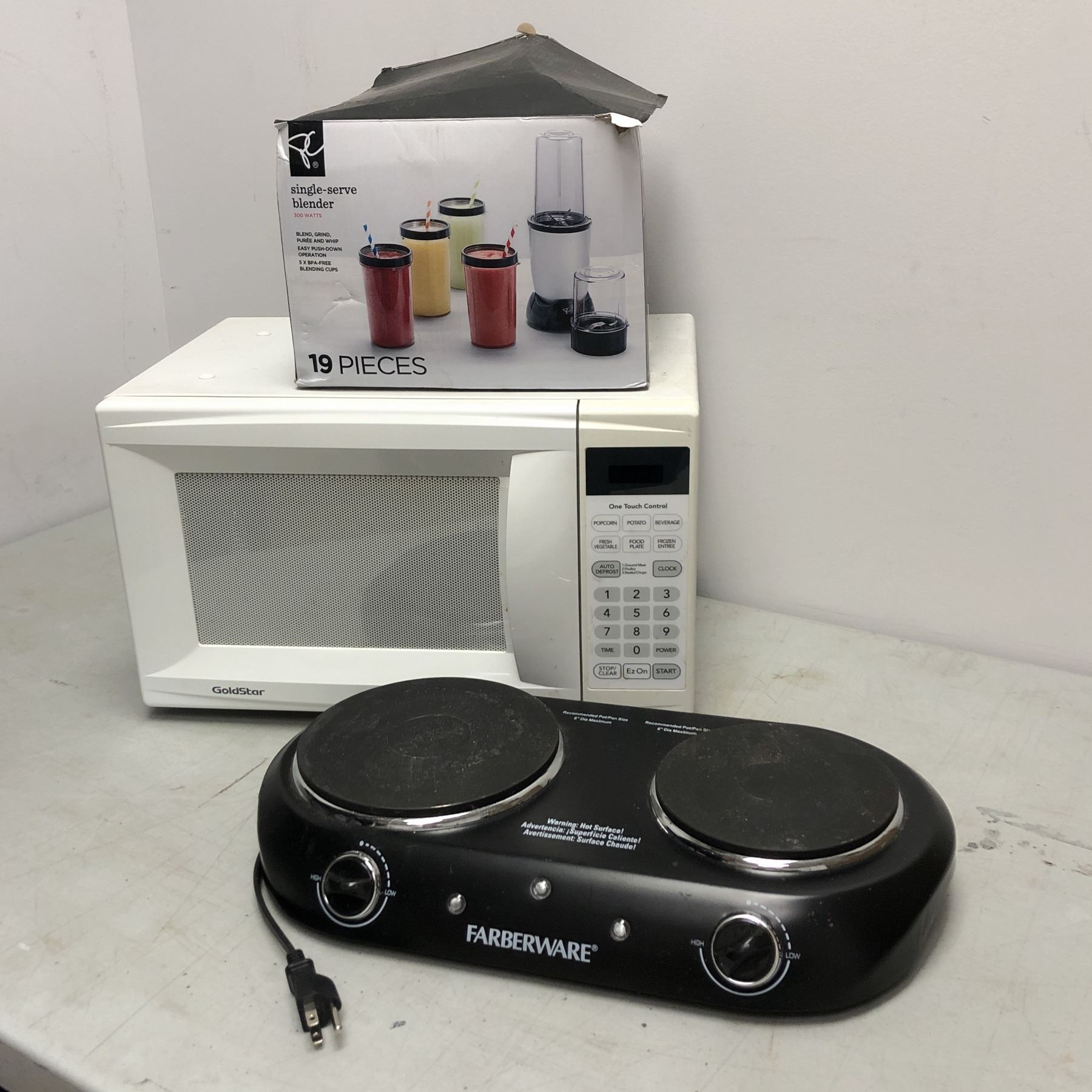 Group of 3 assorted kitchen related items - includes Farberware portable stove / single serve blender & Goldstar microwave