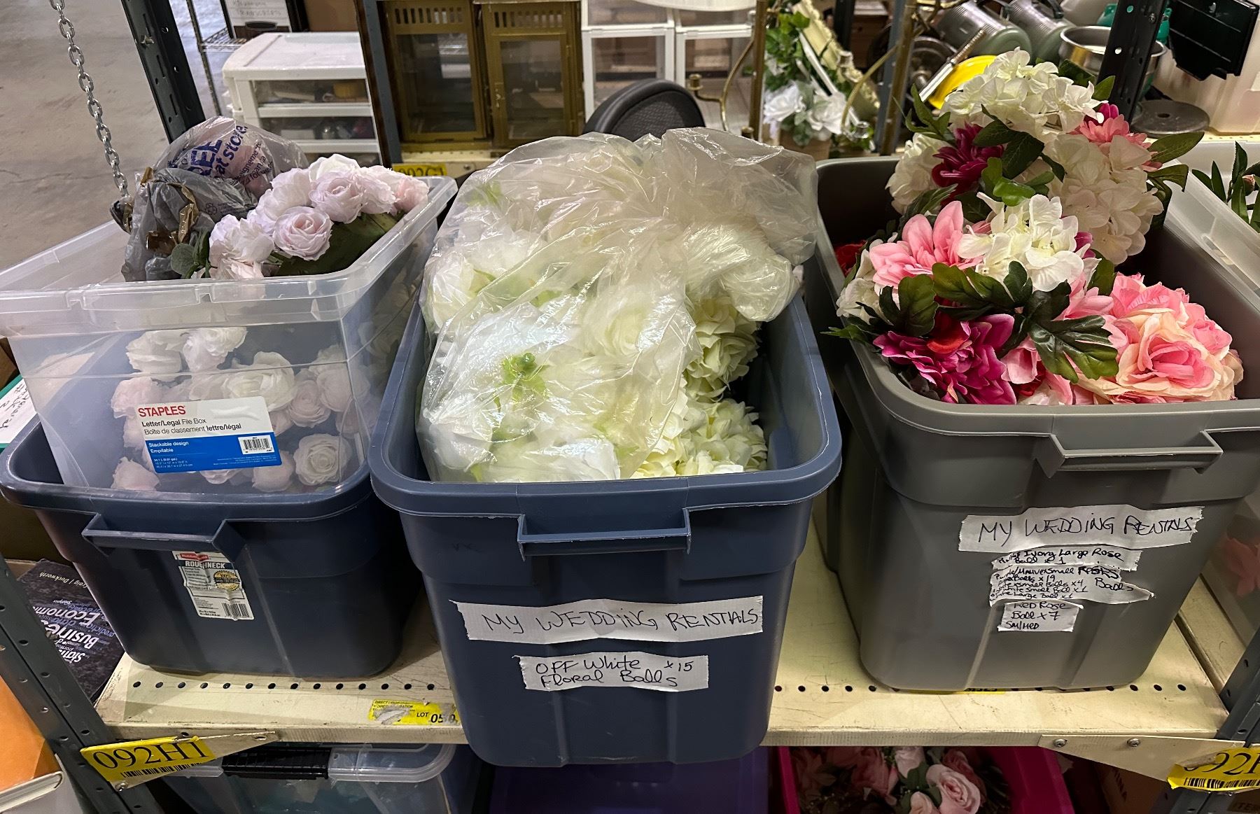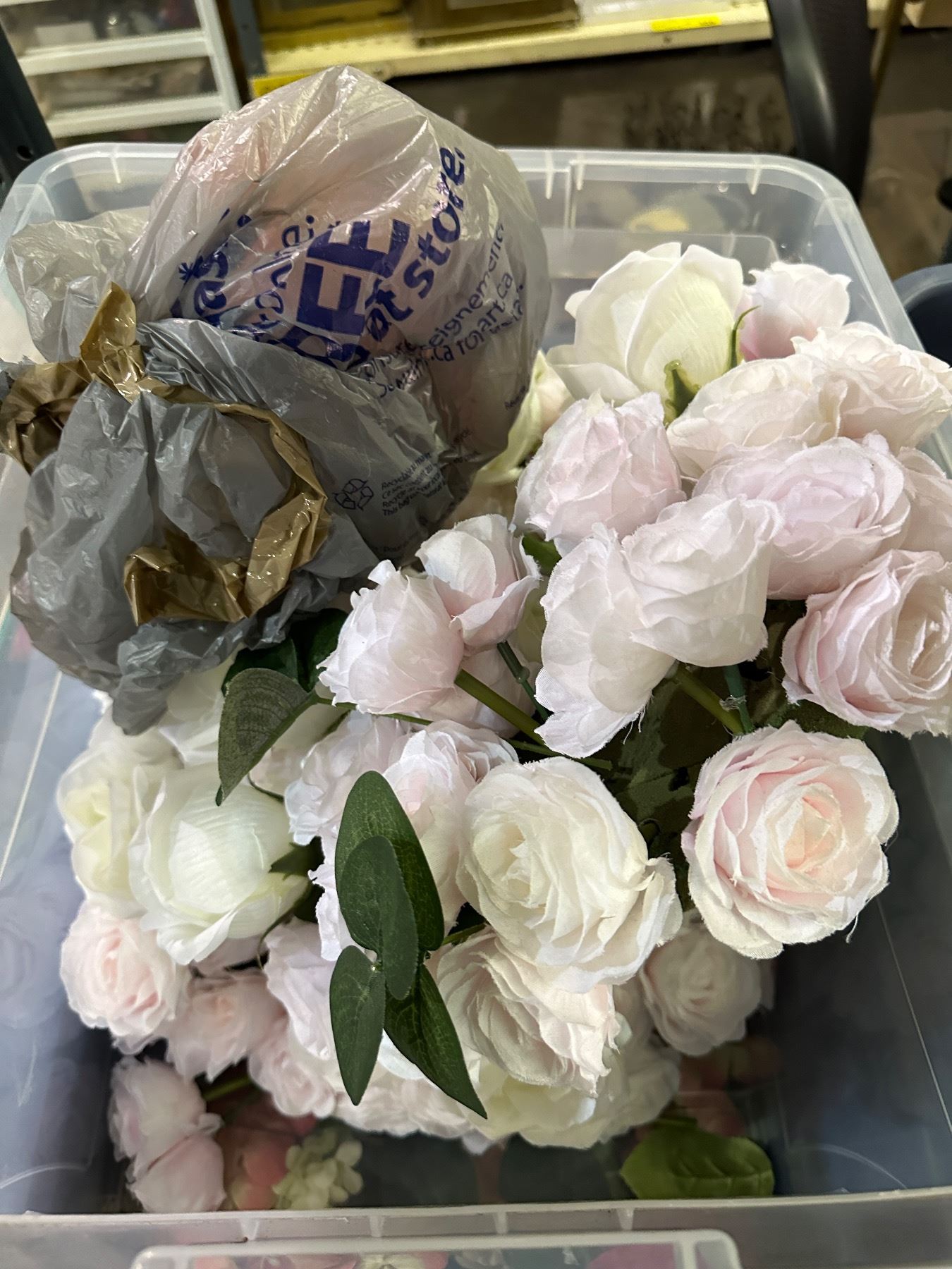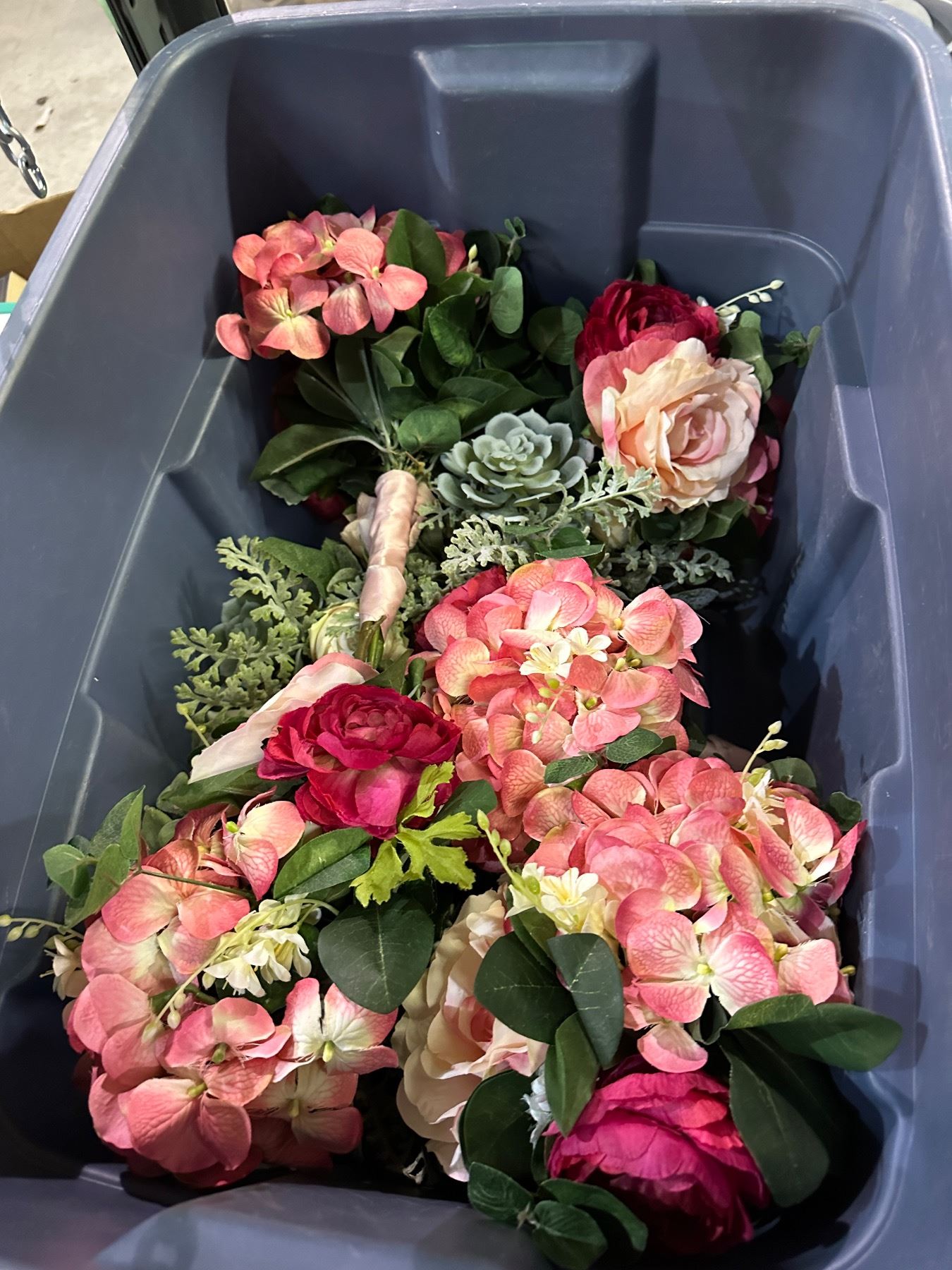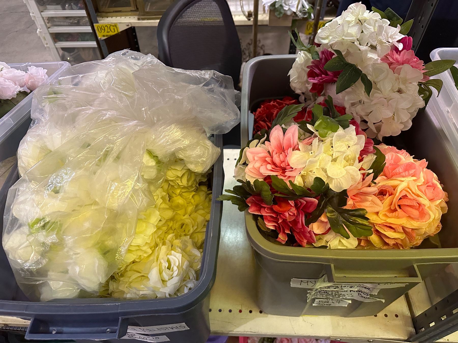 Group of 3 bins full of floral balls, artificial flowers, red rose, etc...