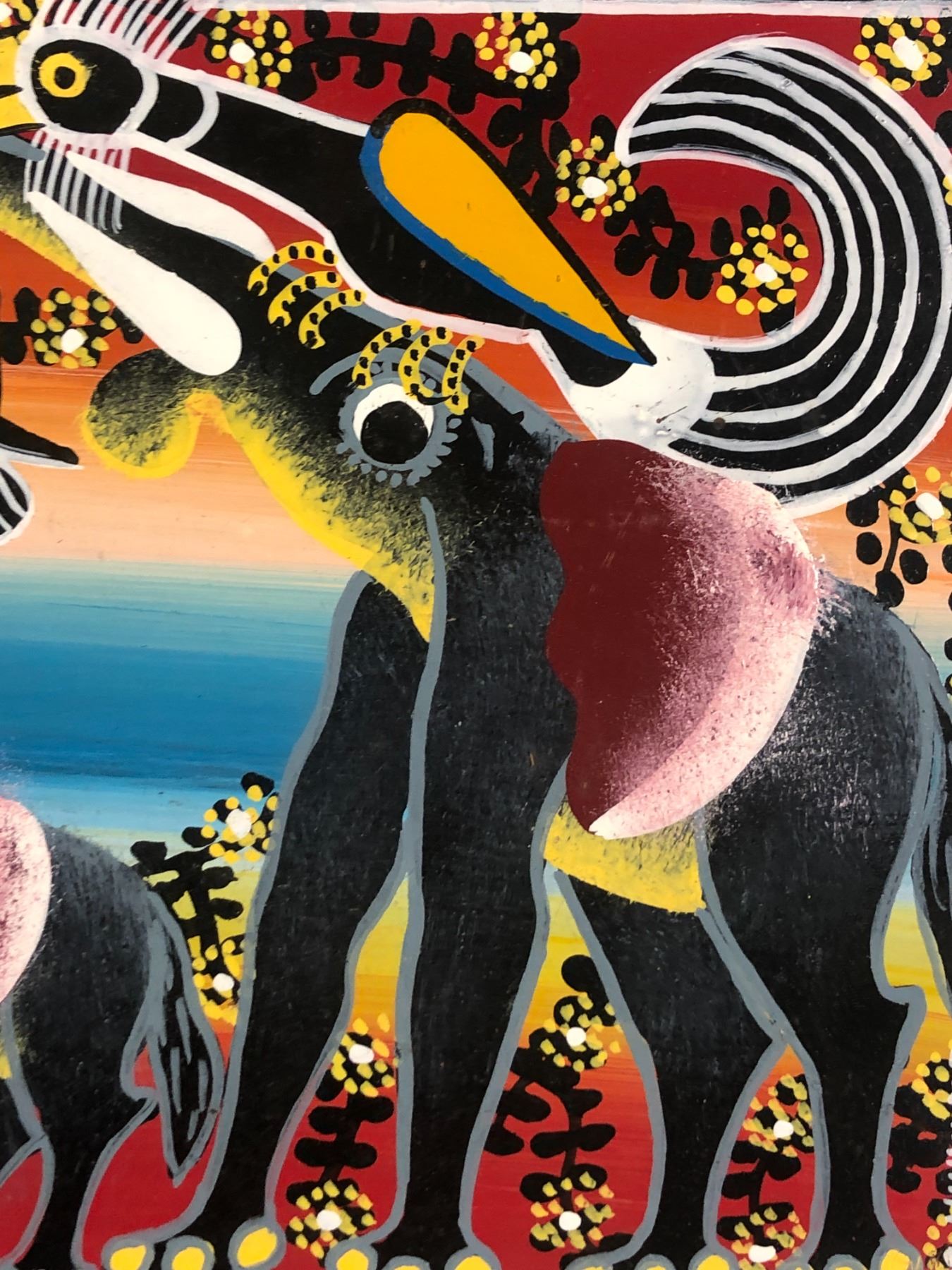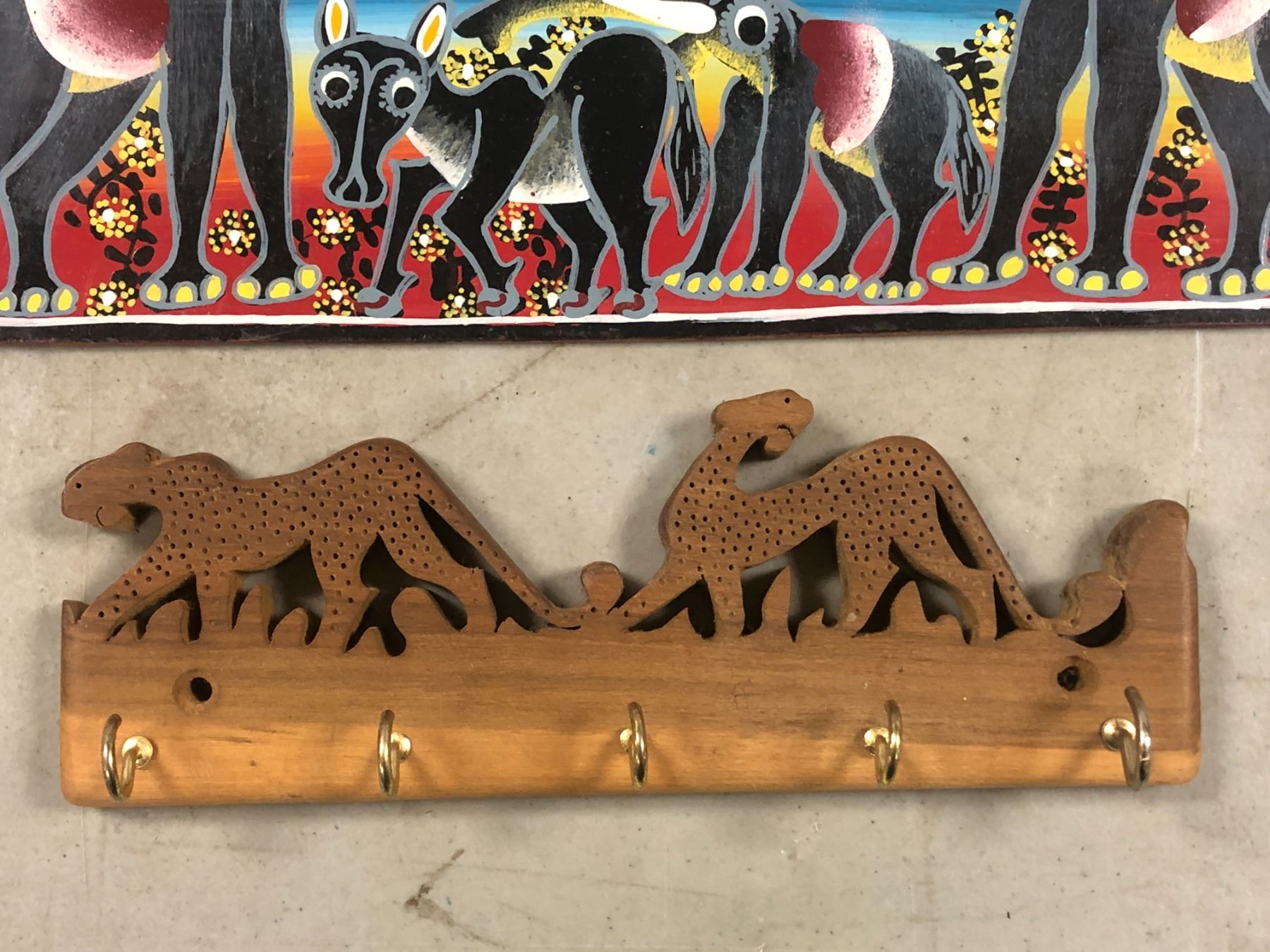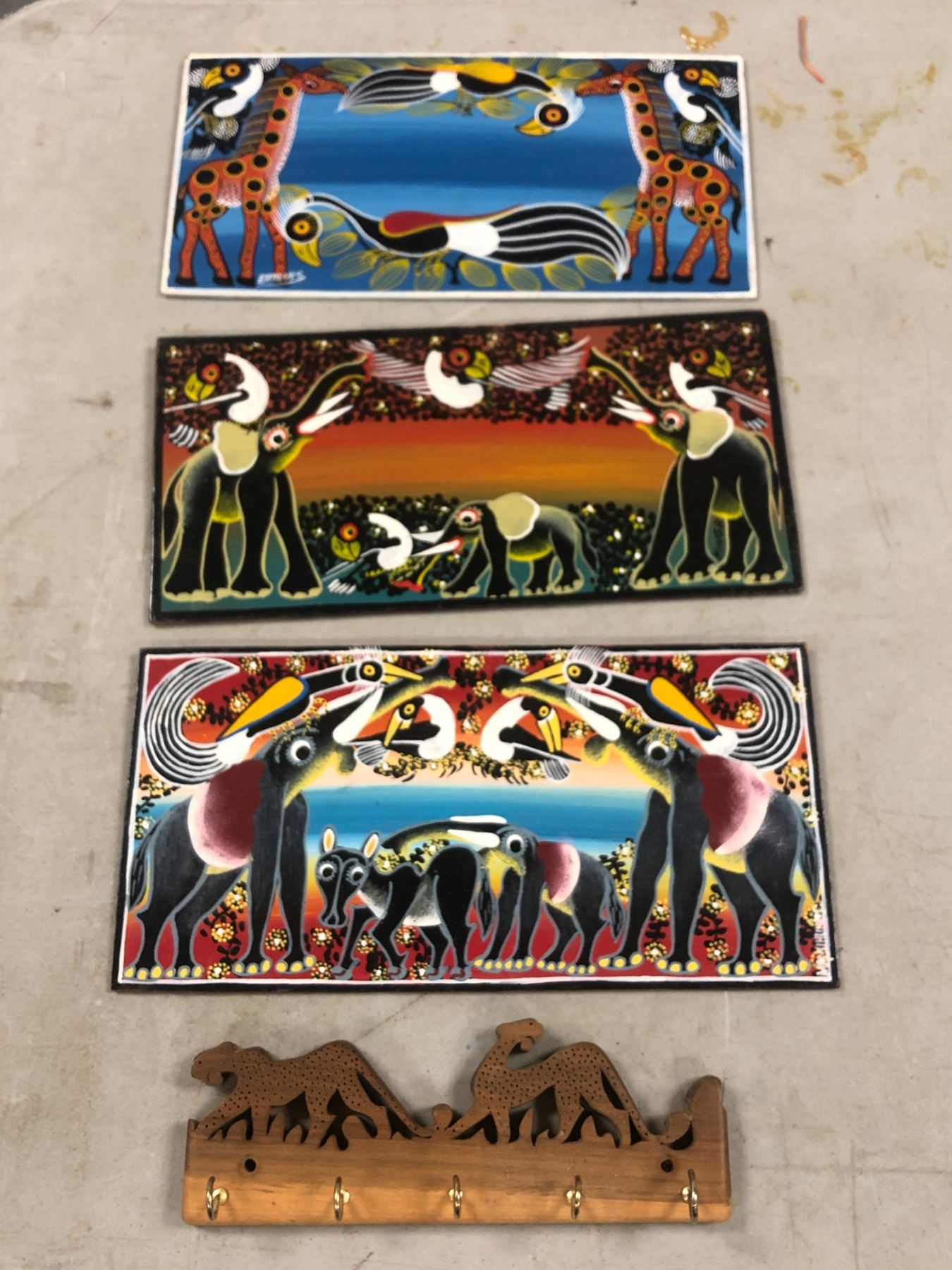 Group of 3 decorative art wall hangings (approx 12" x 6") & decorative lion wall hooks