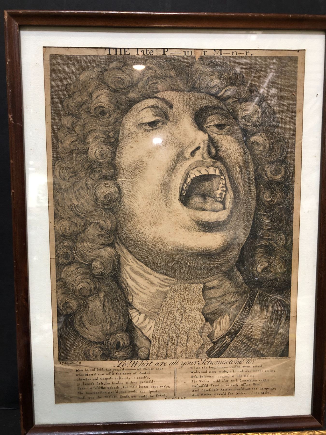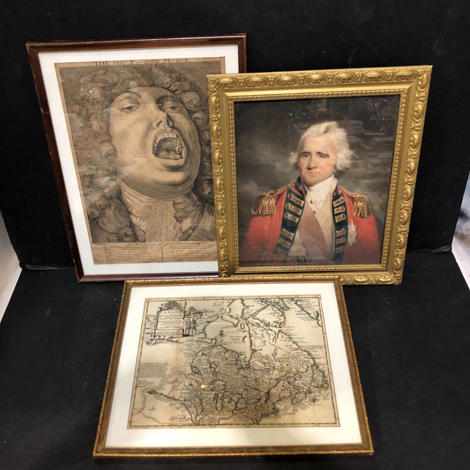 Group of 3 framed paintings - includes The Late Prime Minister 1748 newsprint (approx 12 1/2" x 16 1/2") / John Hoppner (approx 13" x 15") & Canada ou nouvelle France (approx 15" x 12")