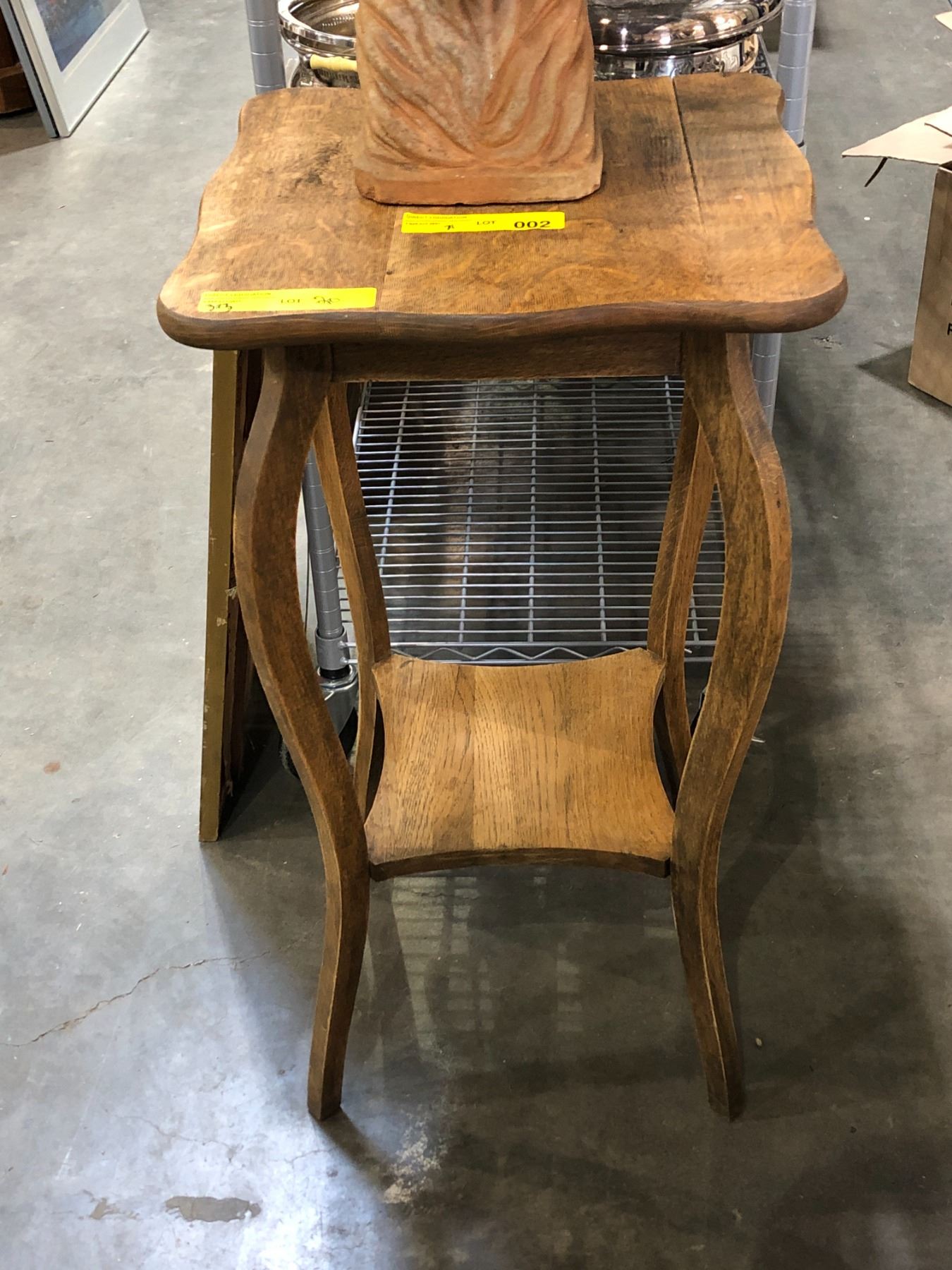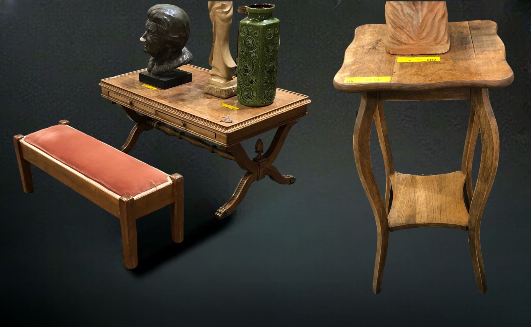 Group of 3 - includes vintage wooden coffee table (approx 37" W x 21" L x 18" H) / antique plant stand (approx 16" squared x 30" H ) & ottoman bench