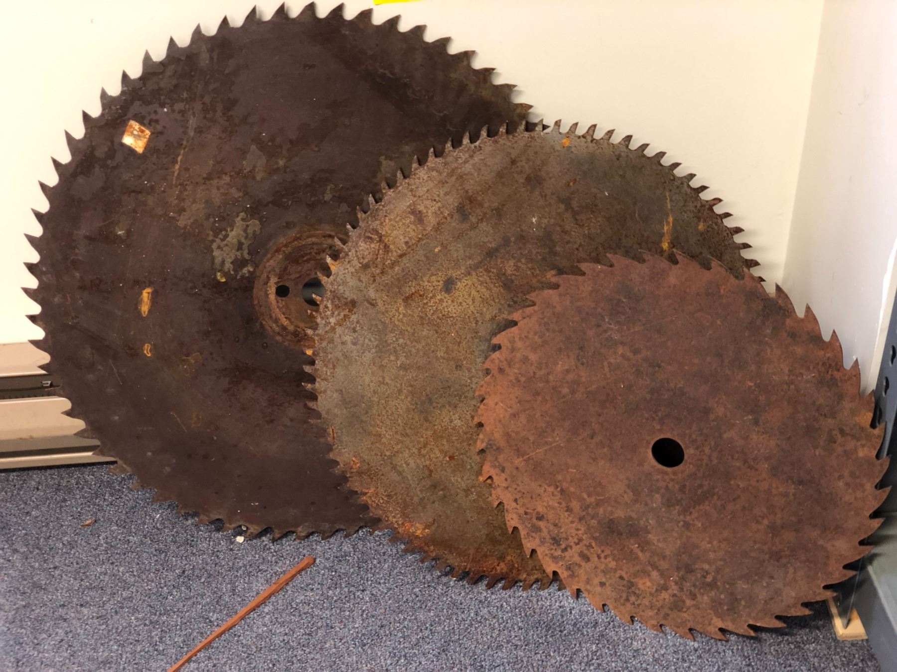 Group of 3 large vintage saw blades - 25in diameter/ 21in diameter & 17 1/2in diameter