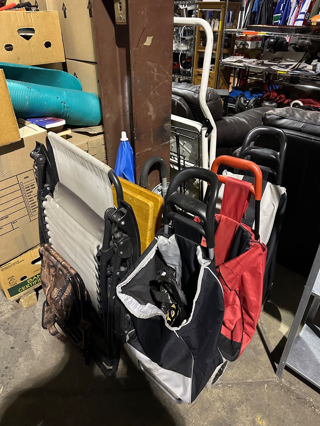 Group of 3 shopping bag cars, camping chairs, stool, TV dinner stands, canes, etc...