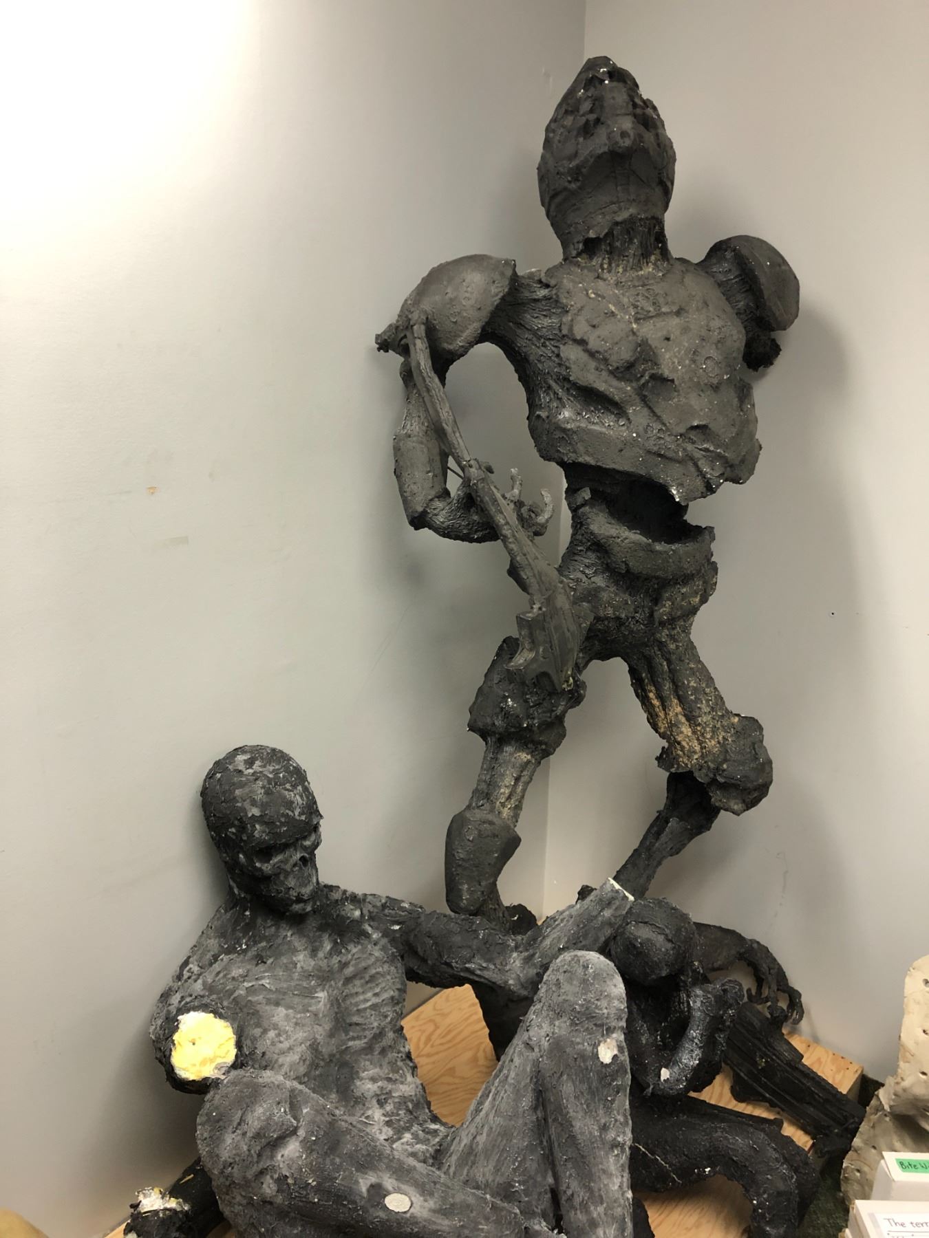 Group of 3 special effects charred/burnt Styrofoam bodies & assault weapons