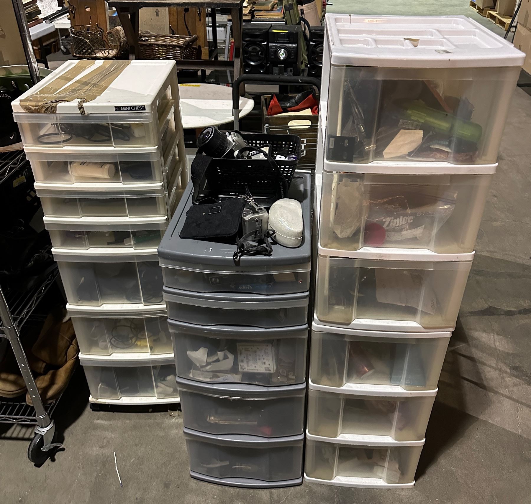 Group of 3 stand up plastic storage containers w/misc items inside - coins, remote, frames, speaker, etc...