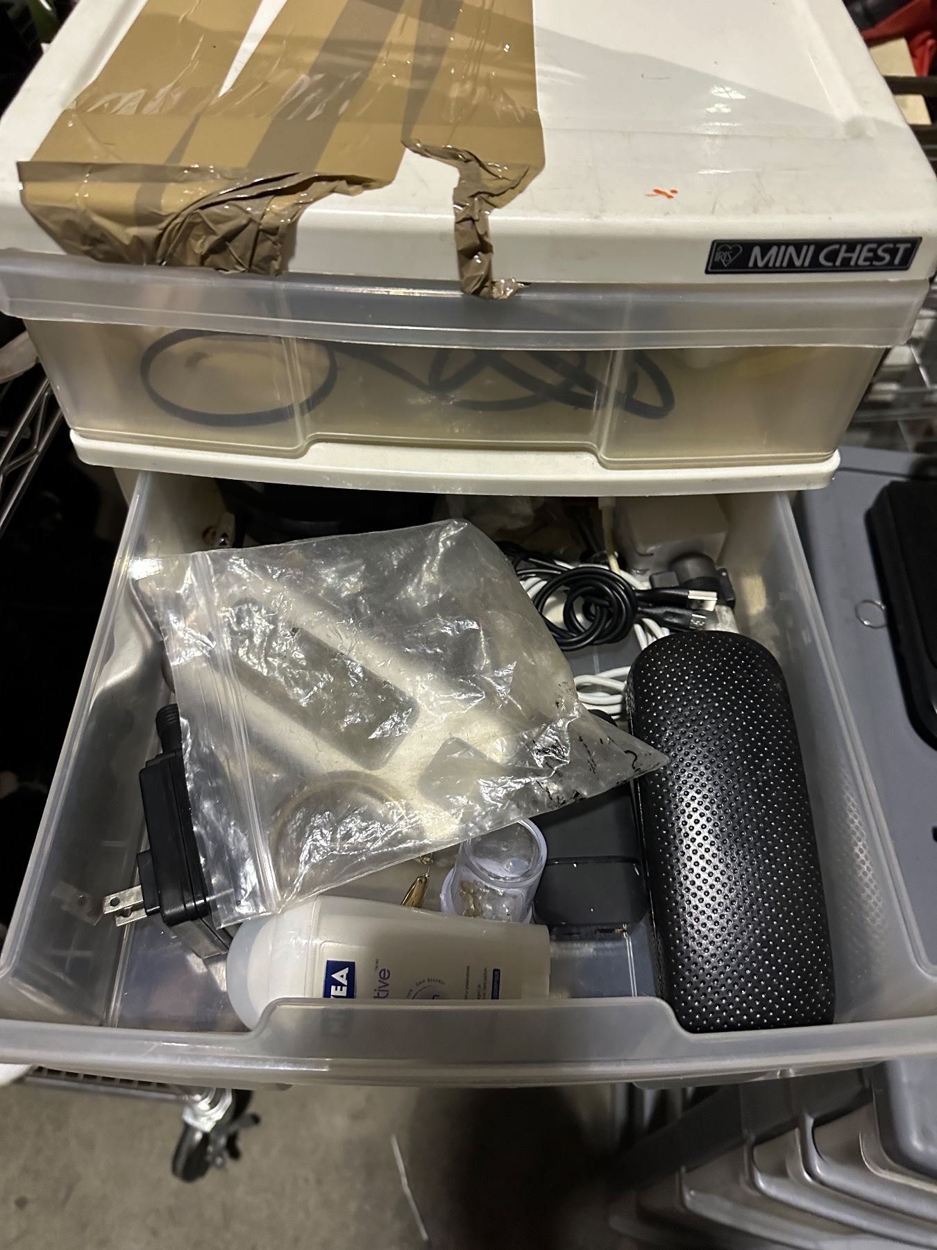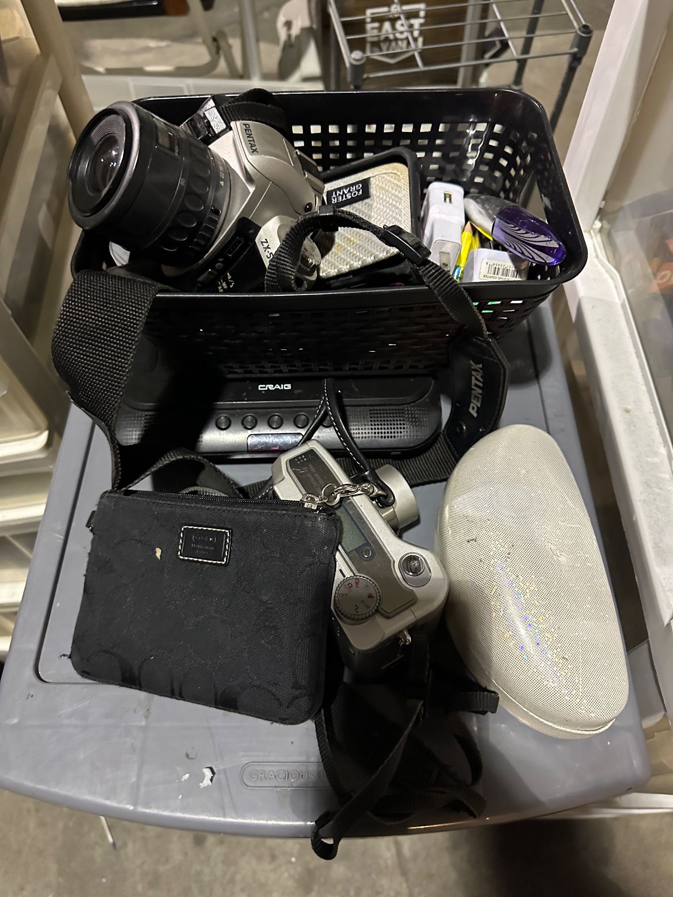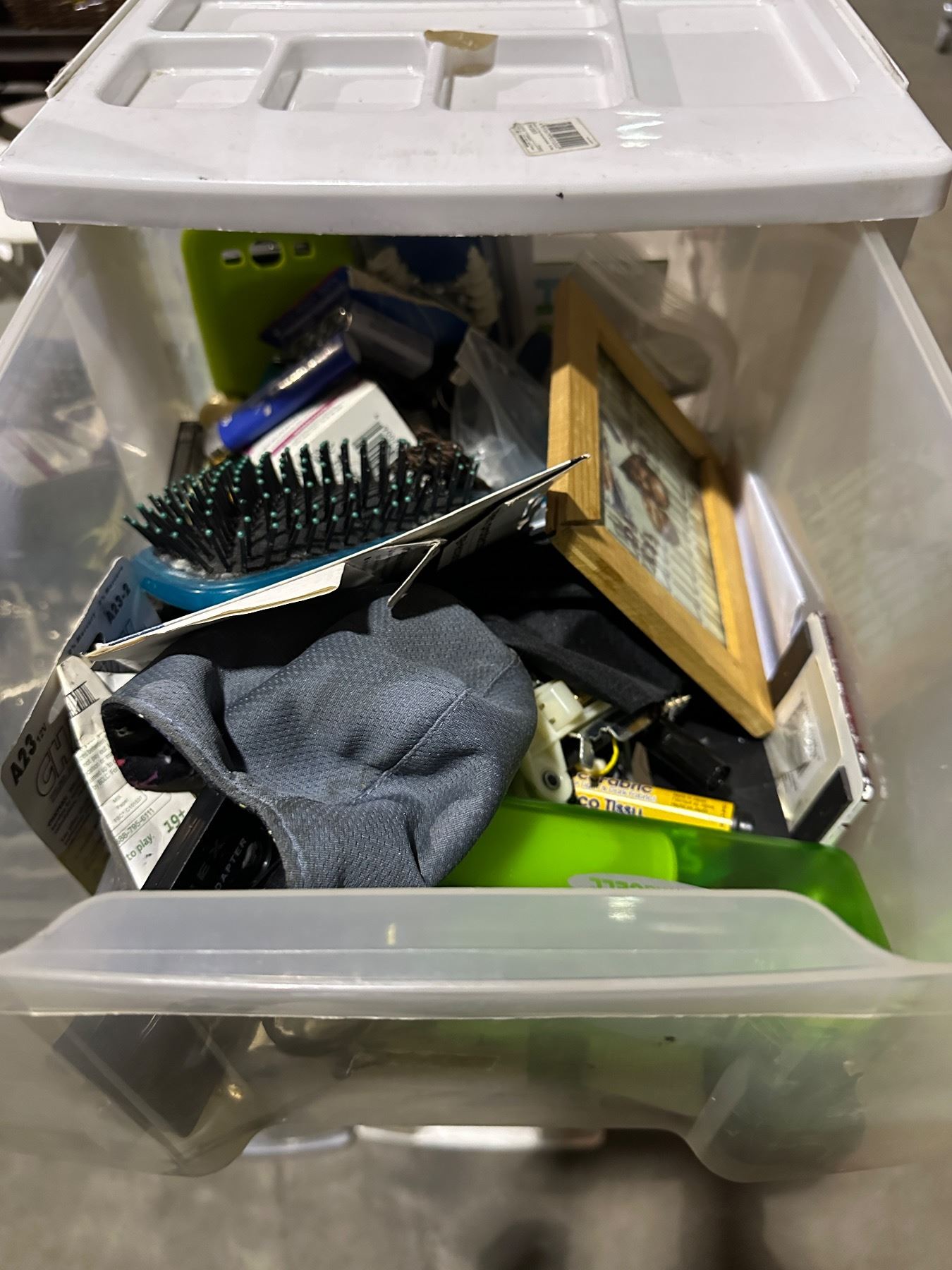 Group of 3 stand up plastic storage containers w/misc items inside - coins, remote, frames, speaker,