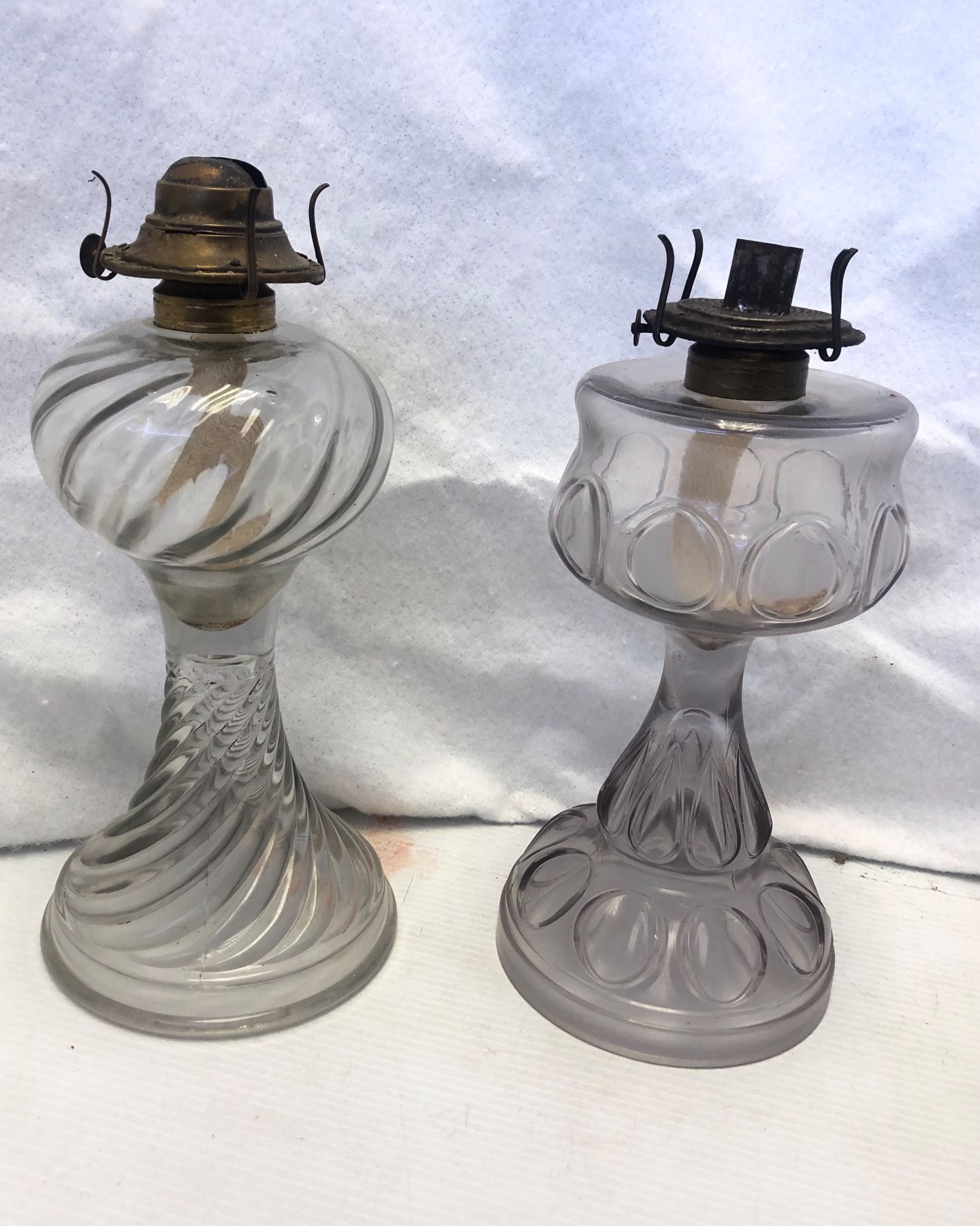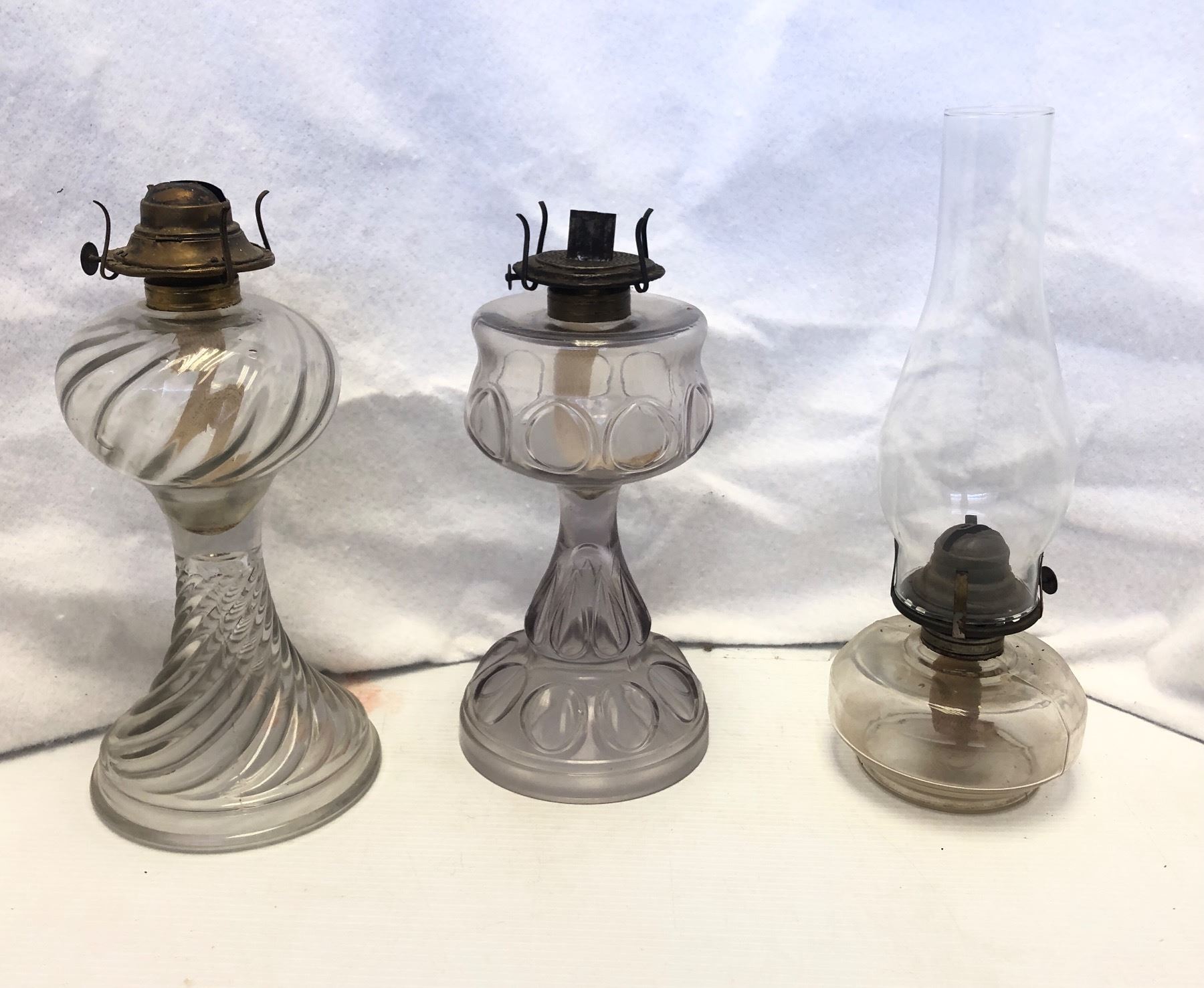 Group of 3 vintage estate clear glass kerosene oil lamps - includes ribbed glass oil lamp / lamplight farms chamber oil lamp etc