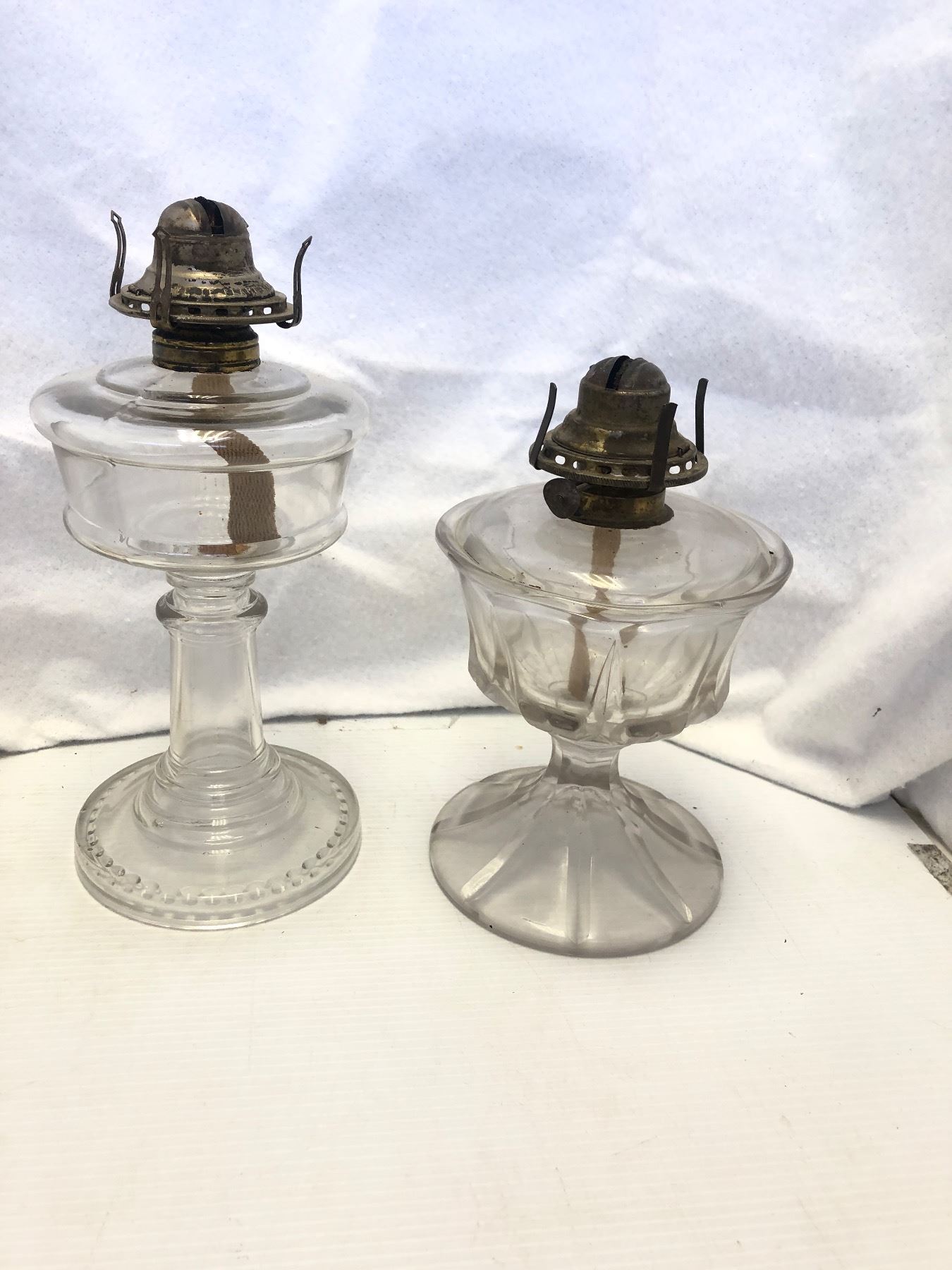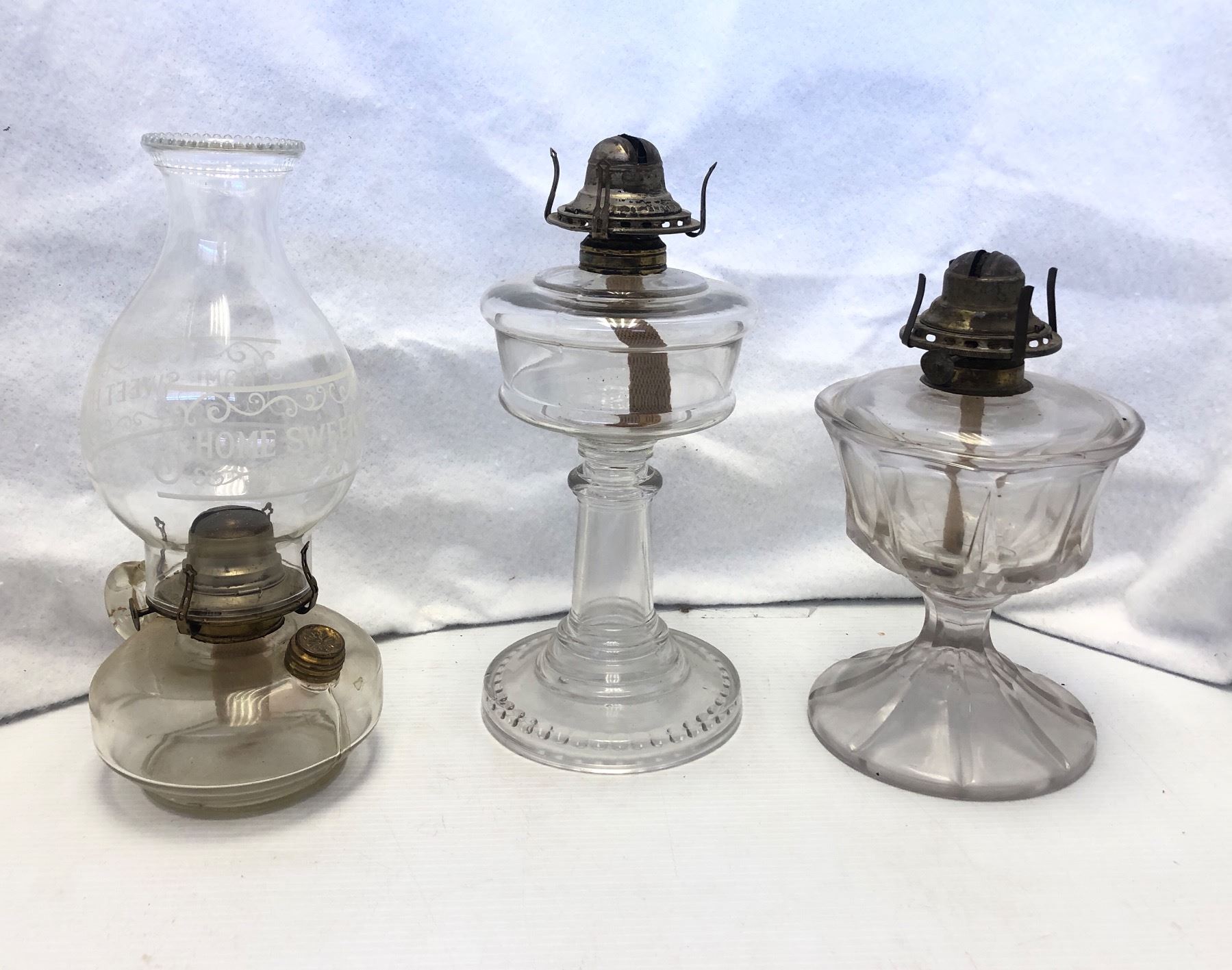 Group of 3 vintage estate clear glass kerosene oil lamps