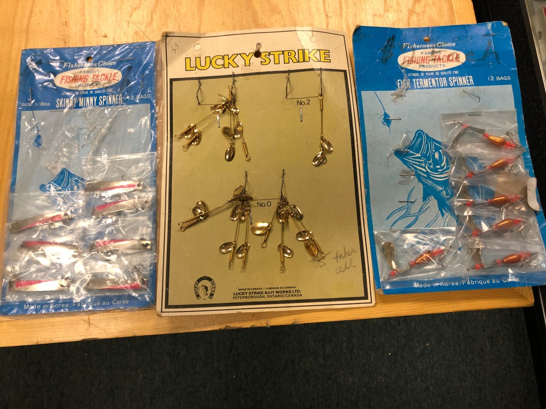 Group of 3 vintage tackle shop tackle sales displays w/ spinners - Fishermen's Choice & Lucky Strike