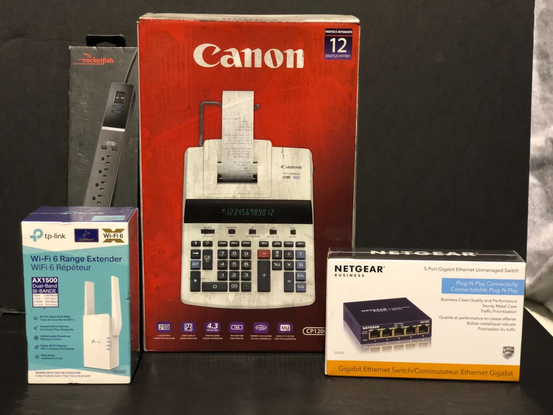 Group of 4 NEW assorted electronic items - includes CP1200DII Commercial Desktop Calculator Canon / Netgear - 5 port gigabit ethernet unmanaged switch / TP link wifi range extender AX1500