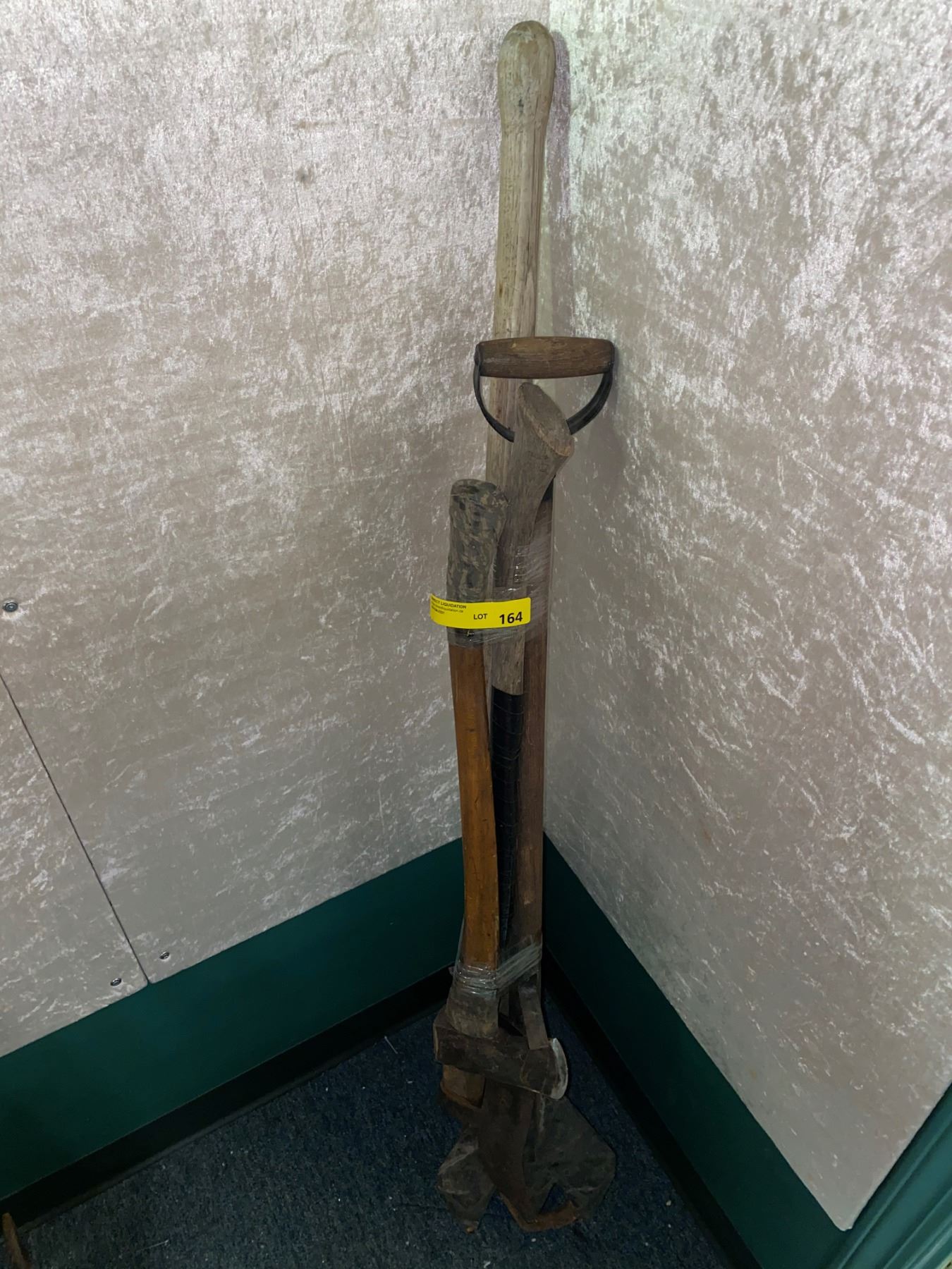 Group of 4 assorted handy yard tools older rustic log roller/axe/ etc....