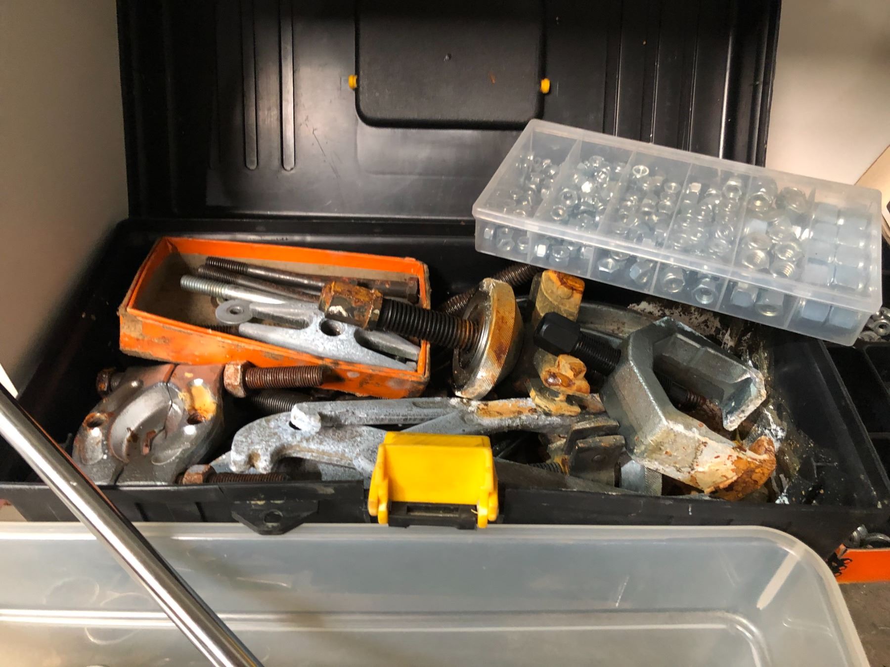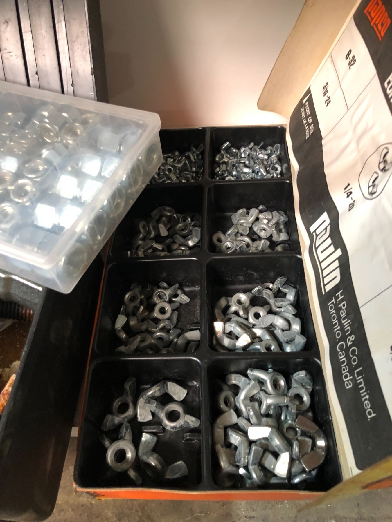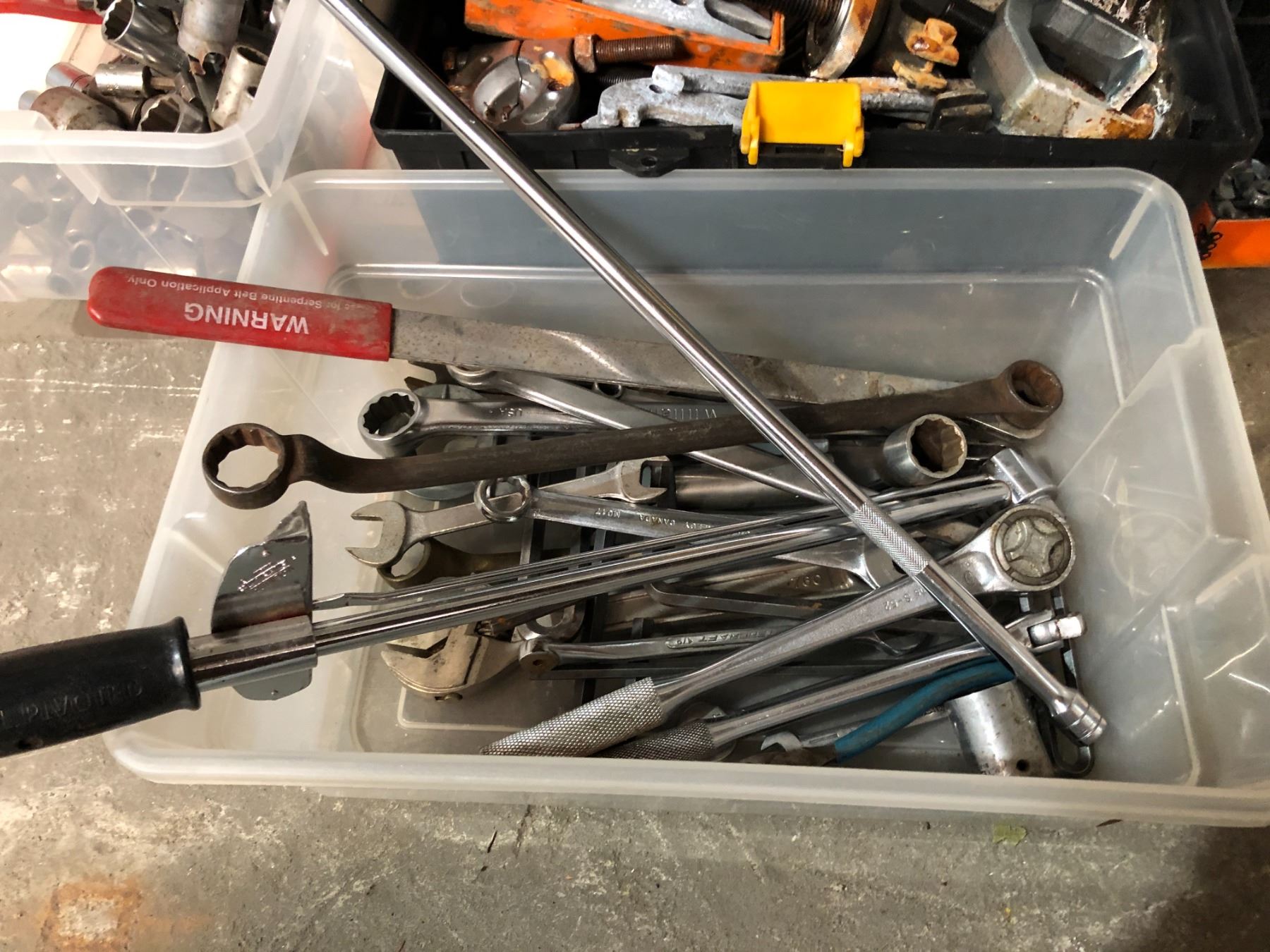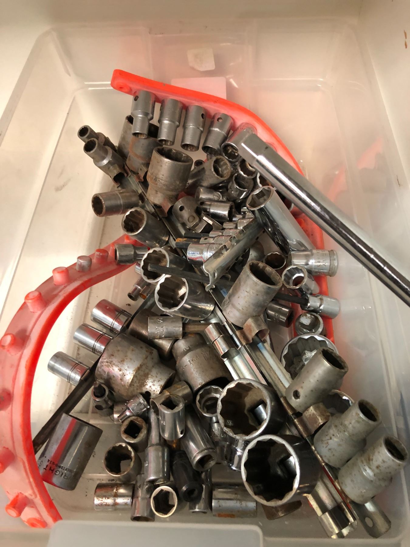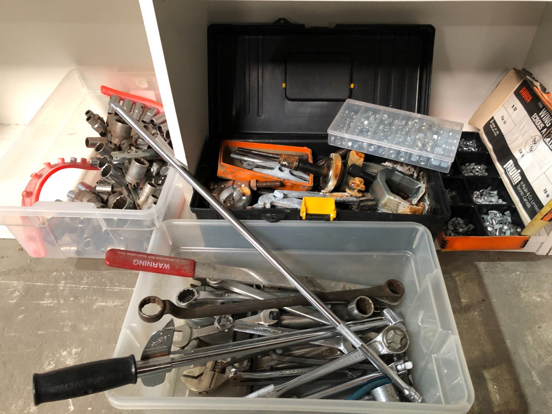 Group of 4 boxes of assorted tools - sockets/ combination wrenches/ nuts etc.