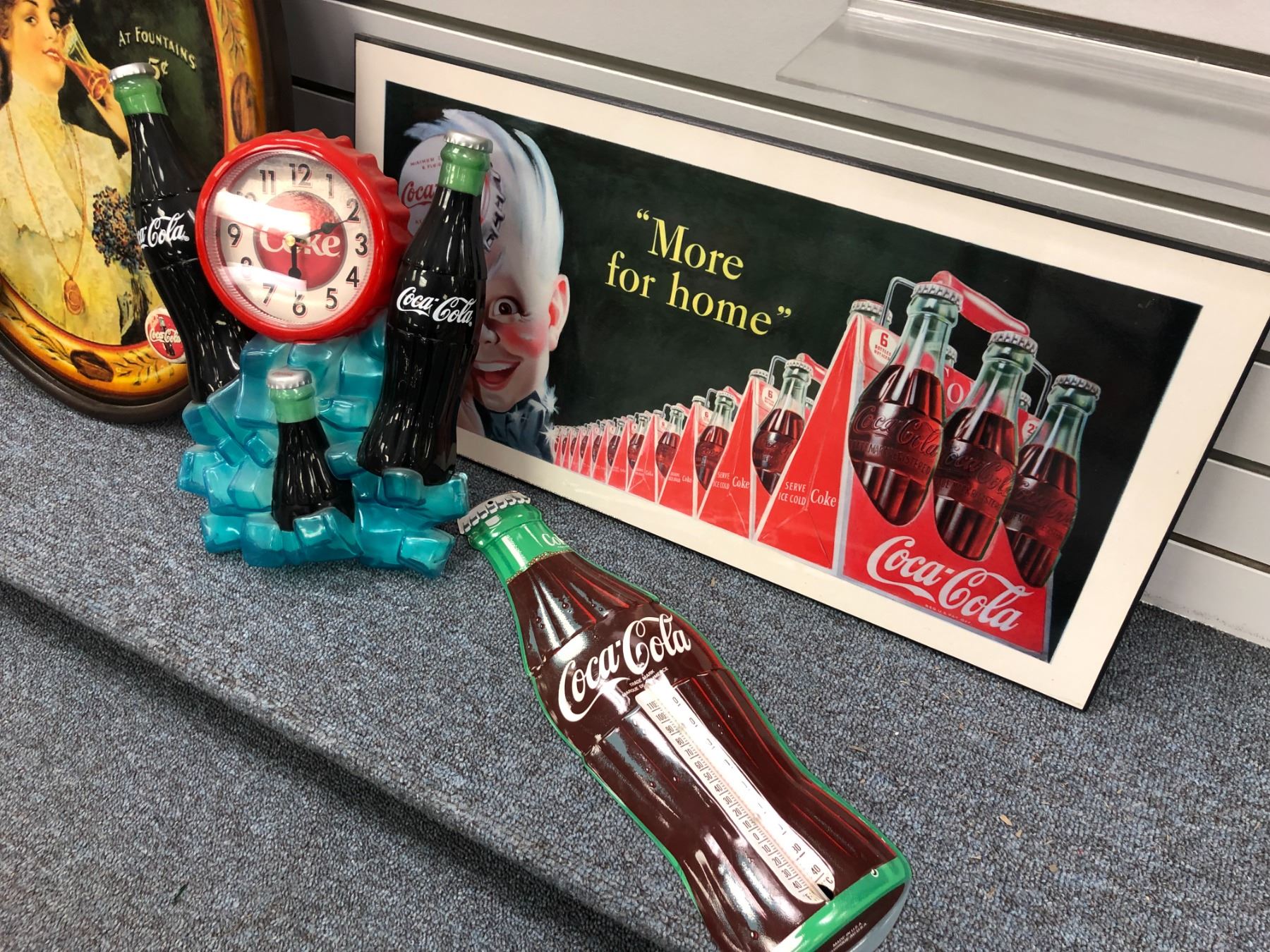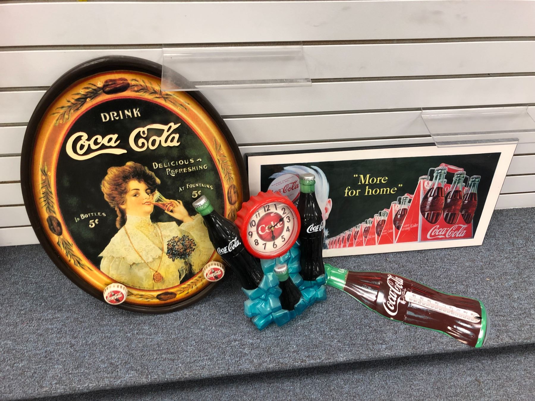 Group of 4 collectible Coca Cola memorabilia - wooden tray coat rack/ print on board Coca Cola boy/ Coca Cola wall clock & Coke bottle thermometer