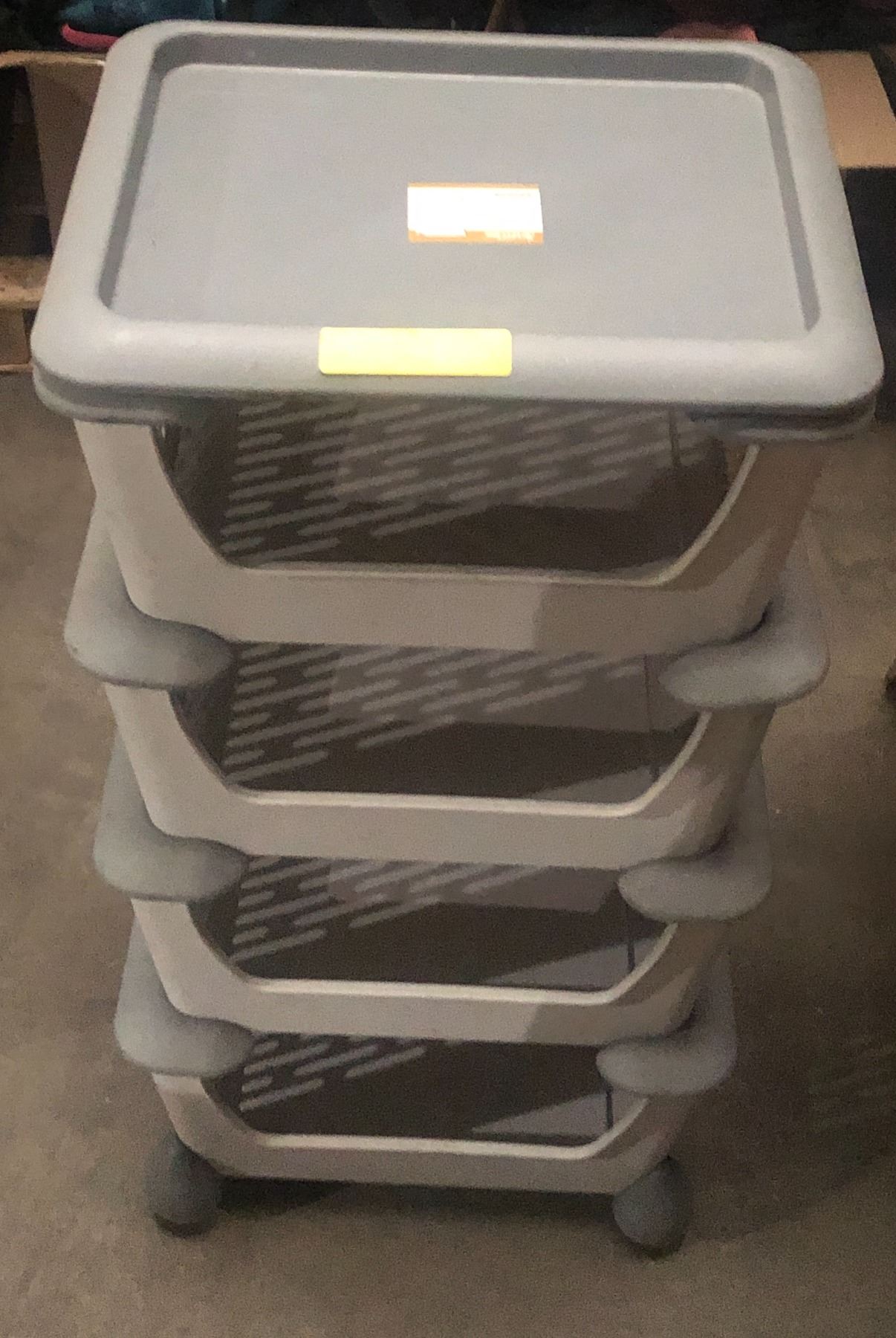 Group of 4 home-style mobile multi-shelf plastic storage