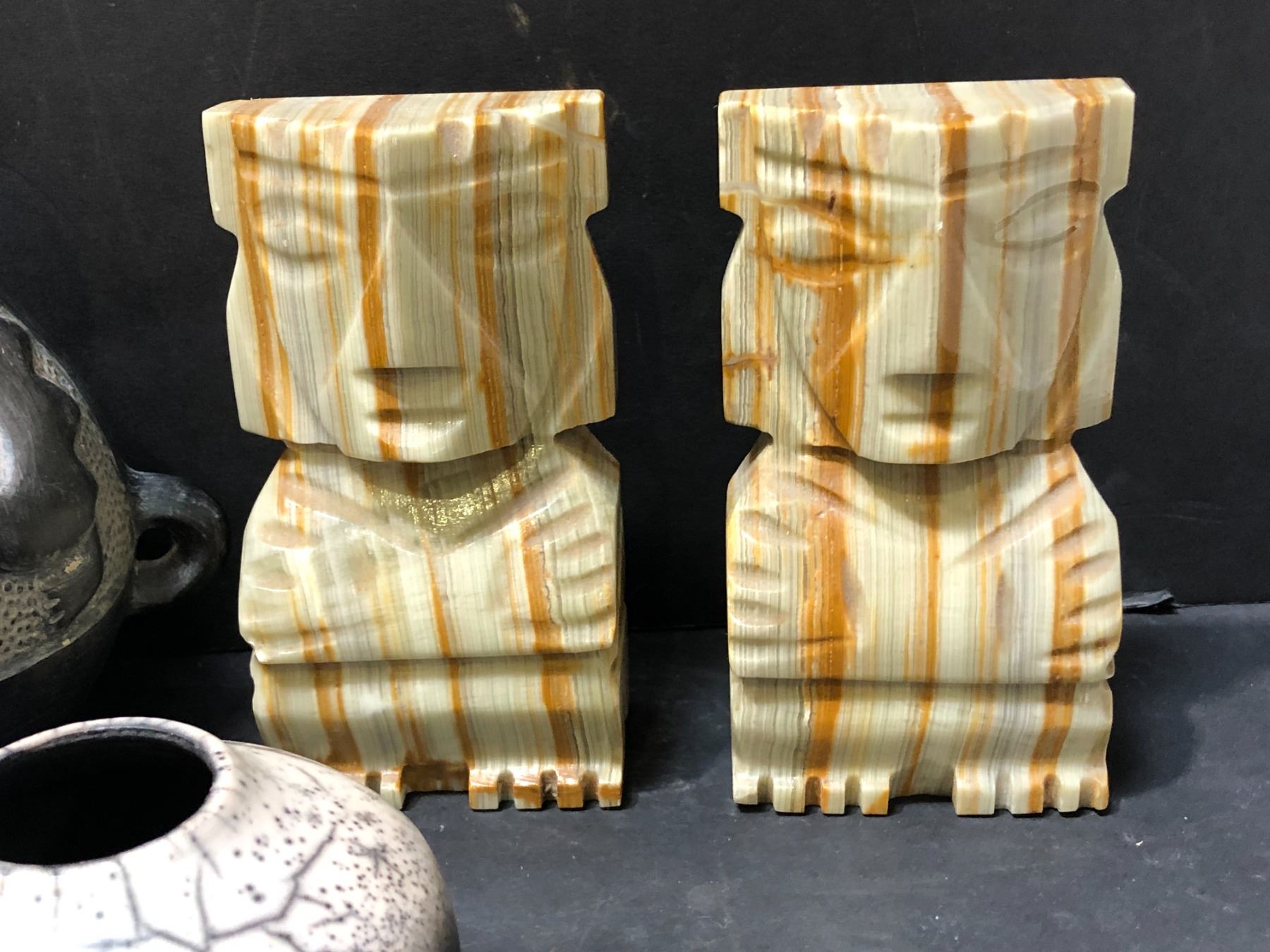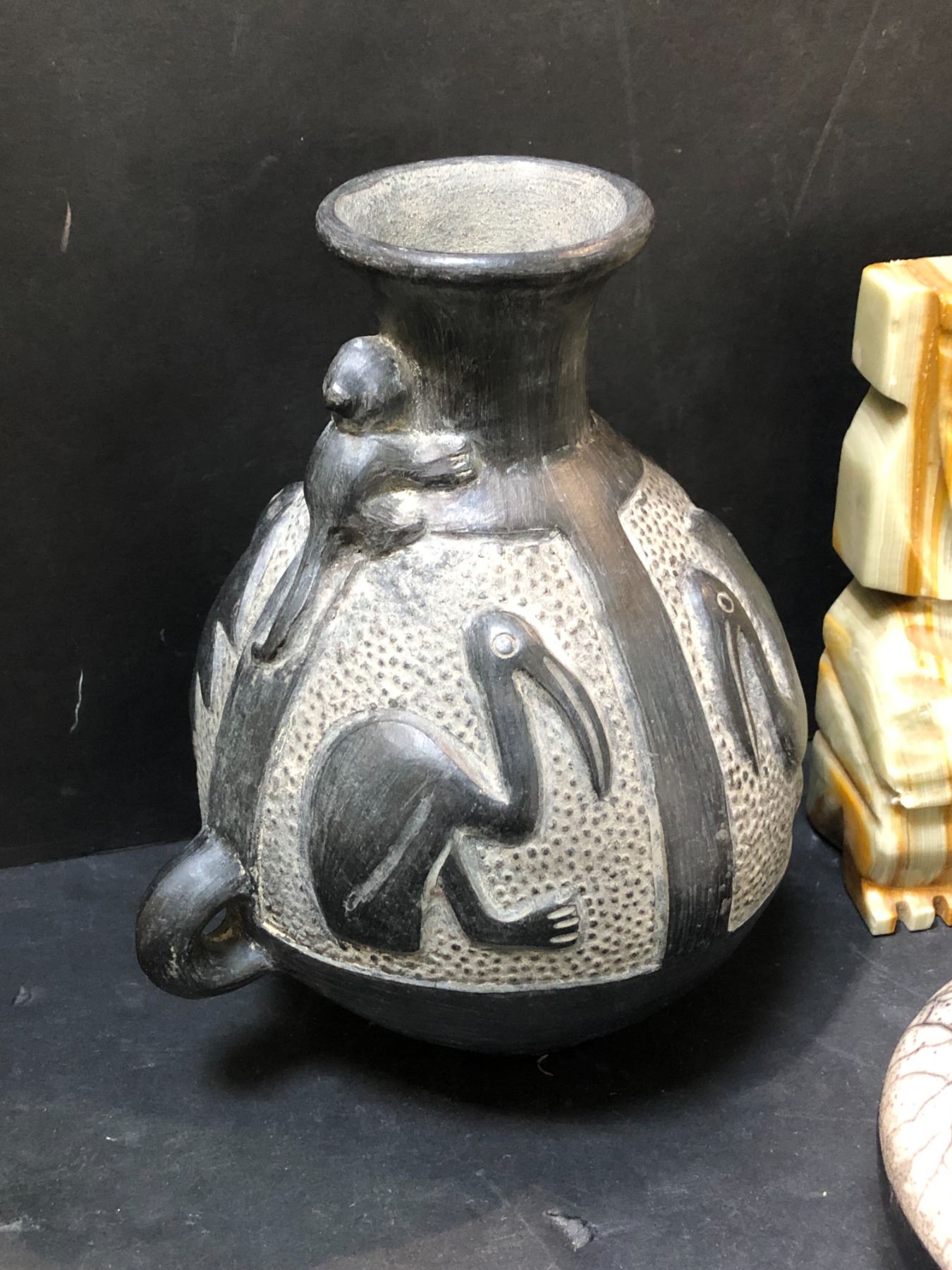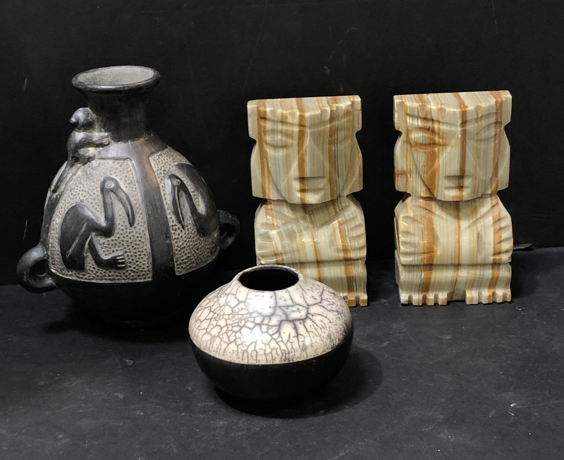 Group of 4 - includes Chimu blackware vessel w/ pelicans & monkeys / Raku vase etc