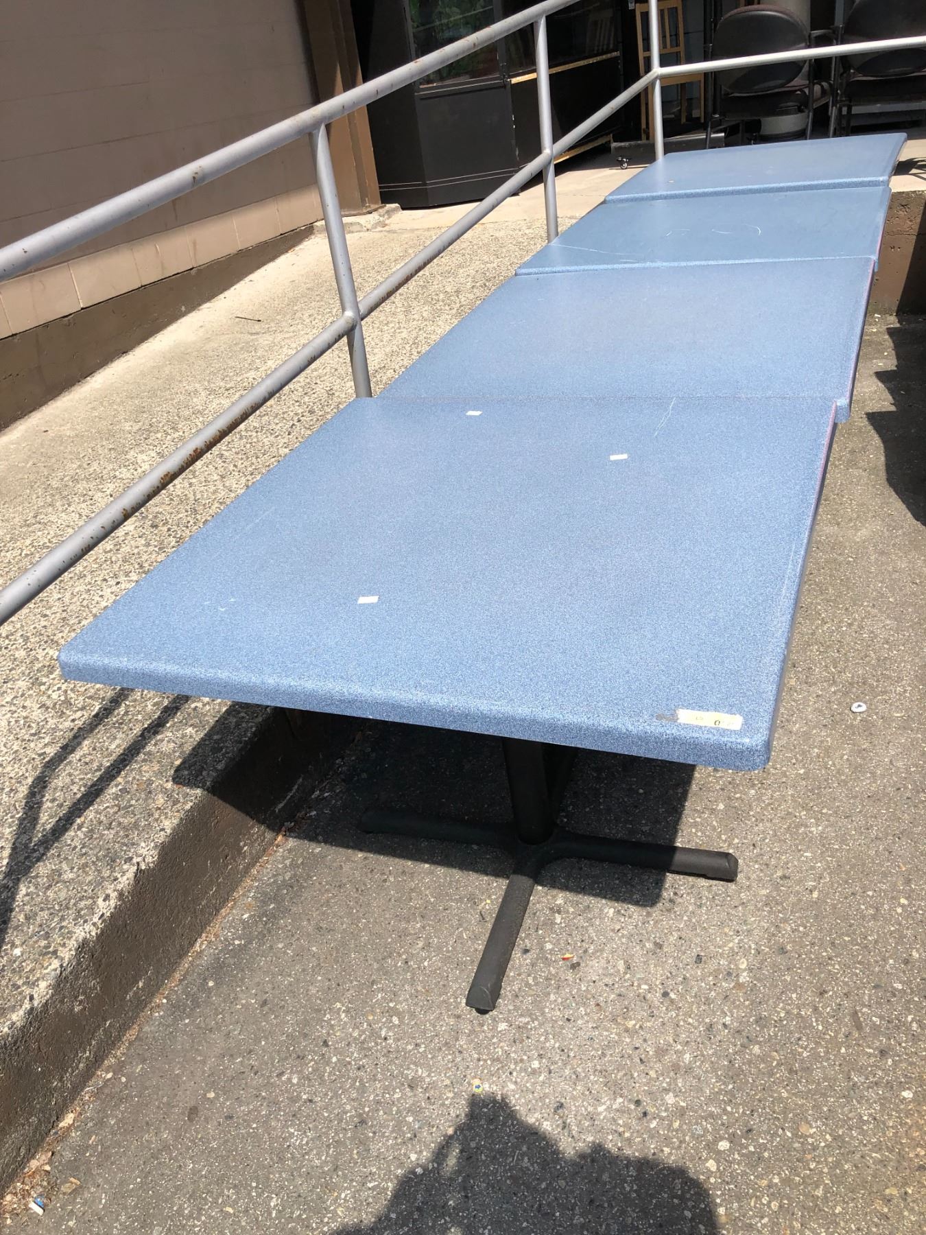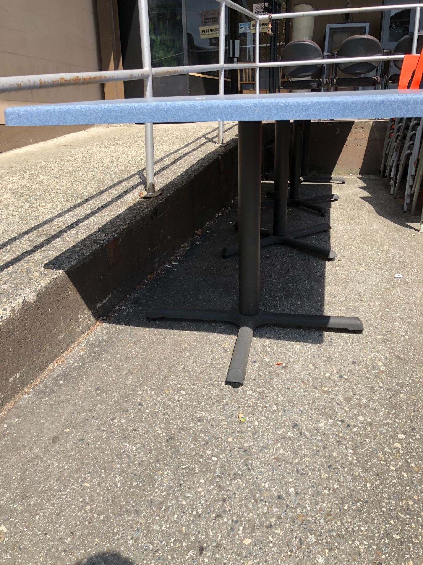 Group of 4 outdoor tables blue fibre glass w/black metal single pedestal bases heavy duty