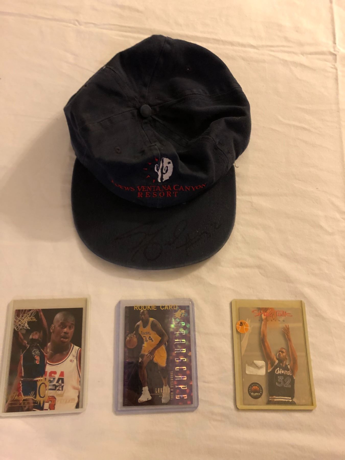 Group of 4 pcs. Shaquille O' Neal memorabilia - 3 trading cards including 1 rookie & signed ball cap