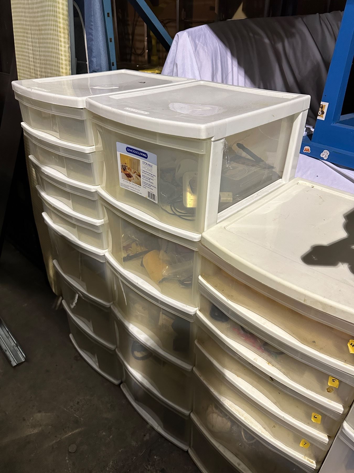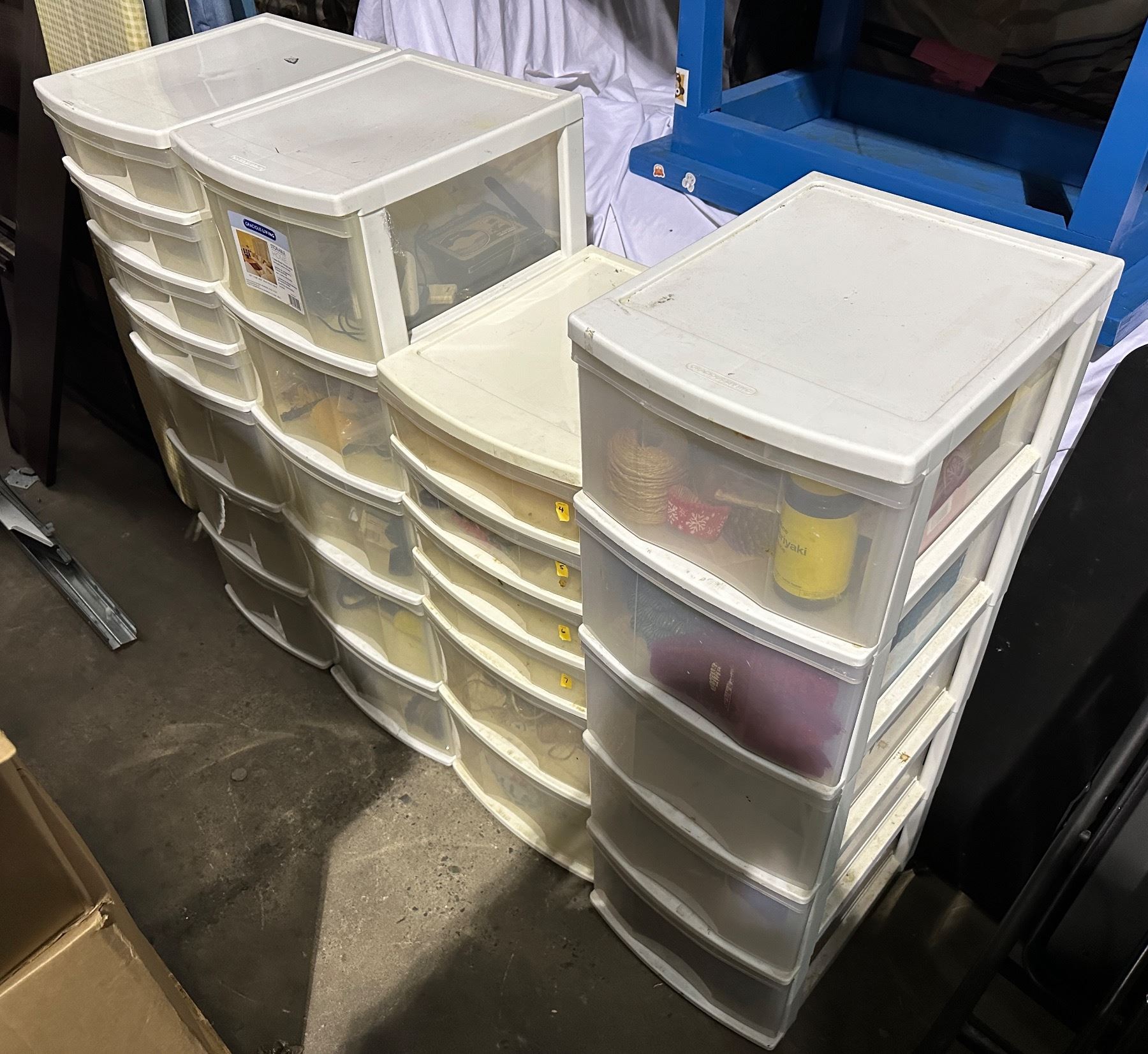 Group of 4 standup plastic storage containers w/misc items inside