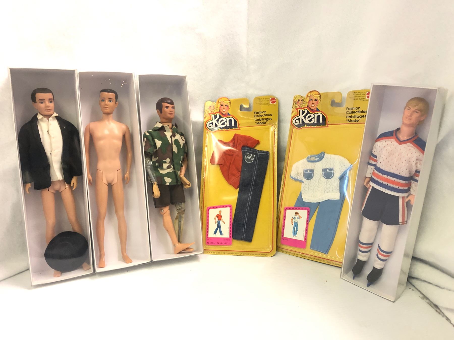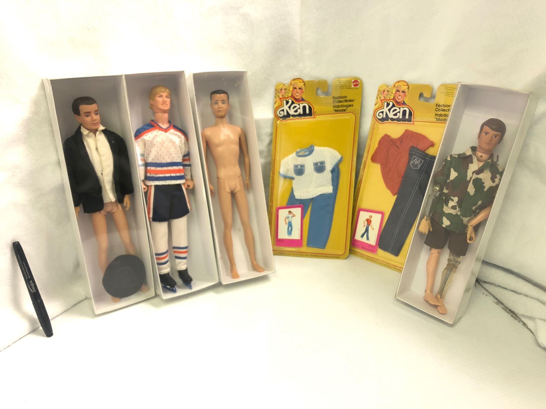 Group of 4 vintage dolls w/ 2 fashion collectibles pcs - includes Wayne Gretzky oilers action figure / 1975 Hasbro G.I. Joe Mike Powers atomic man action figure / Ken in tuxedo (missing pants) etc