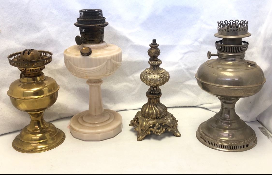 Group of 4 vintage estate kerosene oil lamps - includes brass lanterns etc