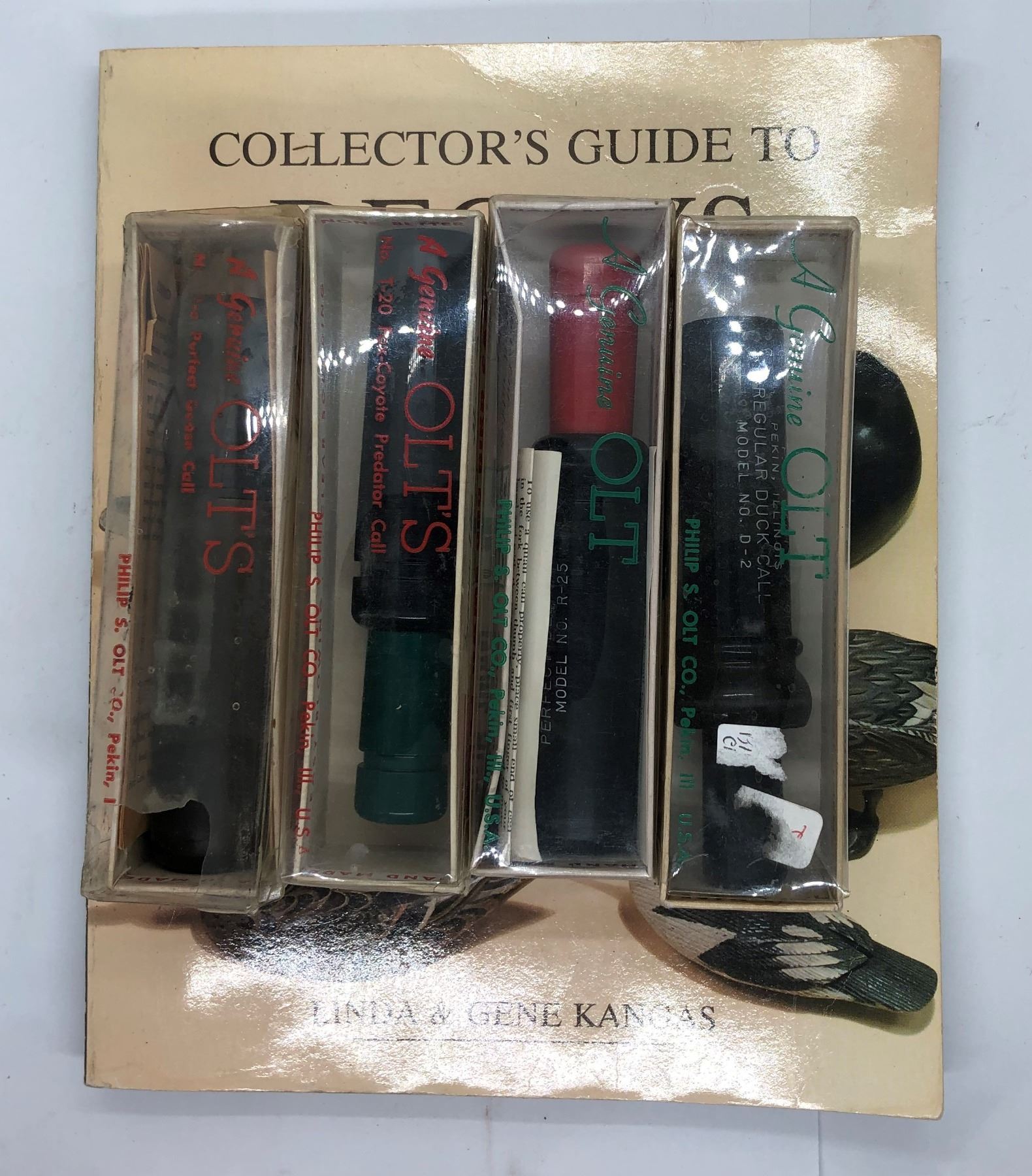 Group of 4 vintage game & bird calls and collector's guide to decoys